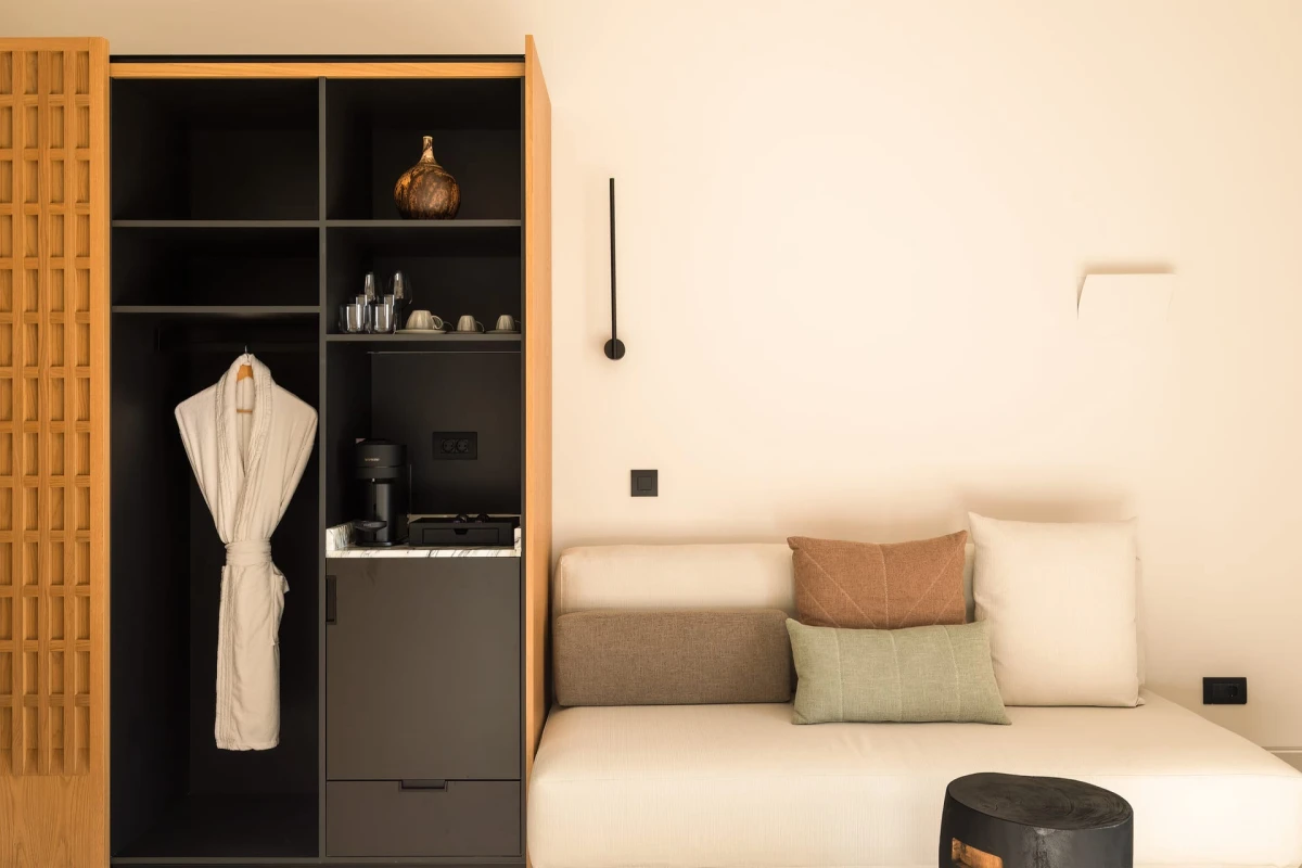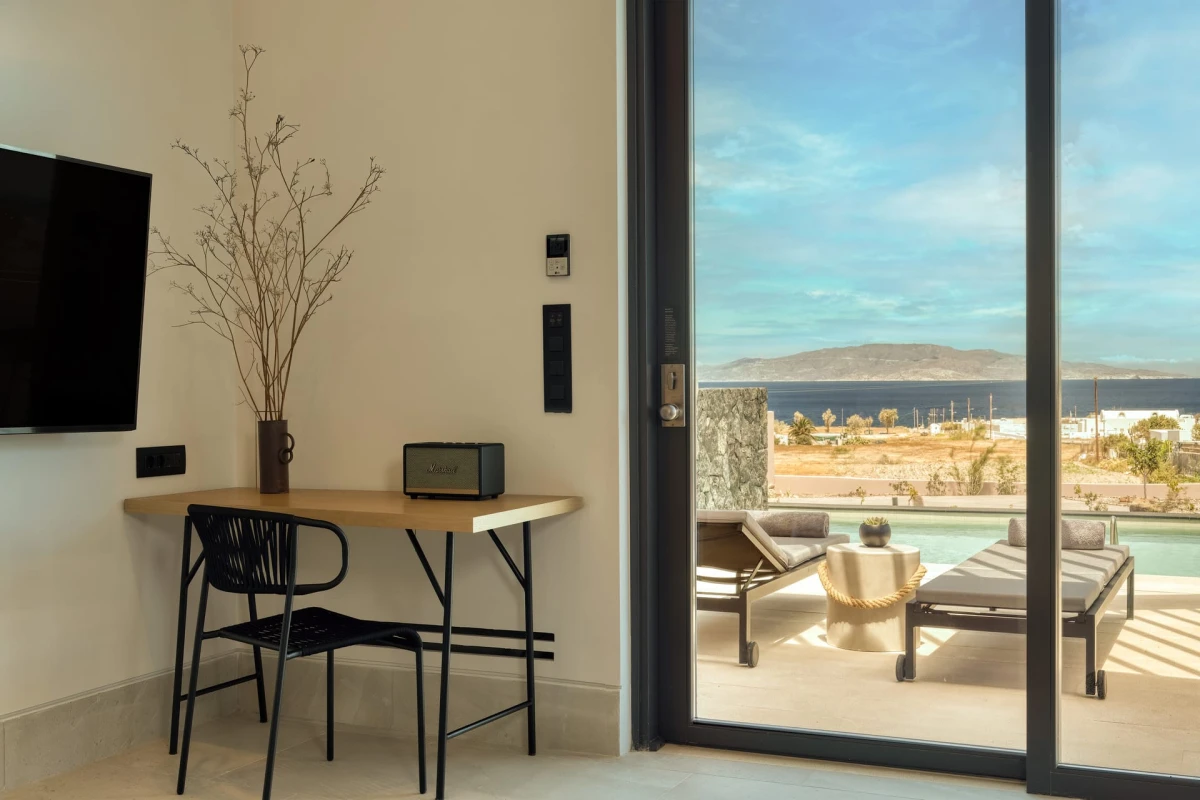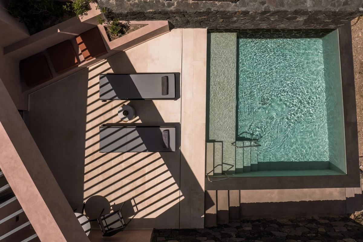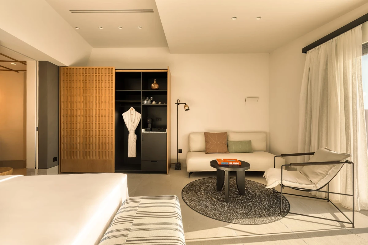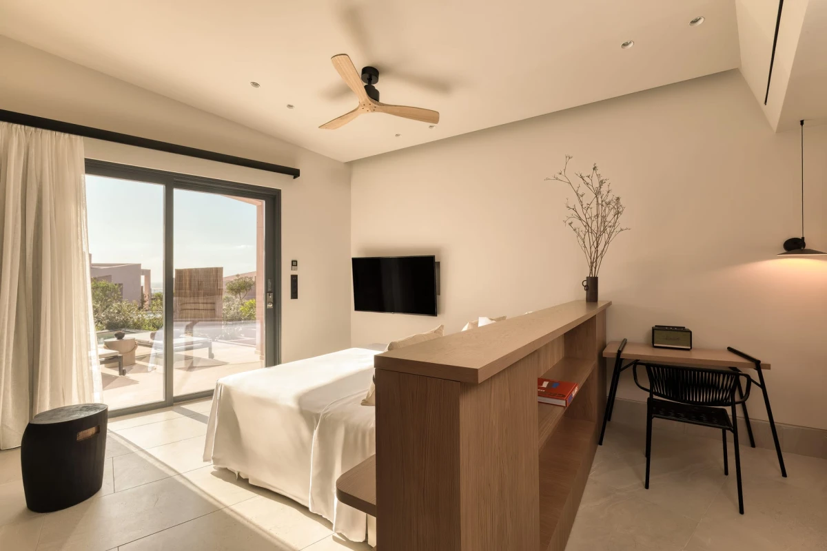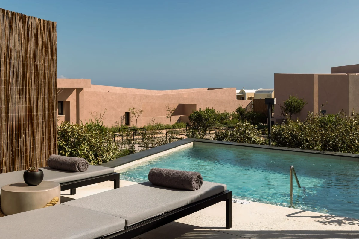 Each bungalow and villa features a private pool, blending sleek design with natural stone and whitewashed accents to frame mesmerizing sea views. Spacious interiors with modern furnishings create a tranquil retreat, complemented by private terraces perfect for savouring the island's golden light. The resort's open layout, rare for Santorini, ensures a sense of airy comfort.