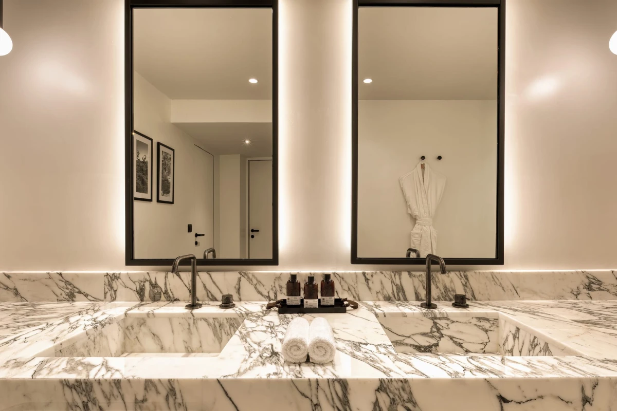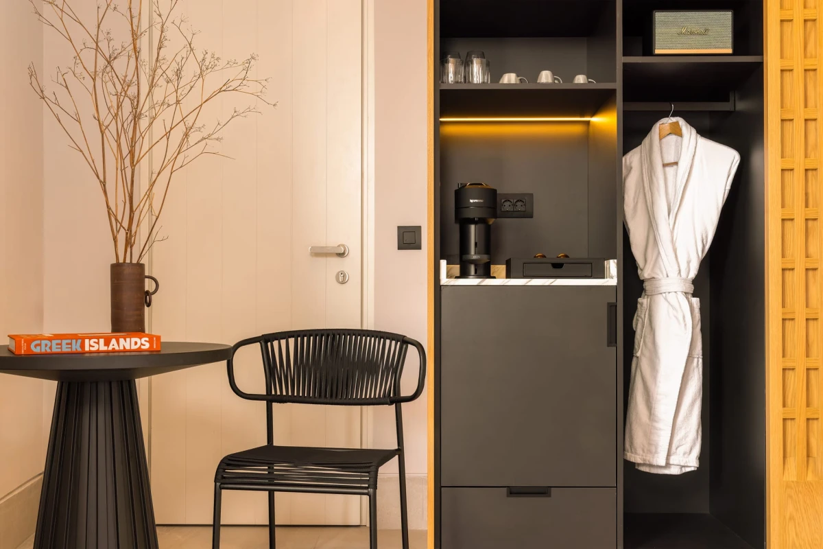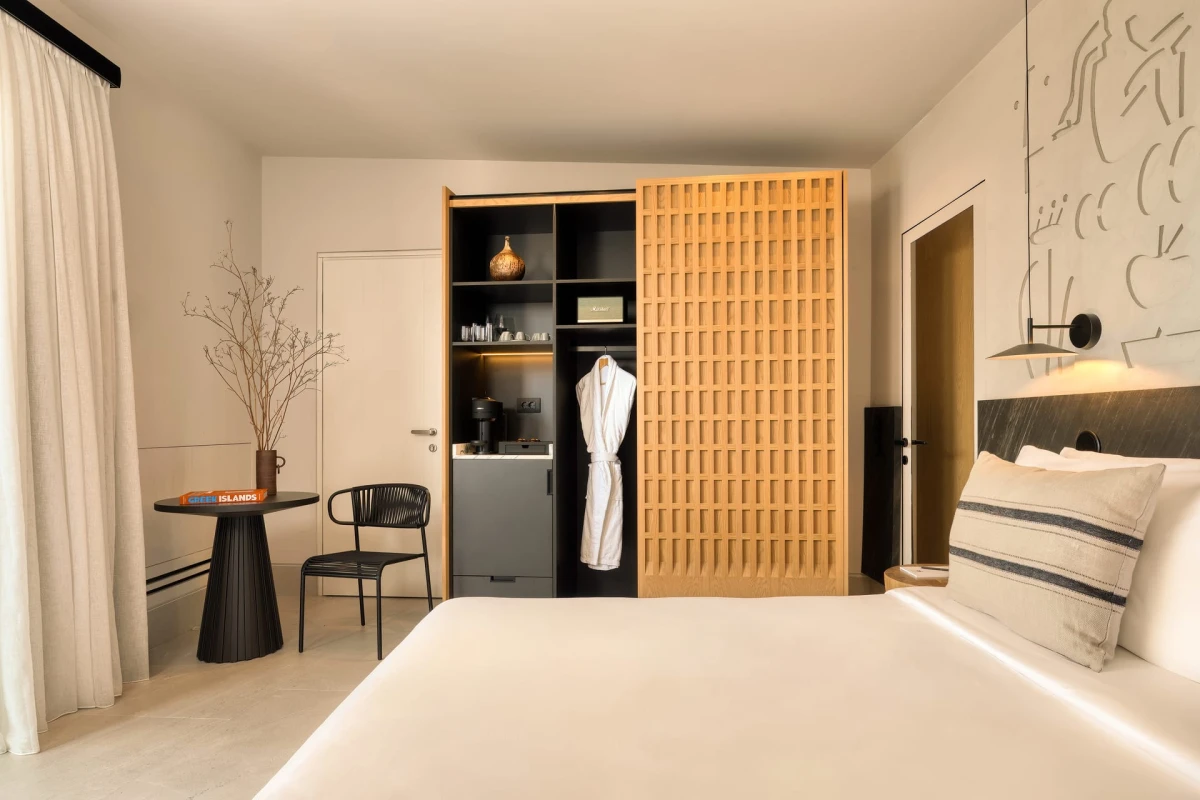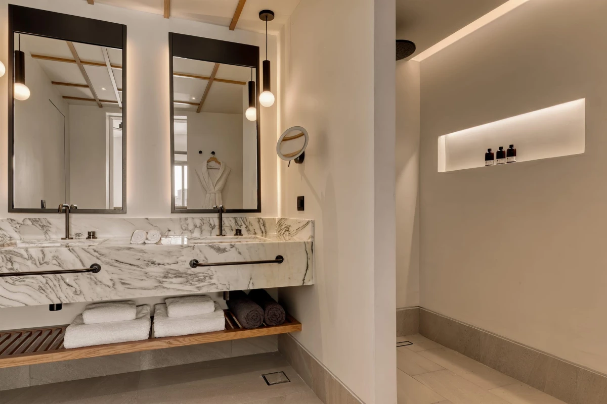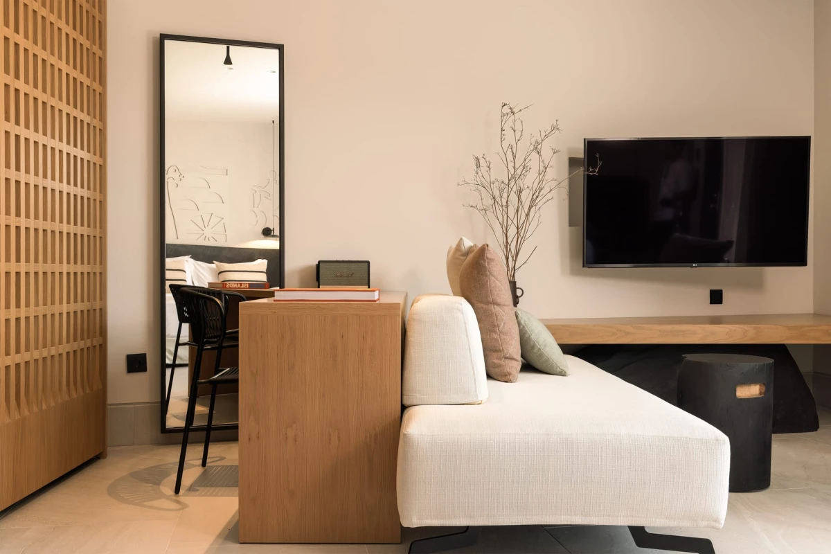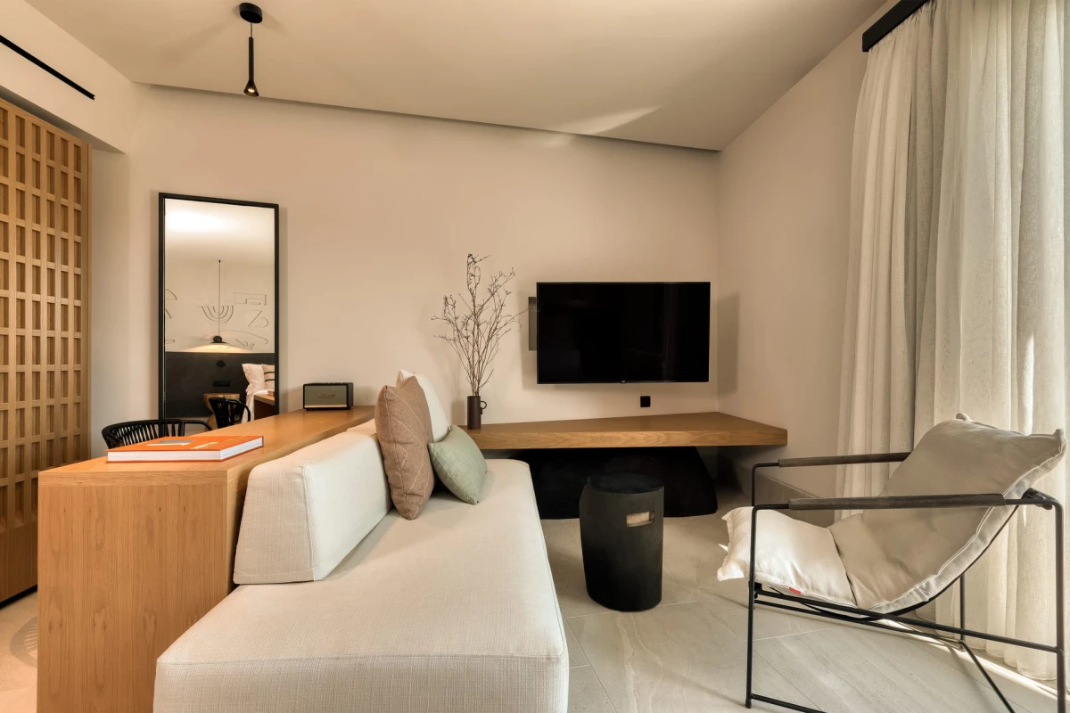 Each bungalow and villa features a private pool, blending sleek design with natural stone and whitewashed accents to frame mesmerizing sea views. Spacious interiors with modern furnishings create a tranquil retreat, complemented by private terraces perfect for savouring the island's golden light. The resort's open layout, rare for Santorini, ensures a sense of airy comfort.