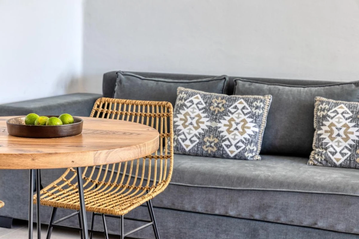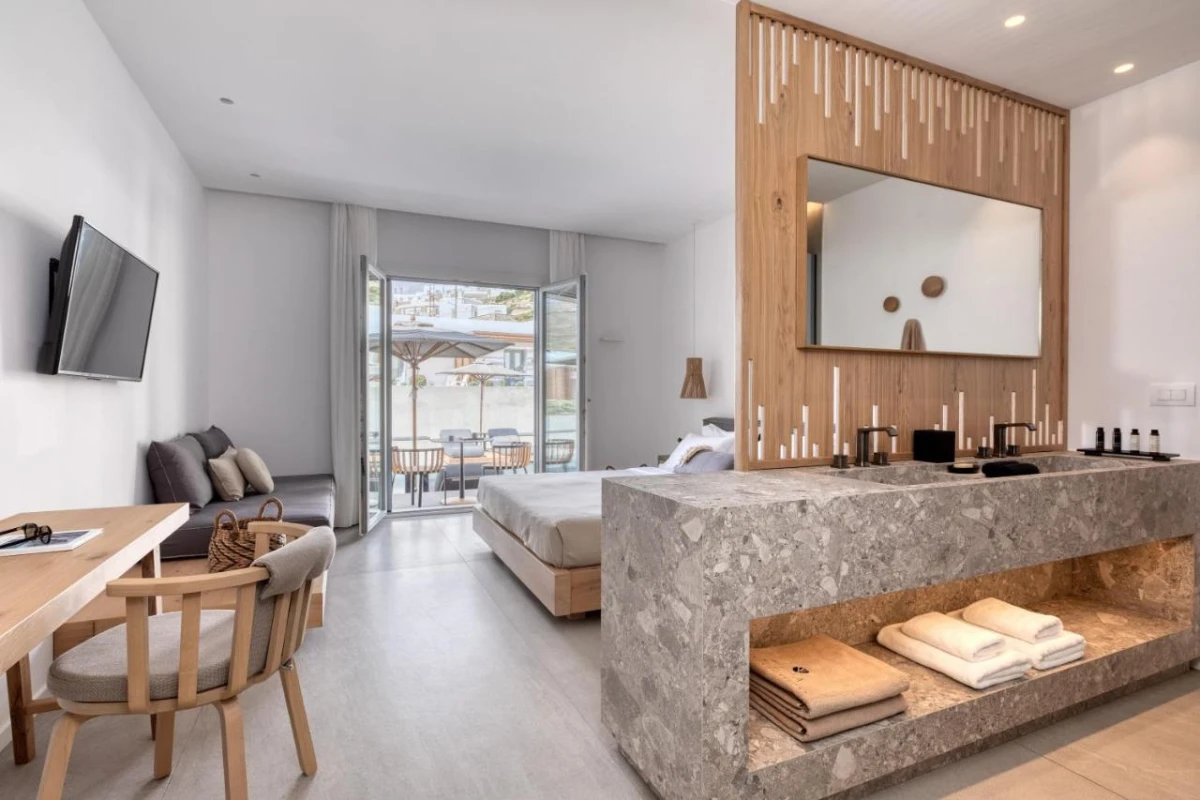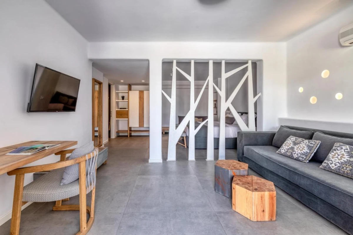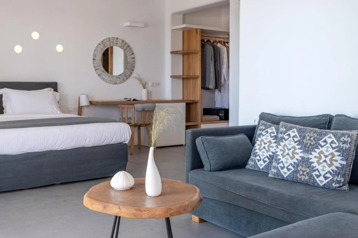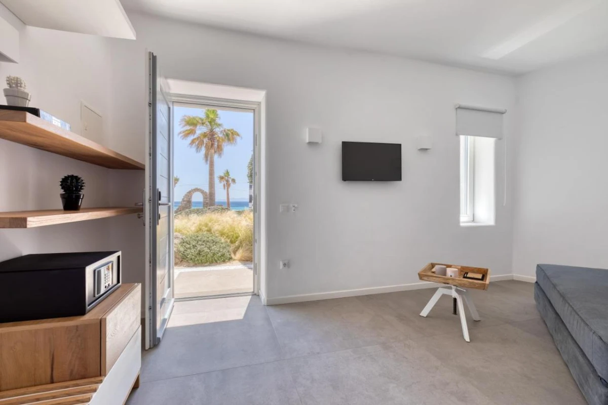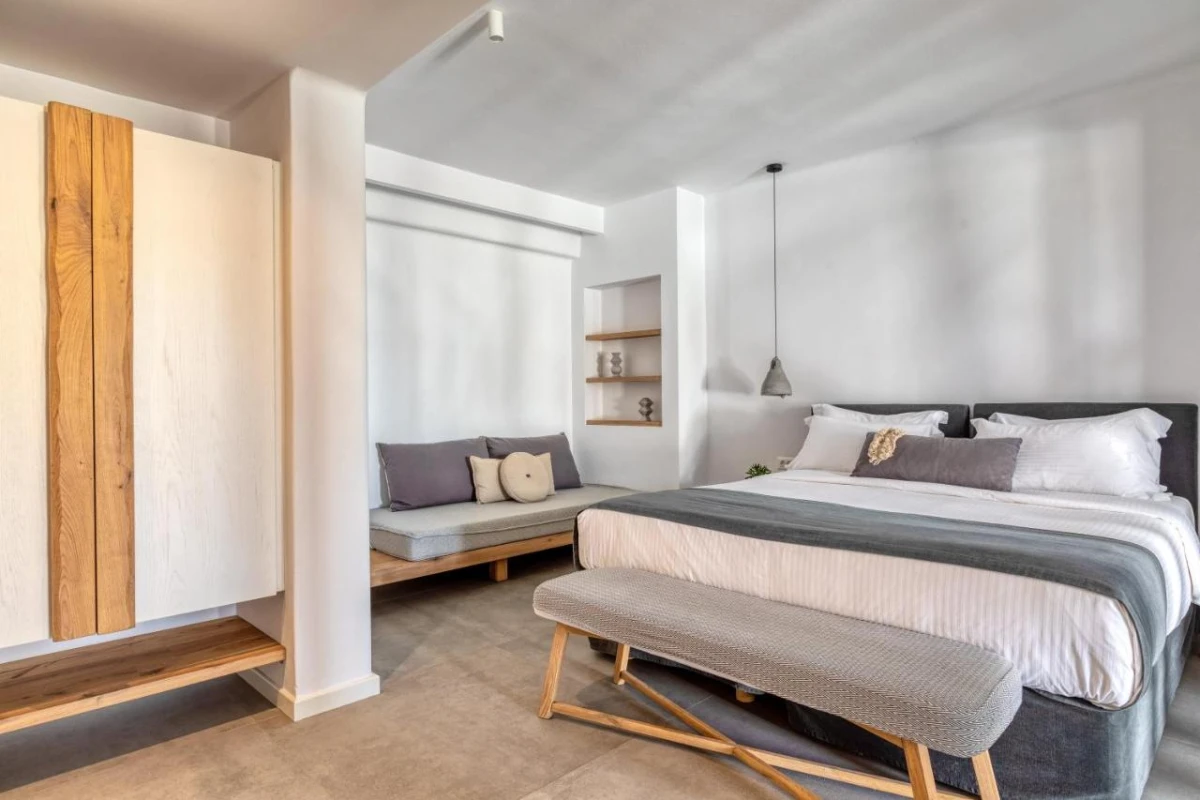 The 35 rooms and suites, each uniquely designed, blend tiled floors and beamed ceilings with modern comforts like air conditioning, minibars, and flat-screen TVs. Private balconies open to sweeping Aegean Sea or garden views, where palm and olive trees sway gently. Select suites feature well-equipped kitchenettes and spacious seating areas for added ease. The wellness centre invites relaxation with a serene swimming pool, professional spa therapies, and a well-appointed gym, while complimentary sunbeds and beach towels enhance lazy days on the private white-sand beach.