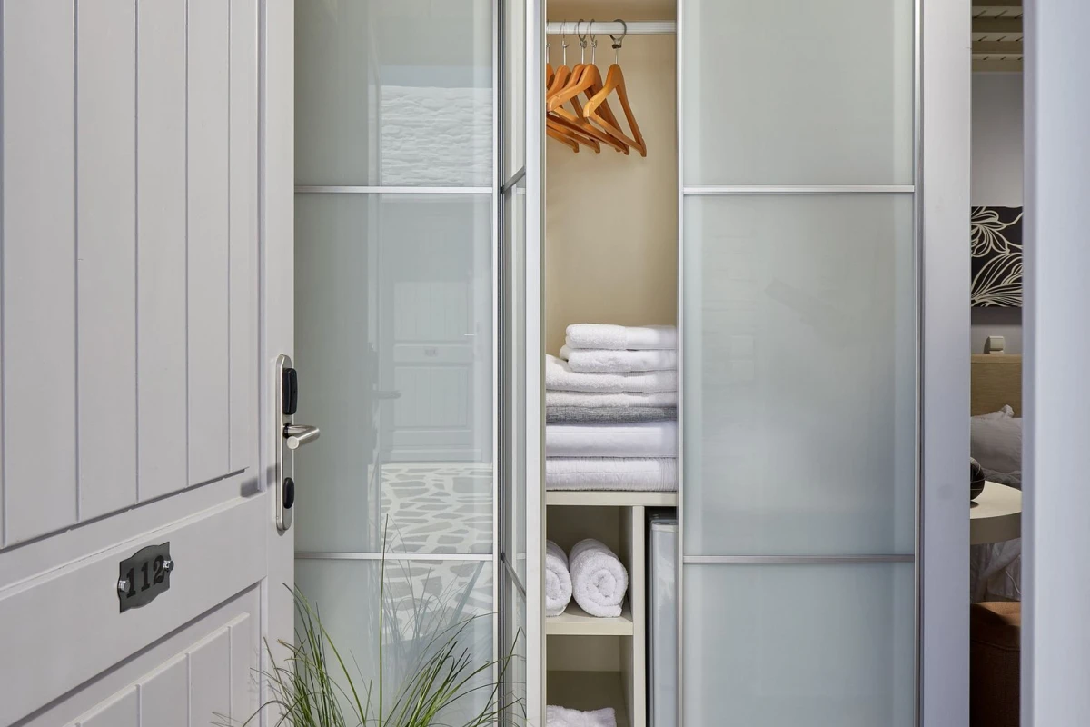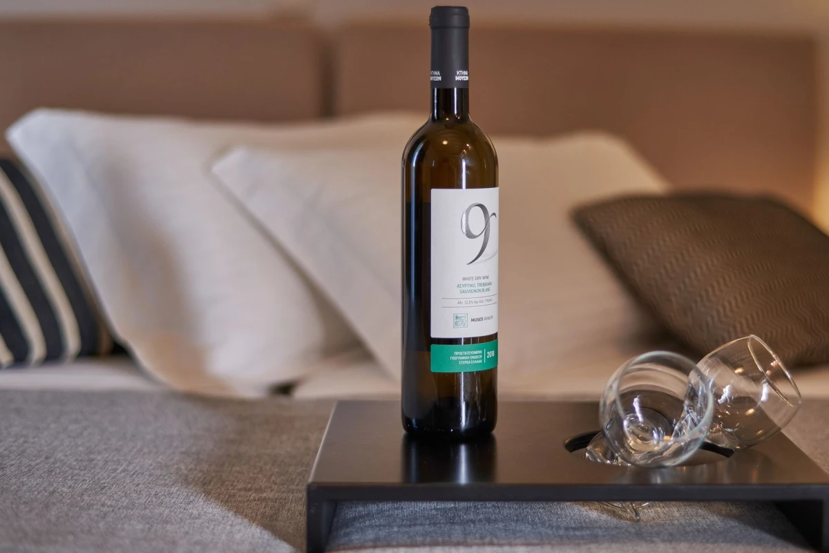 The 40 rooms unfold with serene sophistication, featuring air-conditioned comfort, flat-screen TVs, kettles, safes, wardrobes, minibars, and private bathrooms with showers, plush bathrobes, slippers, and premium toiletries. Whitewashed walls and azure accents echo Naxos' architectural soul.