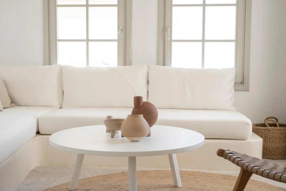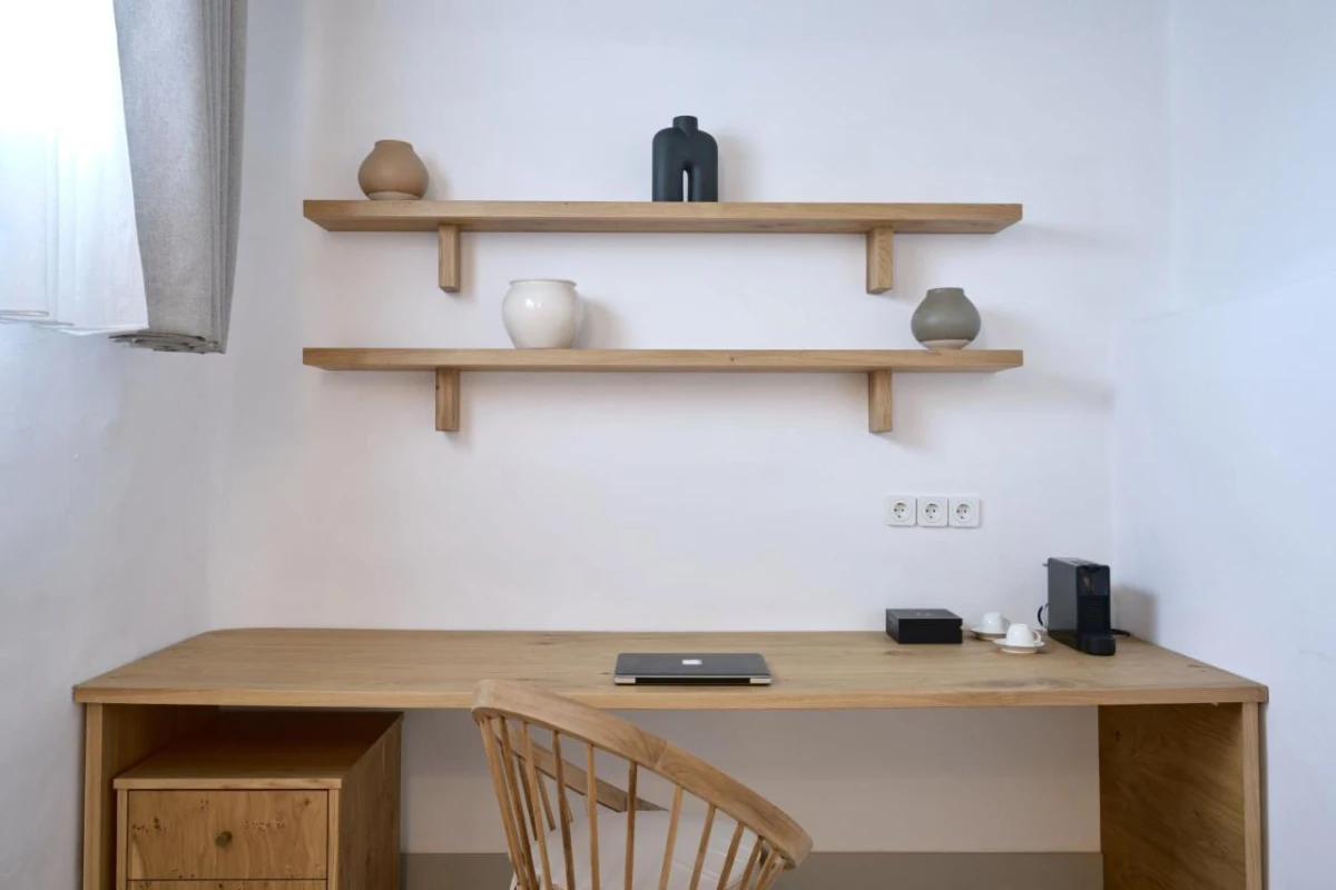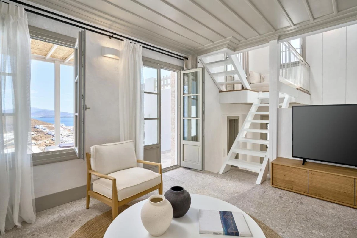 The four exclusive residences, adorned with premium fabrics and natural materials, feature air-conditioned comfort, flat-screen TVs with streaming services, and fully equipped kitchenettes with ovens, toasters, fridges, and coffee machines. Private bathrooms pamper with walk-in showers, plush bathrobes, and slippers. Each suite opens to a balcony or terrace, revealing stunning views of the Aegean Sea, Chora's whitewashed beauty, and Gouerini Castle.