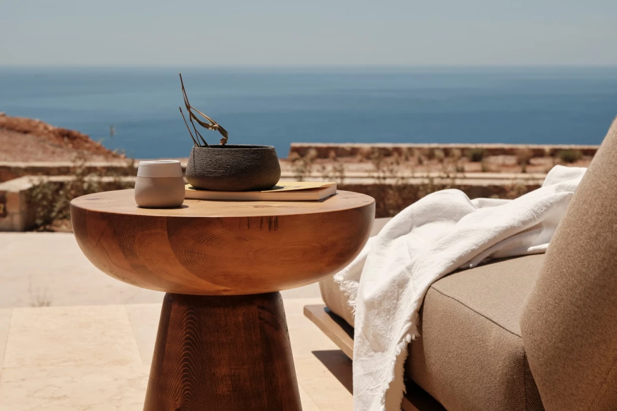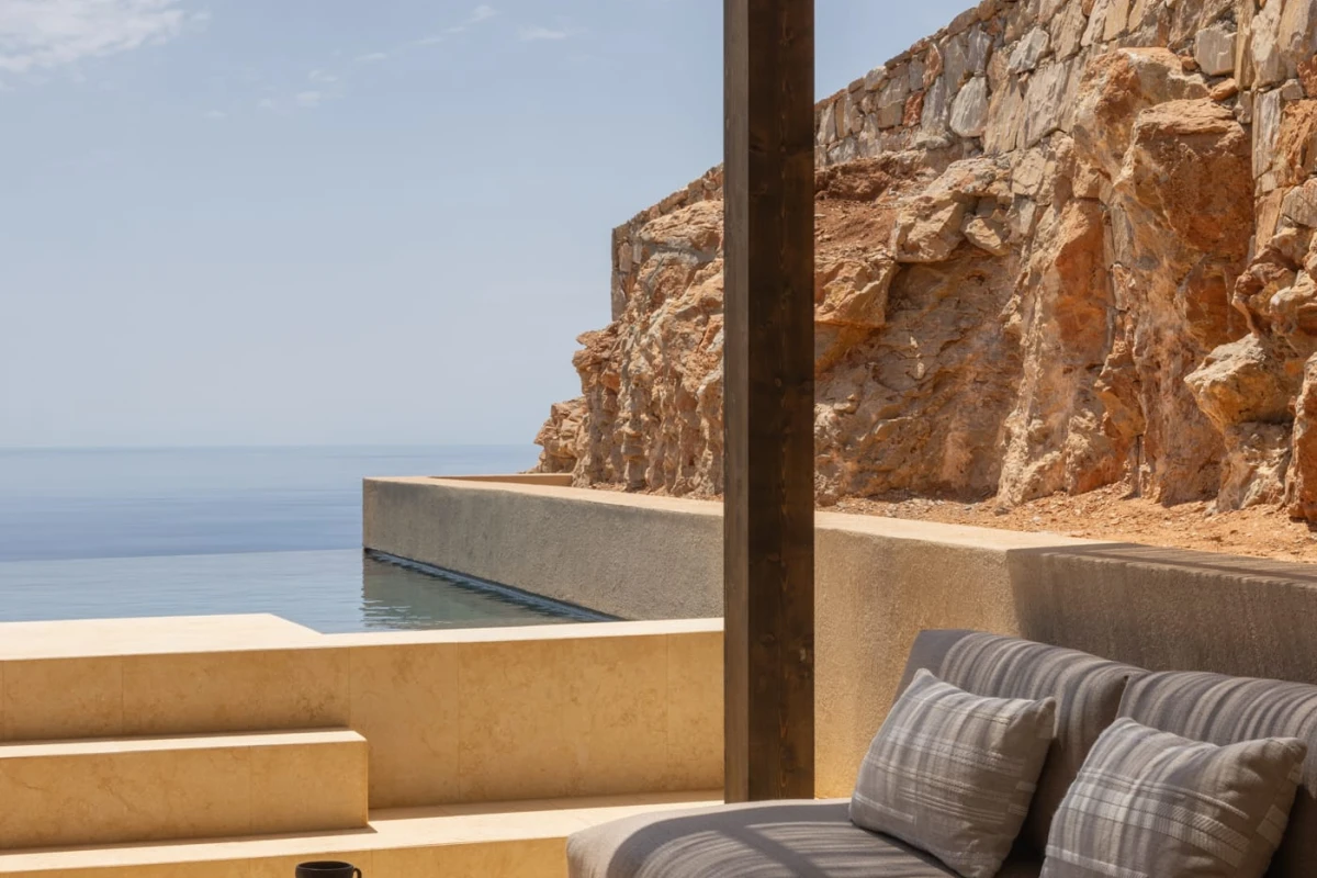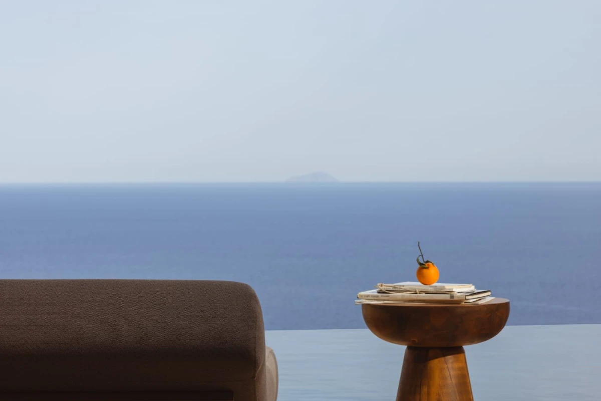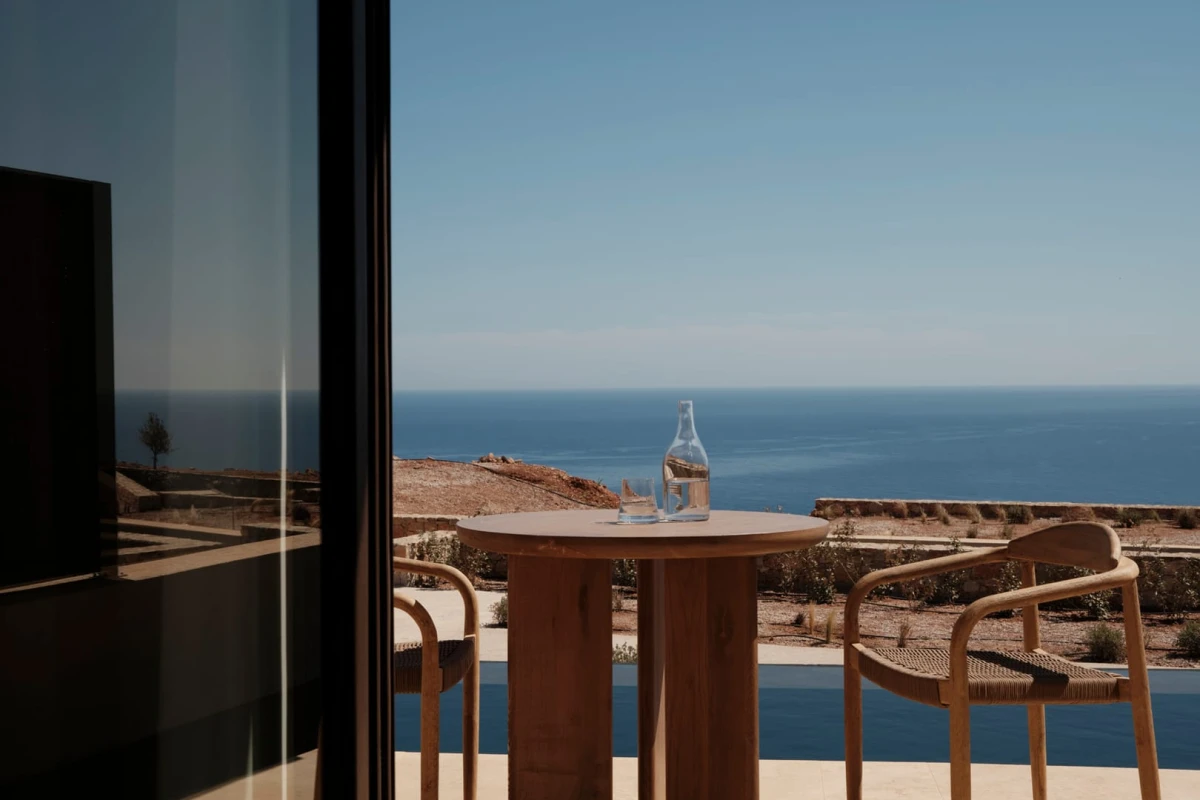 The air-conditioned rooms feature thoughtful touches like wardrobes, kettles, stocked minibars, flat-screen TVs, and seating areas that invite quiet reflection. Private bathrooms with showers provide a clean, refreshing start to the day, while terraces open to majestic ocean views, allowing the island's ancient tones to seep into every moment.