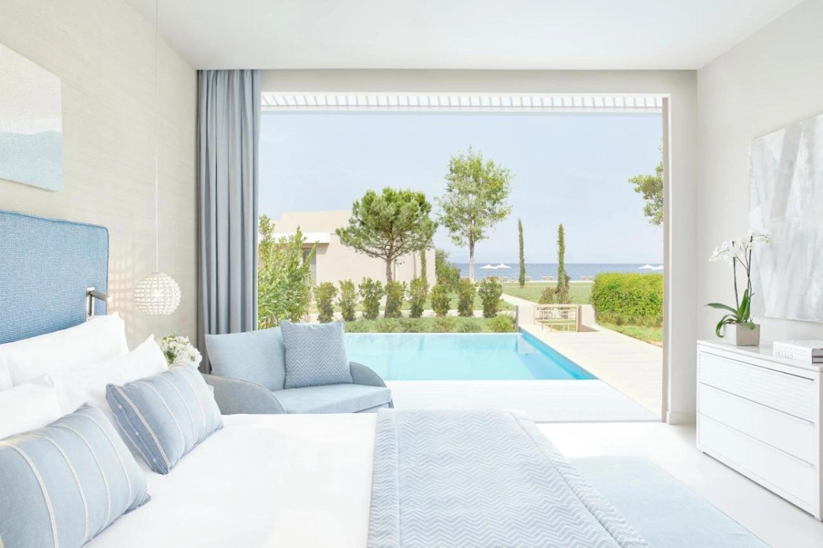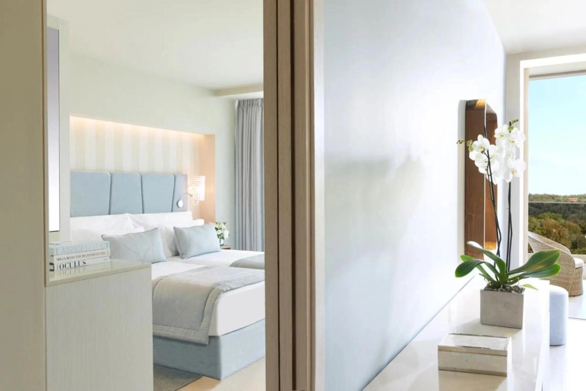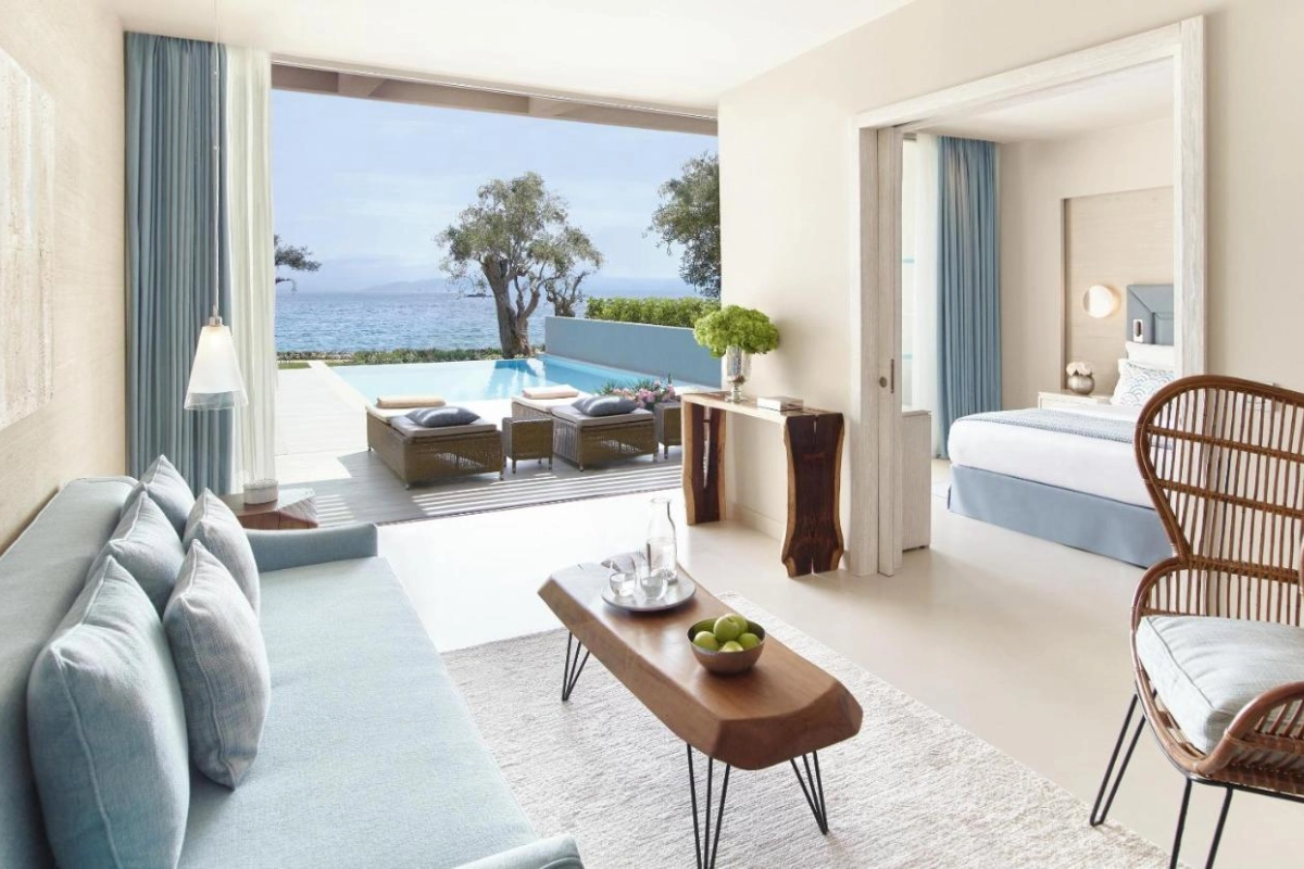 The 411 elegantly appointed rooms and bungalow-style suites feature air conditioning, satellite TVs, and fully stocked minibars with premium spirits. Each opens to a balcony or terrace with sweeping views of the Ionian Sea or lush inland woodlands, creating a serene retreat infused with modern comfort.