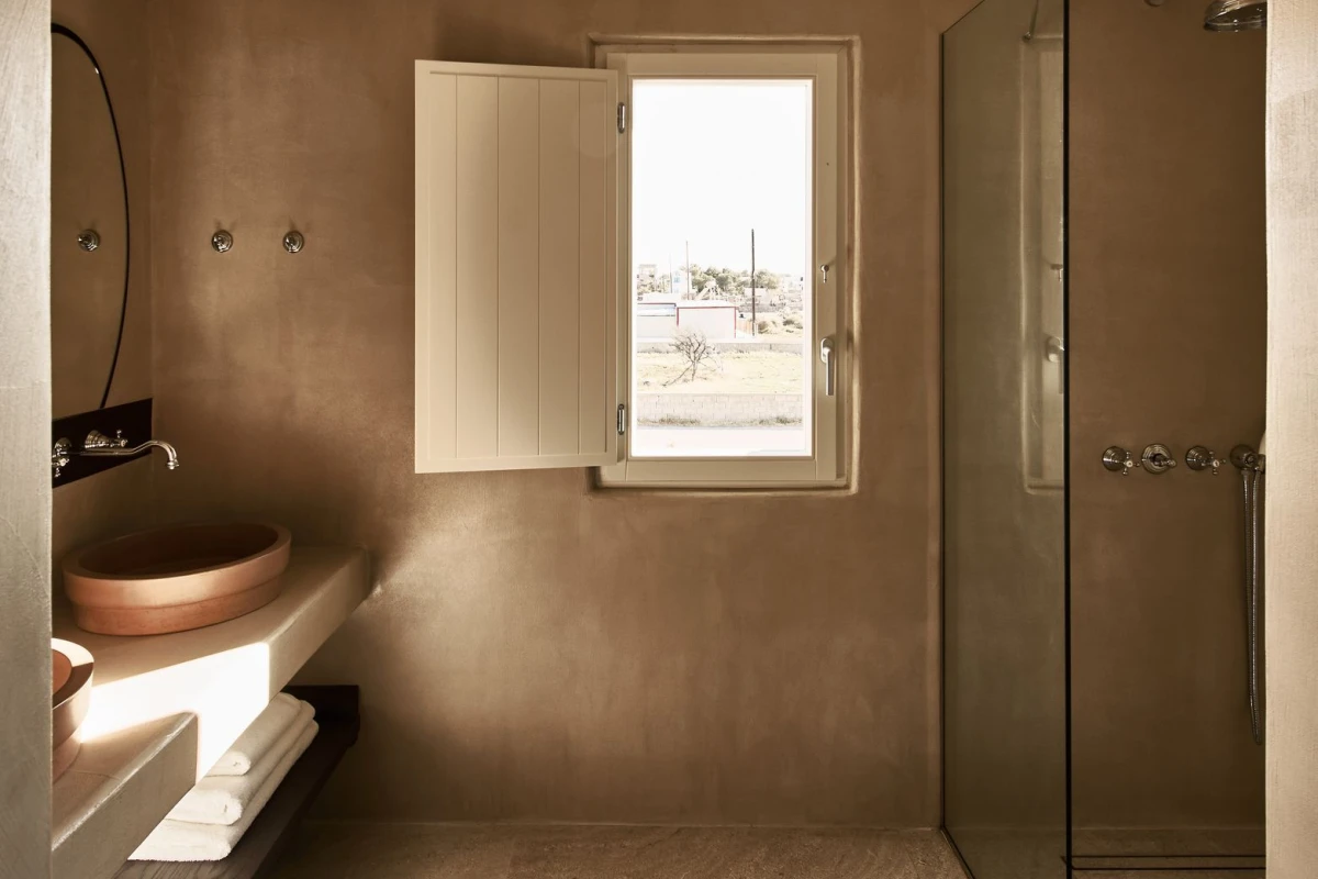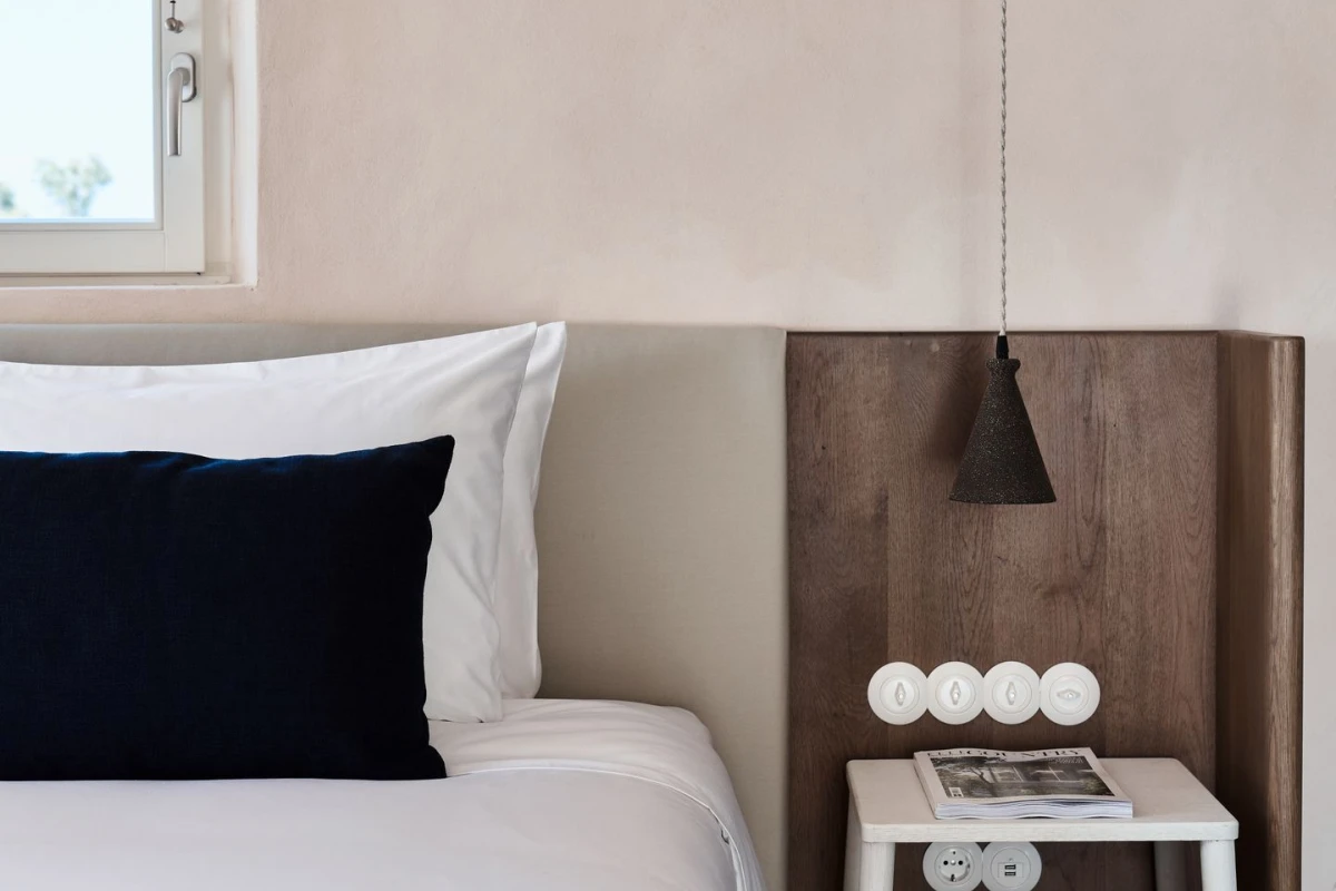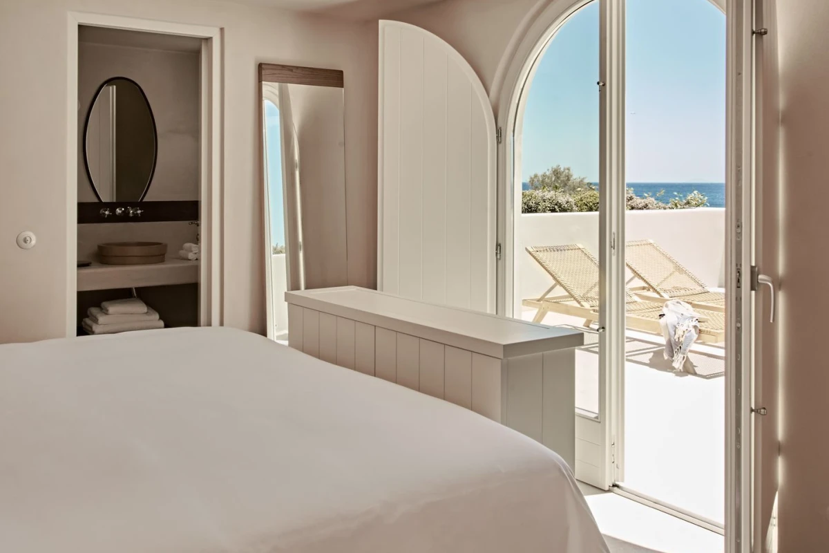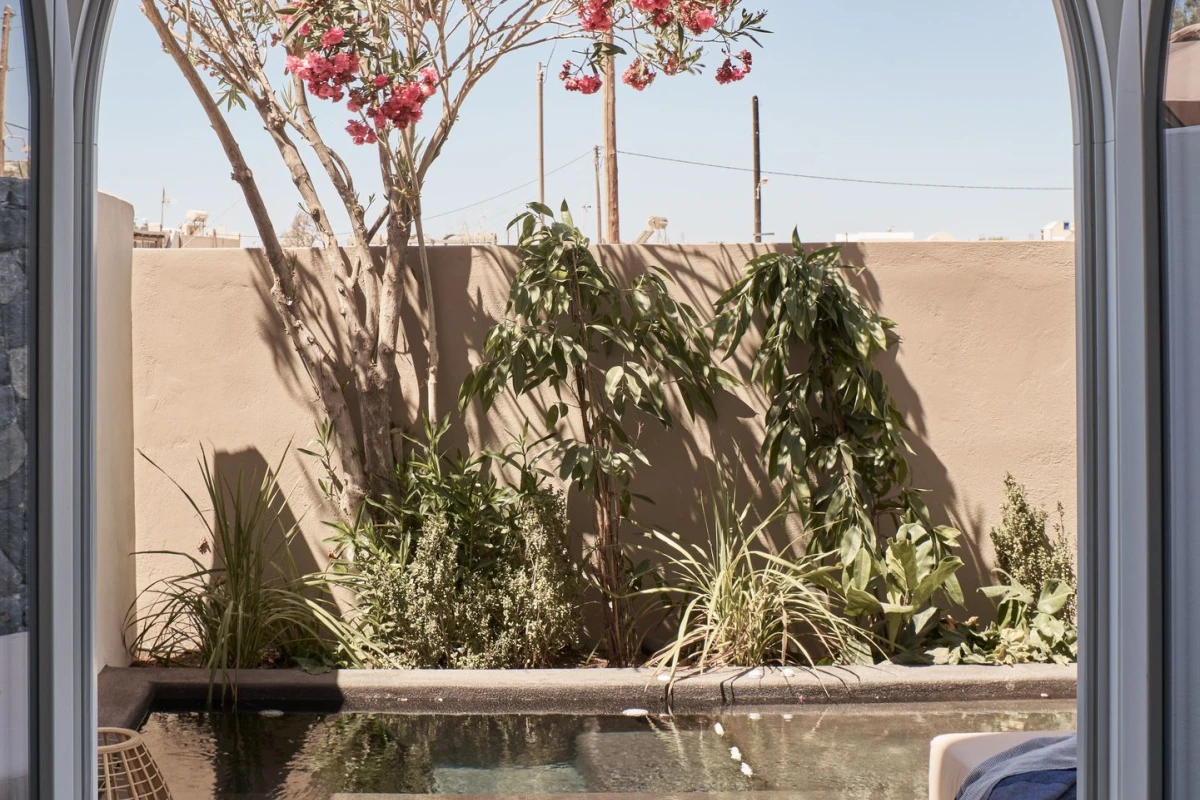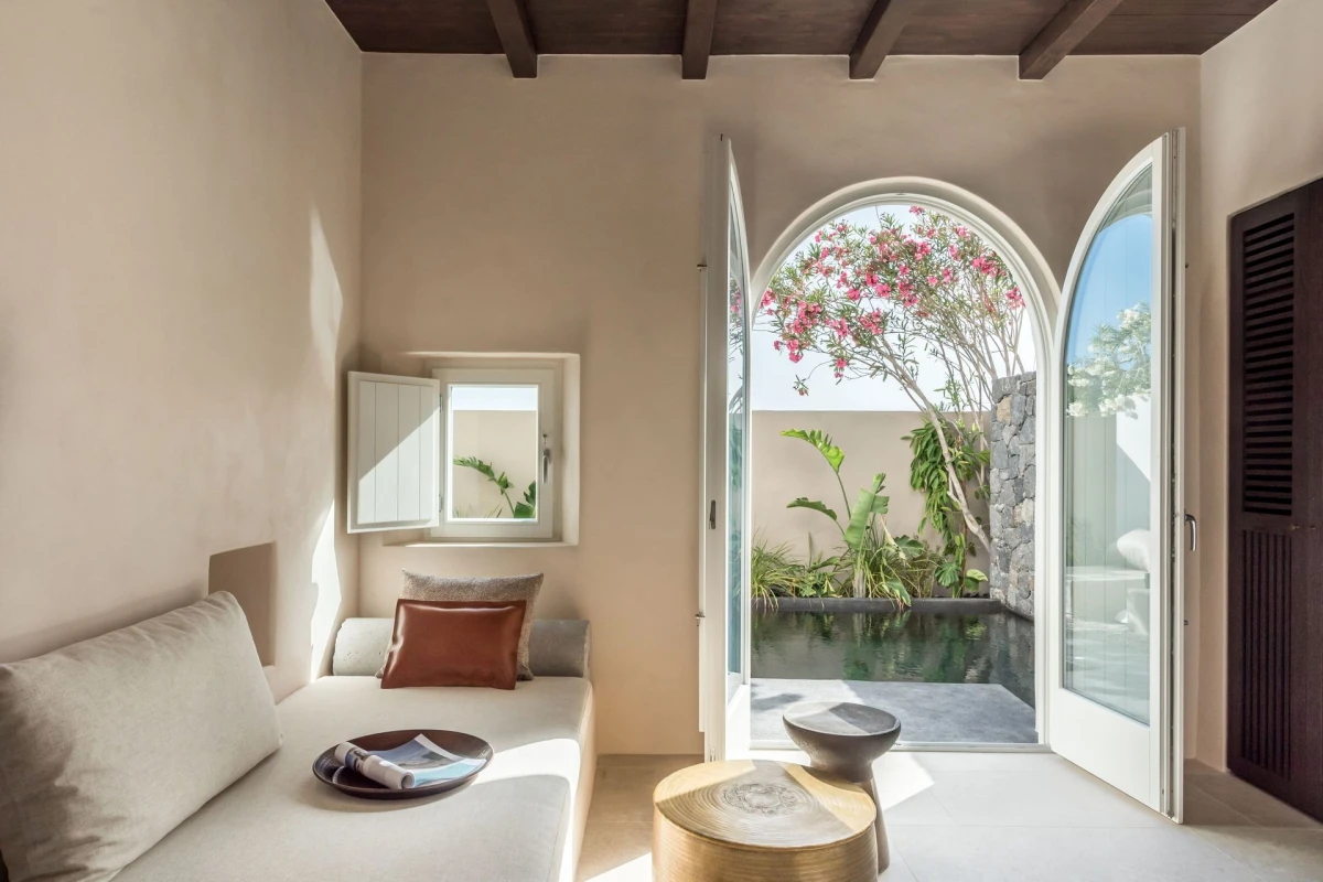 The 12 suites, each named for “story” in various languages, feature king-size or German twin beds, air conditioning, smart TVs, laptop-sized safes, minibars, and coffee/tea facilities. Private terraces, adorned with oversized stone pots and volcanic stone, offer sweeping sea views, with many suites boasting outdoor hot tubs or private pools. The design, accented by ancient olive trees and herbs, creates a serene, sophisticated ambiance.