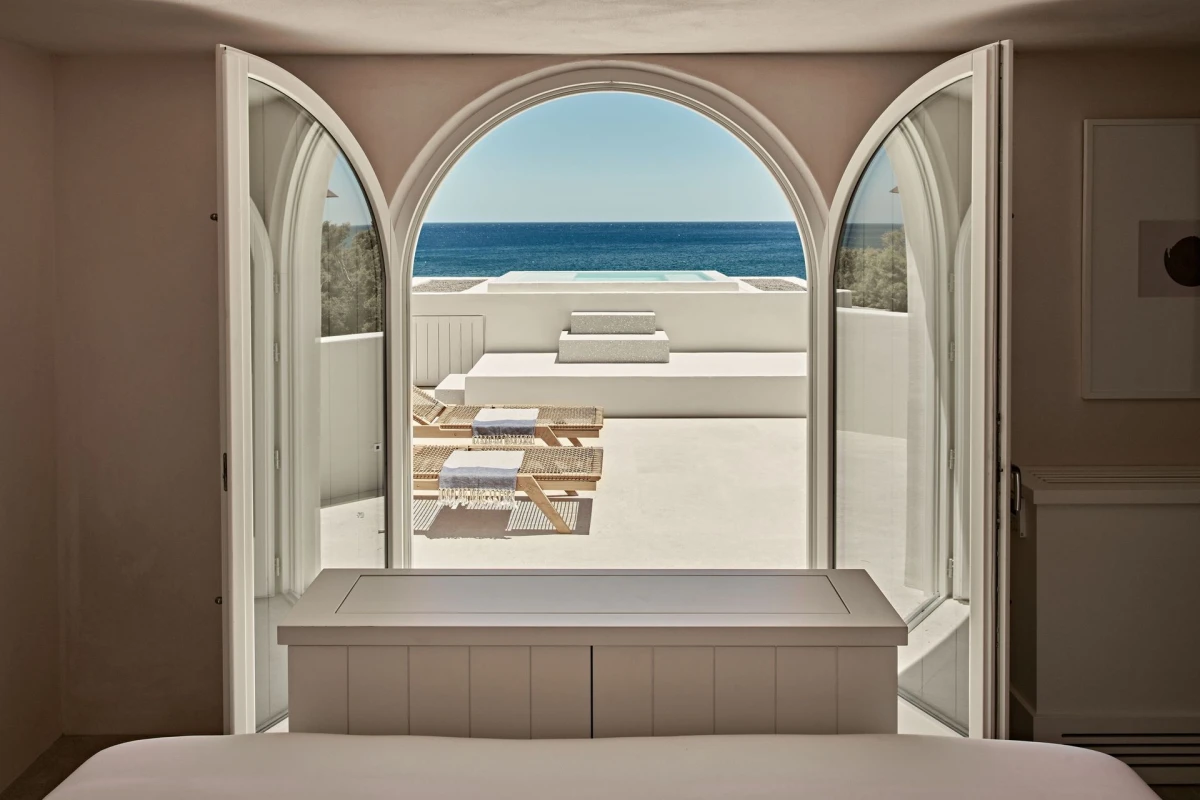 Istoria, a Member of Design Hotels, graces Santorini's eastern shore on Perivolos Beach, a five-star retreat where black volcanic sand meets the Aegean Sea, blending contemporary minimalism with authentic Greek elegance.