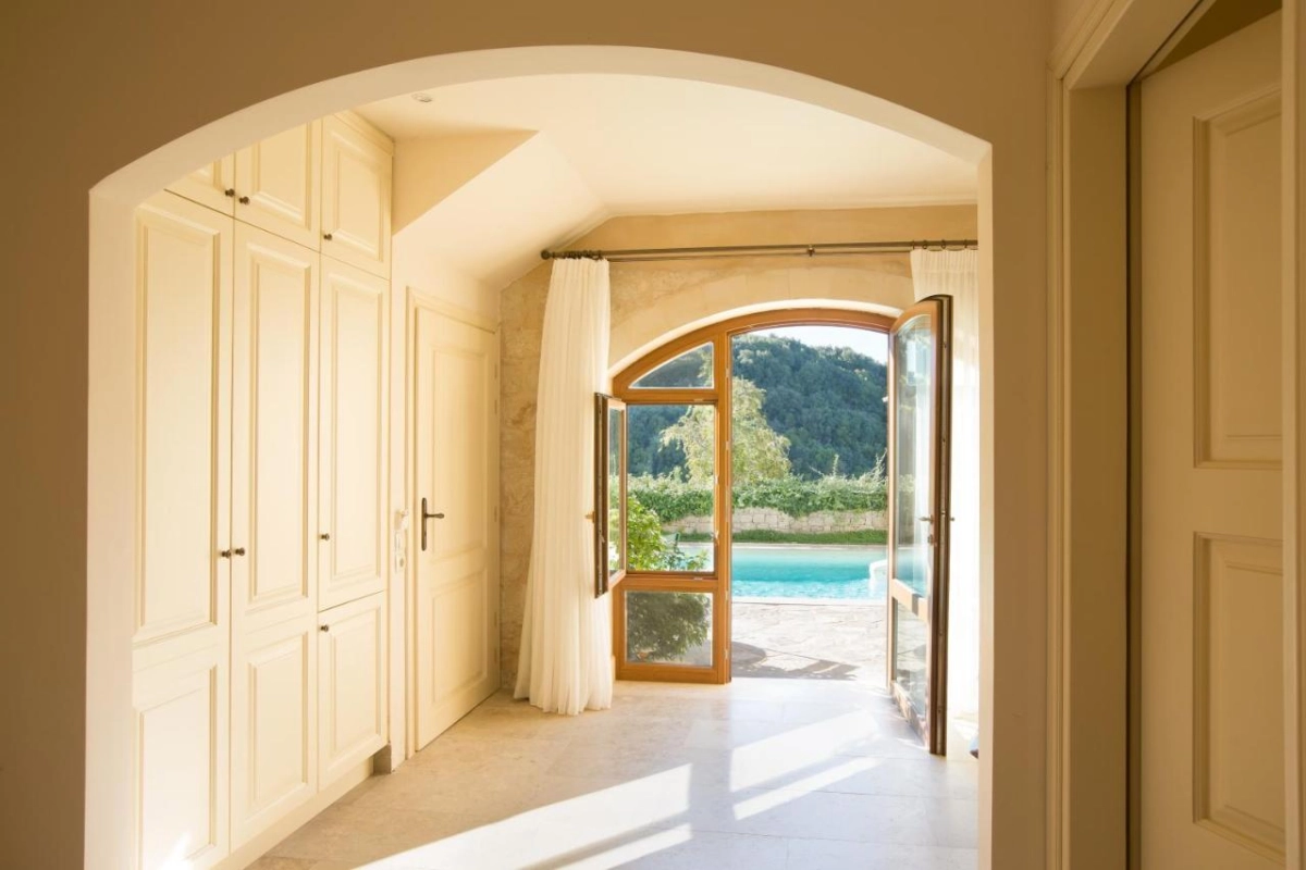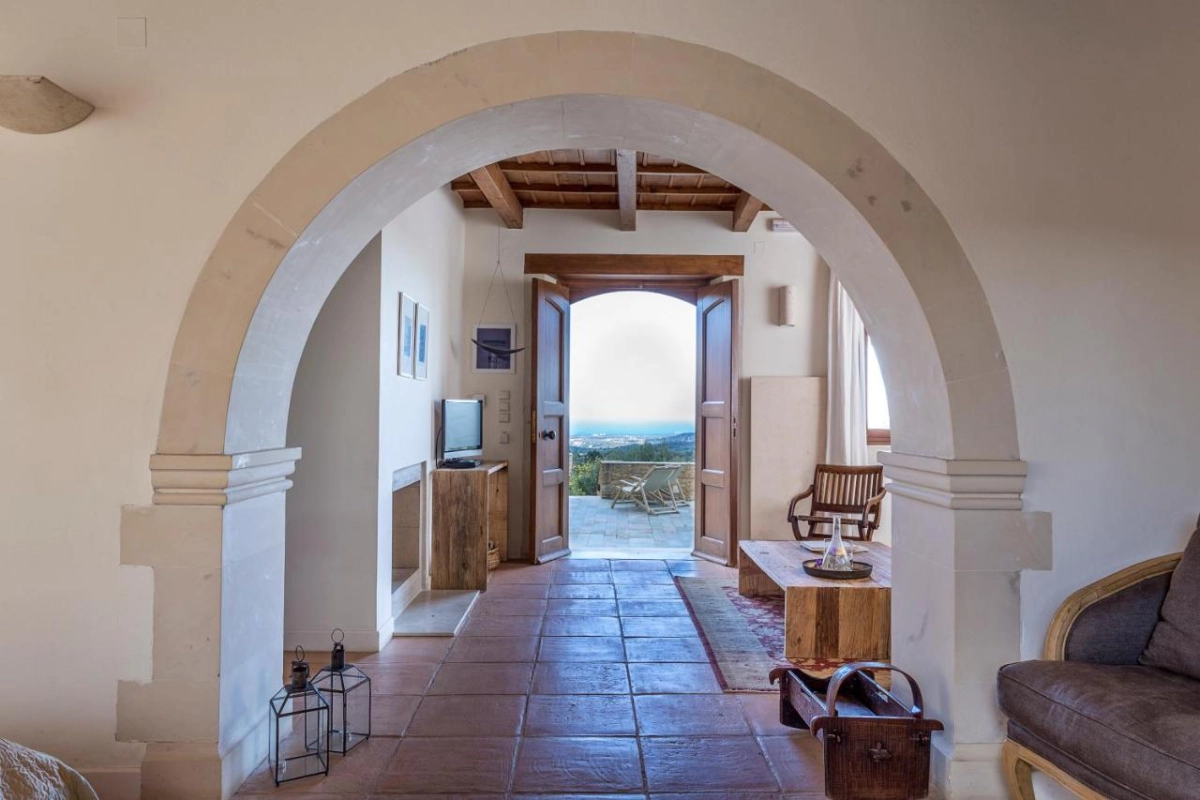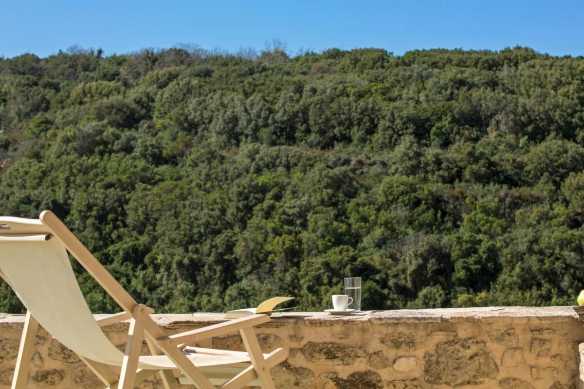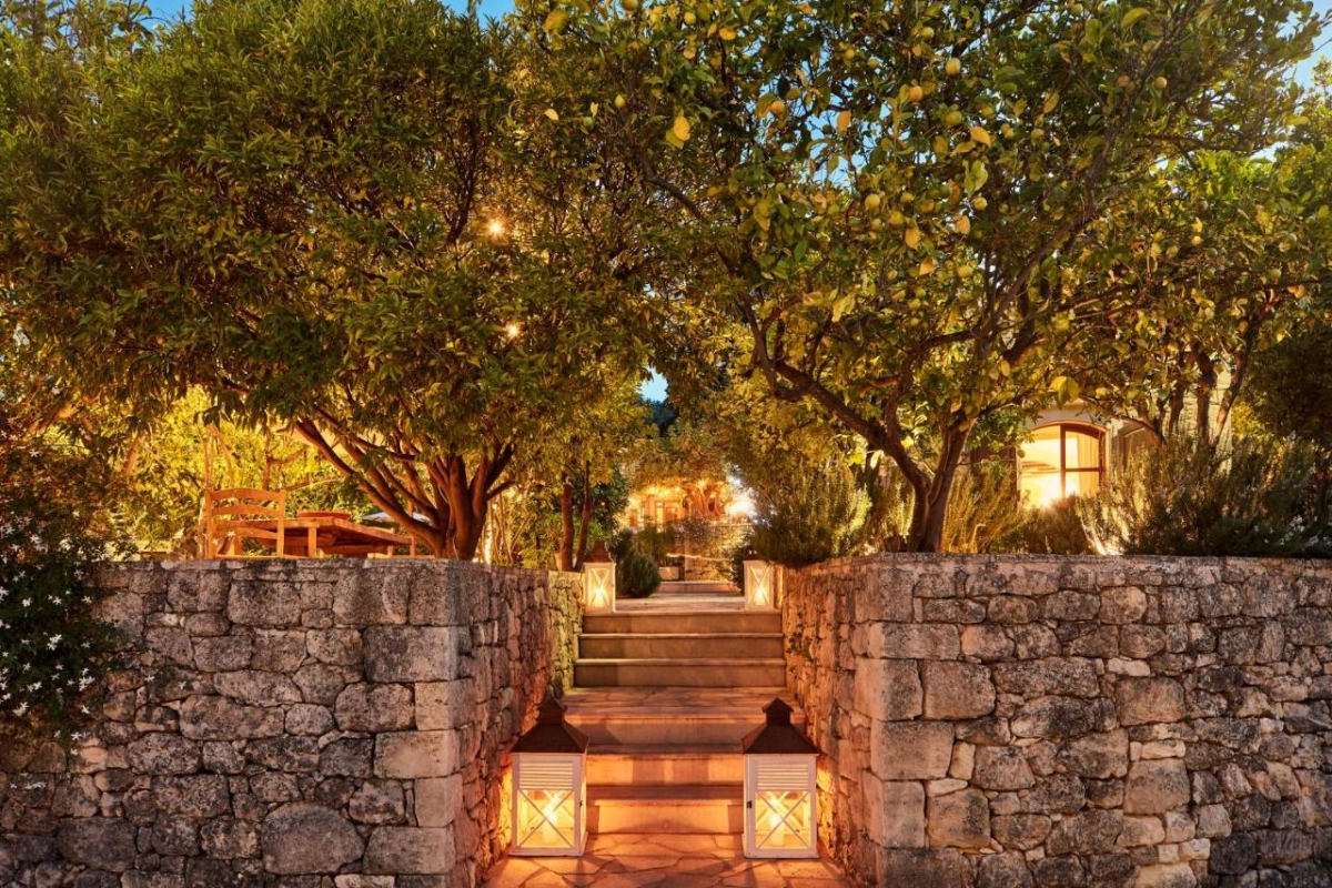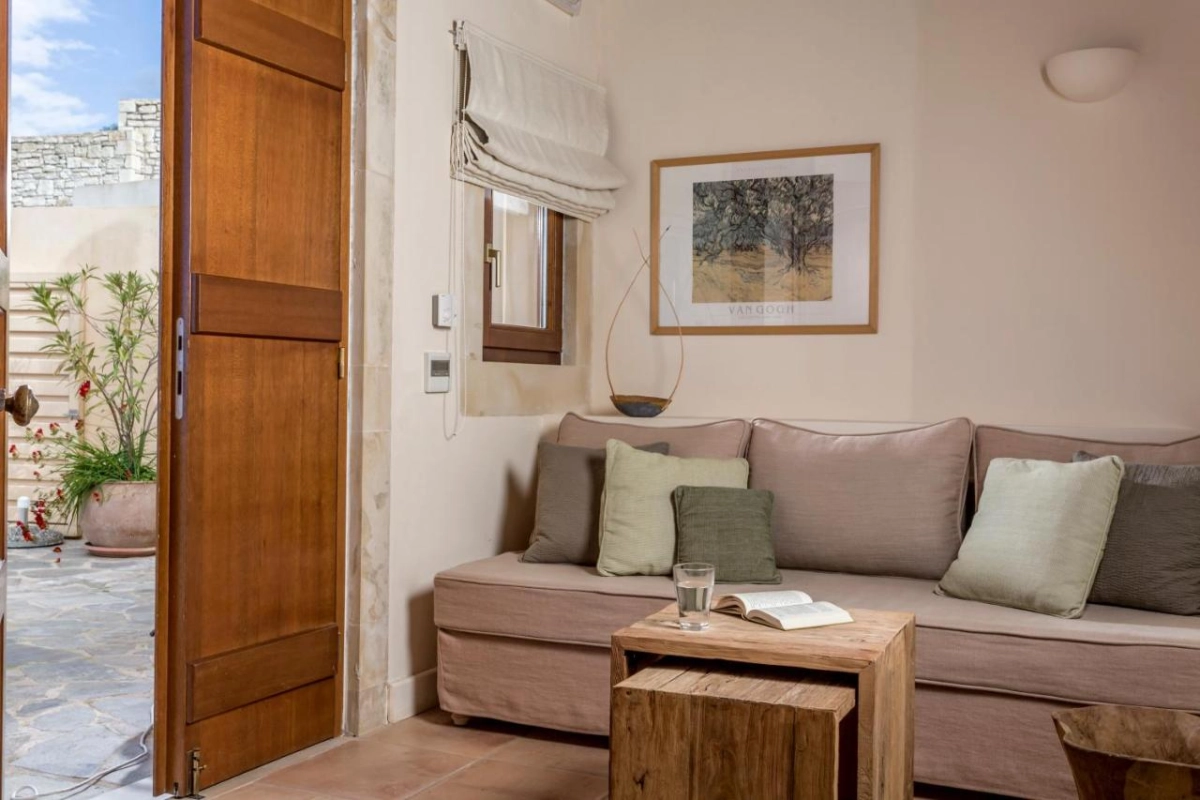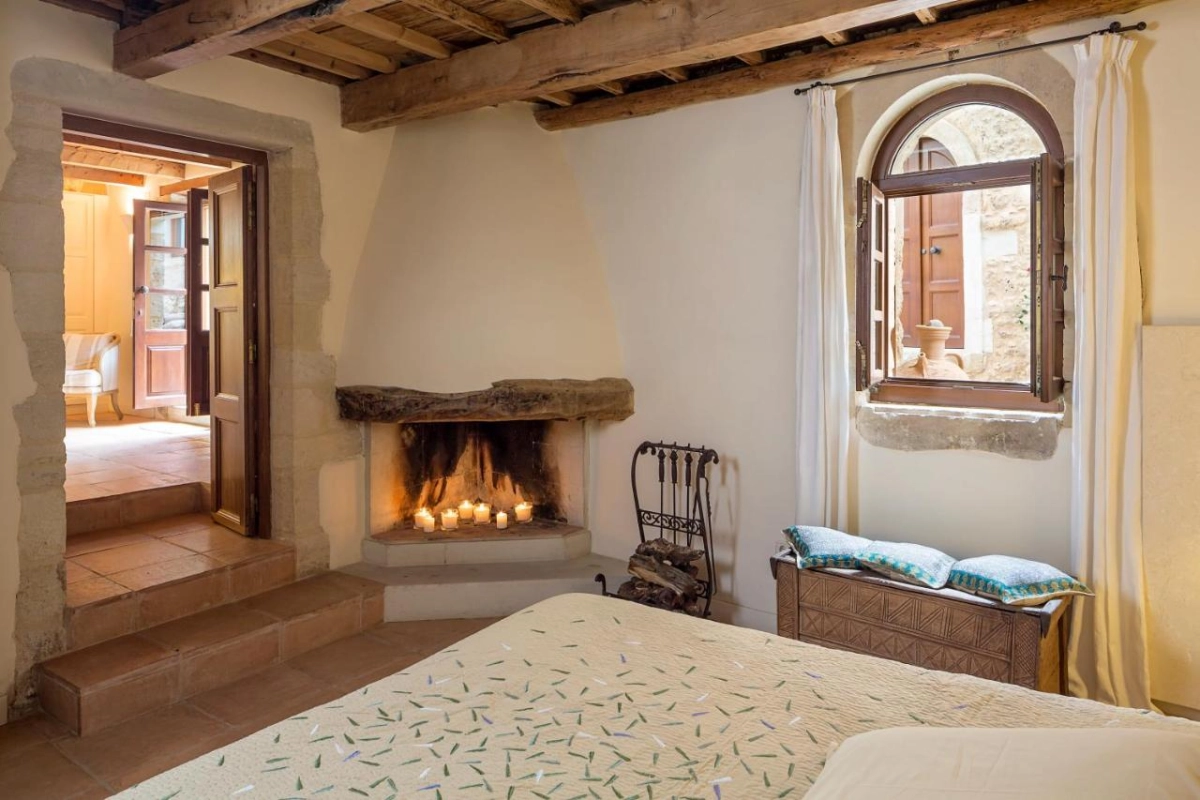 The 22 stone-built guest houses, transformed from an 18th-century olive oil mill and village settlement, feature unique designs with carved vaults, wooden beams, and modern comforts like air conditioning, satellite TVs, minibars, and private terraces. Many include fireplaces, enhancing the cozy elegance, while views of olive groves or the sea create a tranquil escape.