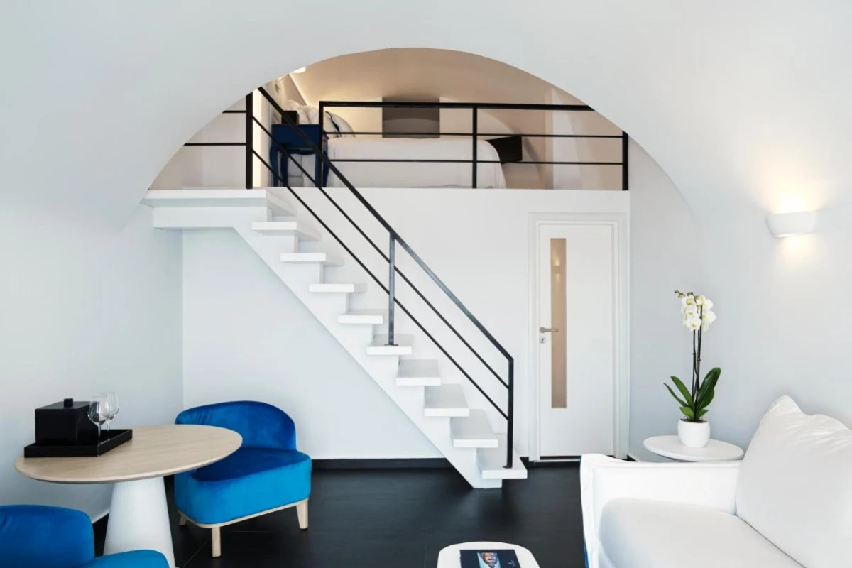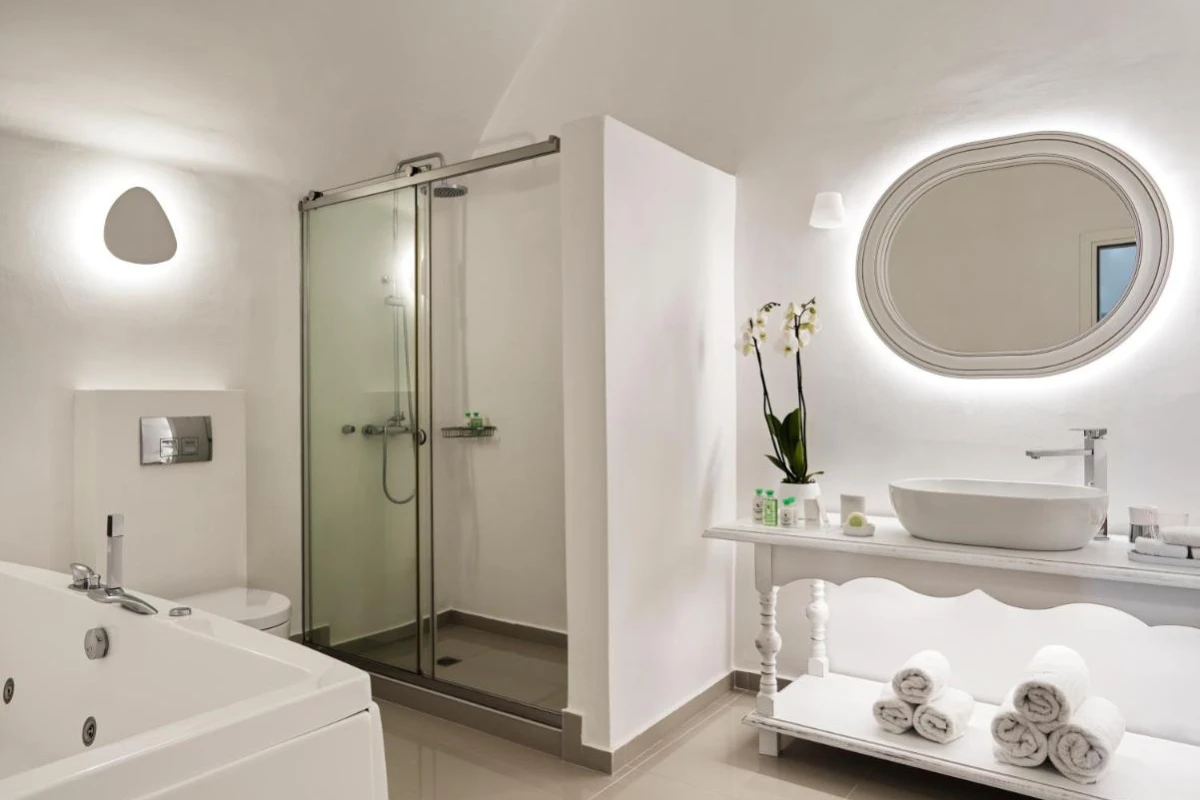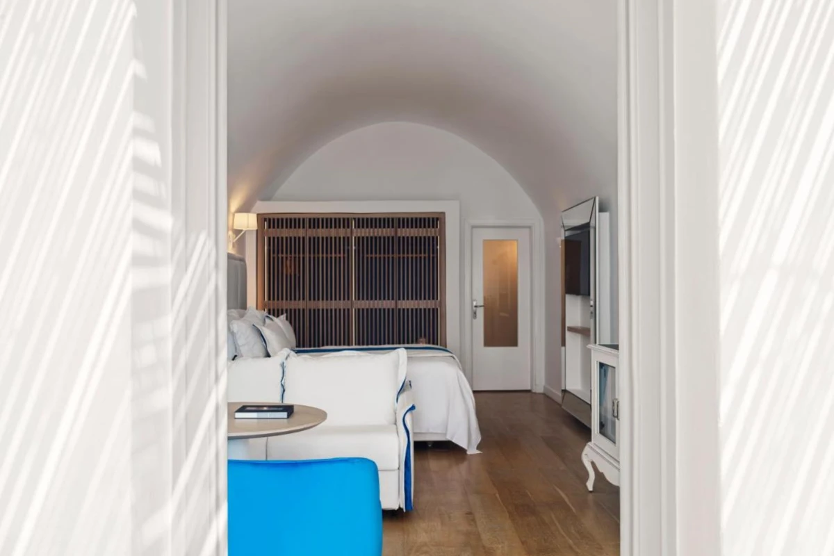 The white-washed rooms and suites, each with private terraces offering mesmerizing Caldera views, feature air conditioning, satellite TVs, CD players, minibars, mini wine cellars, and fridges. Plush bathrooms with premium toiletries enhance the refined ambiance, creating a serene escape steeped in Santorini's timeless beauty.