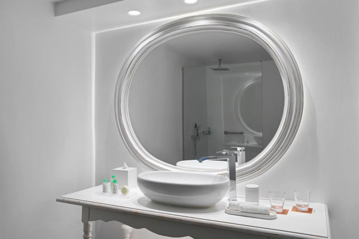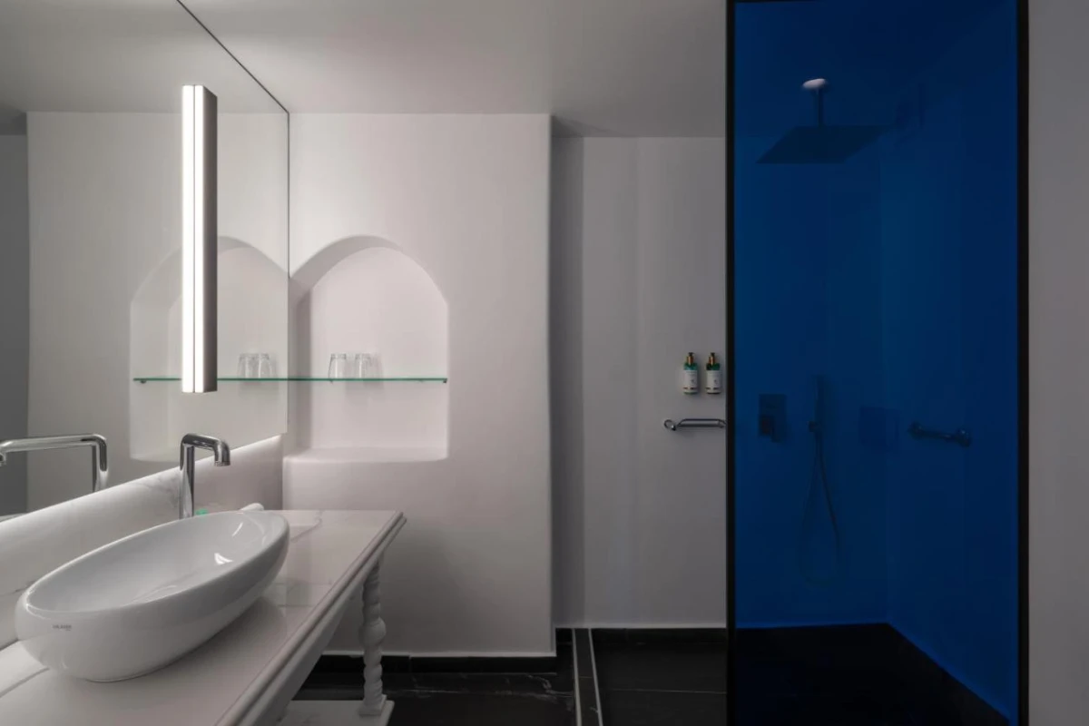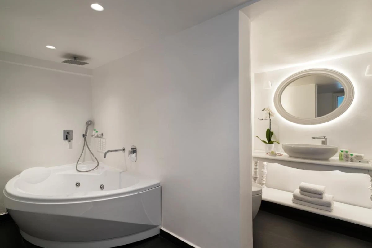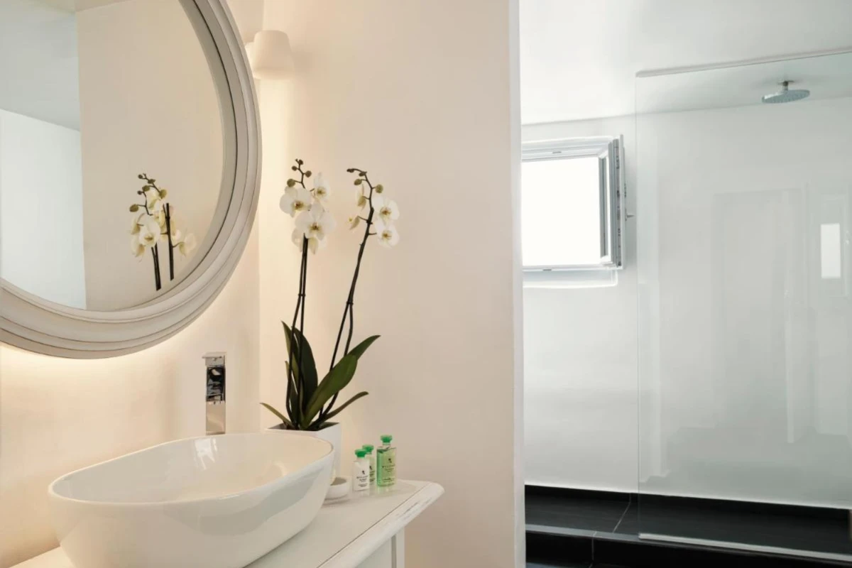 The white-washed rooms and suites, each with private terraces offering mesmerizing Caldera views, feature air conditioning, satellite TVs, CD players, minibars, mini wine cellars, and fridges. Plush bathrooms with premium toiletries enhance the refined ambiance, creating a serene escape steeped in Santorini's timeless beauty.