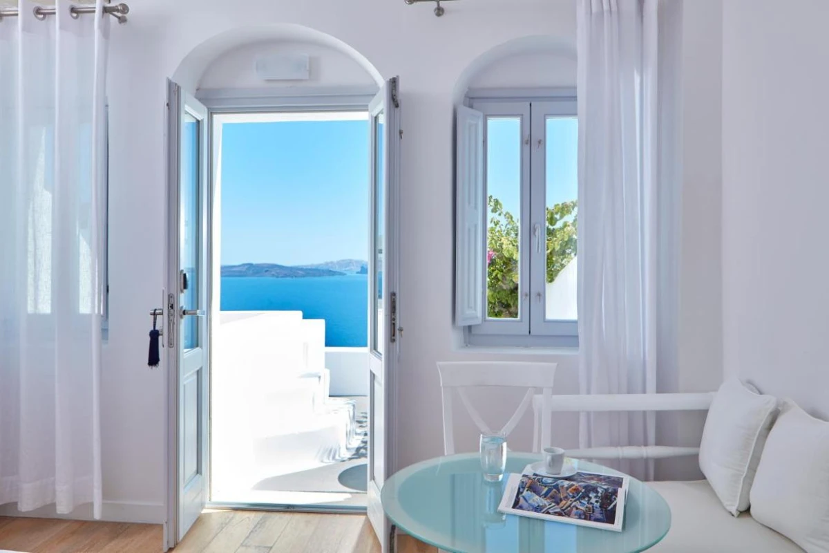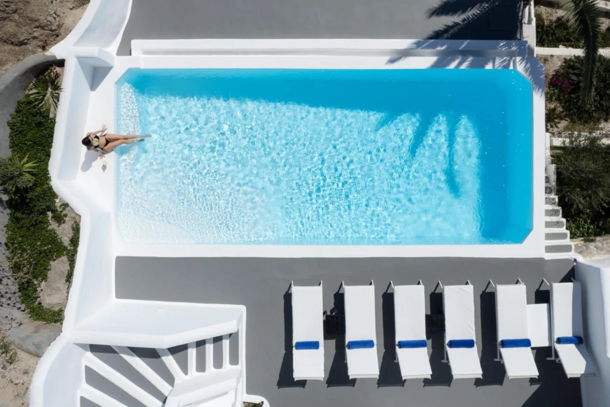 Each of the seven spacious suites blends Cycladic architecture with contemporary elegance, featuring air conditioning, satellite TVs, iPod docking stations, minibars, and premium bathroom amenities with plush toiletries. Private terraces enhance the serene ambiance, unveiling breathtaking vistas of the Aegean and volcanic landscape.