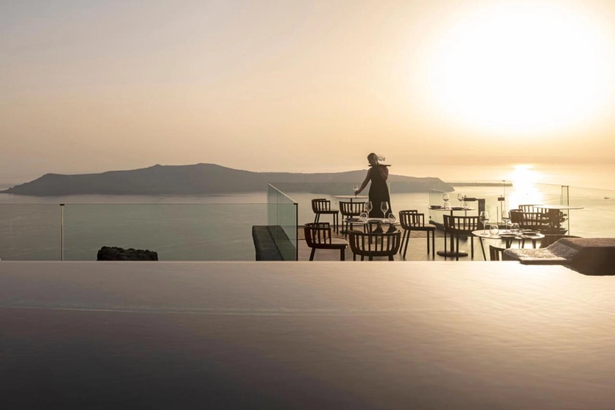 The nine suites and one villa feature custom-made furniture, Simmons mattresses, Sonos sound systems, and iPad-controlled lighting, blending minimalist design with cutting-edge amenities. Each unit offers indoor or outdoor jetted pools and private terraces with sweeping Caldera vistas, their curved windows ensuring the day's final rays illuminate the bedrooms year-round. Bathrooms with premium toiletries enhance the serene elegance.