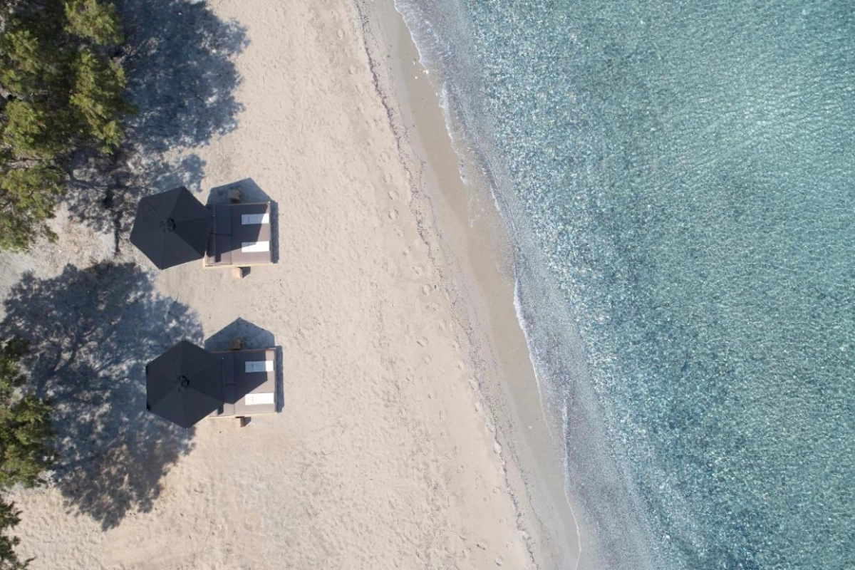 Dining at Koan Cuisine enchants with a fine-dining à la carte menu of Greek, Italian, and Mediterranean dishes, prepared in an open kitchen with fresh local ingredients, served poolside or in a luxurious indoor setting. The Wine Cellar offers sparkling champagnes and unique wines paired with a curated cigar list, while the All Day Bar serves coffees, juices, and cocktails within Koan's cozy ambiance. The Pool Bar delivers light bites, from fresh salads to wood-fired pizzas, to sunbeds or gazebos. A sumptuous breakfast buffet greets each morning. The breathtaking pool area, framed by swaying palms and two Jacuzzis, complements a private beach for surfing or lounging. The Idolo Spa, spanning 300 square meters, offers a heated indoor pool, sauna, steam bath, and bespoke treatments, while the gym features treadmills, TRX, and ellipticals. Curated picnics by the Aegean or countryside sunsets, arranged by the 24-hour concierge, add a romantic touch to island explorations.