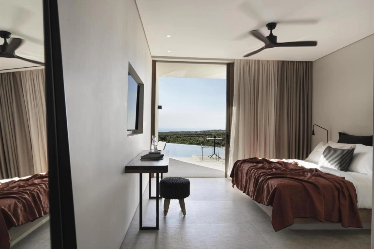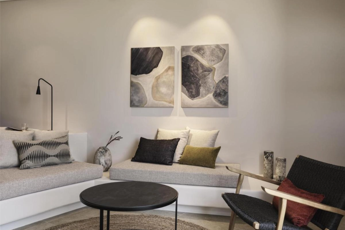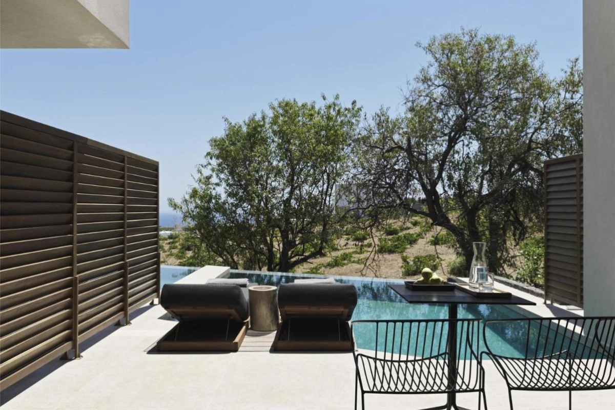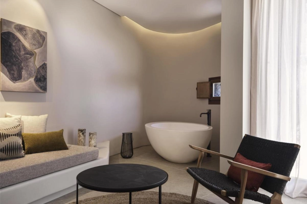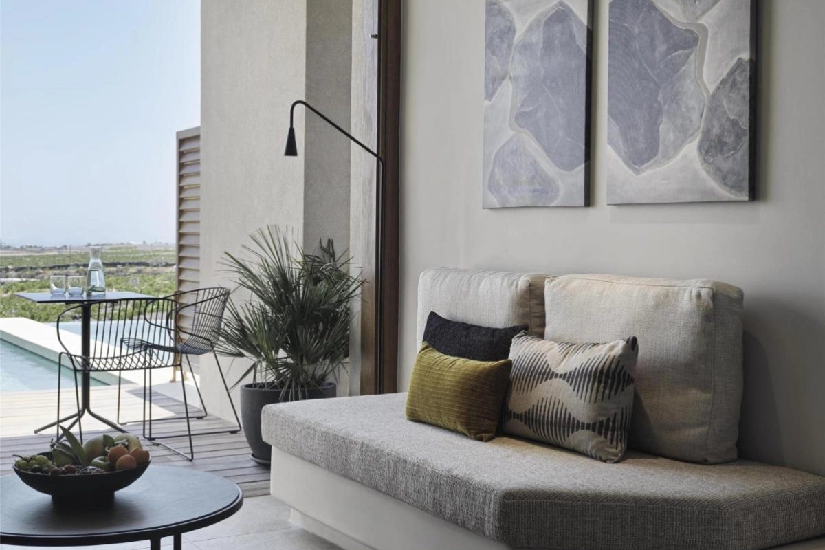 The 59 rooms and suites, many with private pools or hot tubs, feature air-conditioned comfort, flat-screen TVs, minibars, and luxurious bathrooms with premium toiletries. Private terraces unveil unobstructed Aegean vistas, harmonizing with the island's volcanic beauty through designs inspired by water, light, and air.
