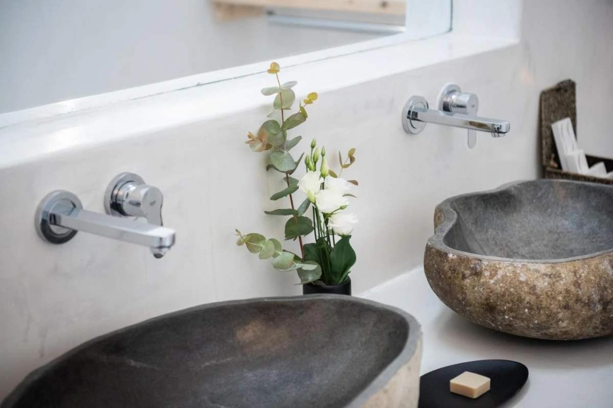 The suites, blending Cycladic tradition with minimalist elegance, feature spacious interiors with satellite flat-screen TVs, espresso makers, minibars, and state-of-the-art bathrooms with premium branded toiletries. Each suite offers private plunge pools and expansive outdoor areas with sleek modern furniture, unveiling breathtaking vistas of the volcano and Aegean Sea from generous private balconies.