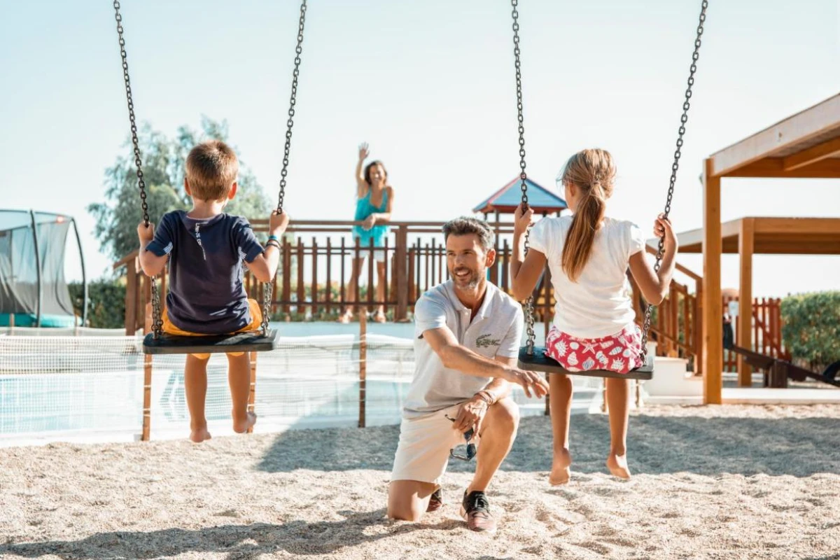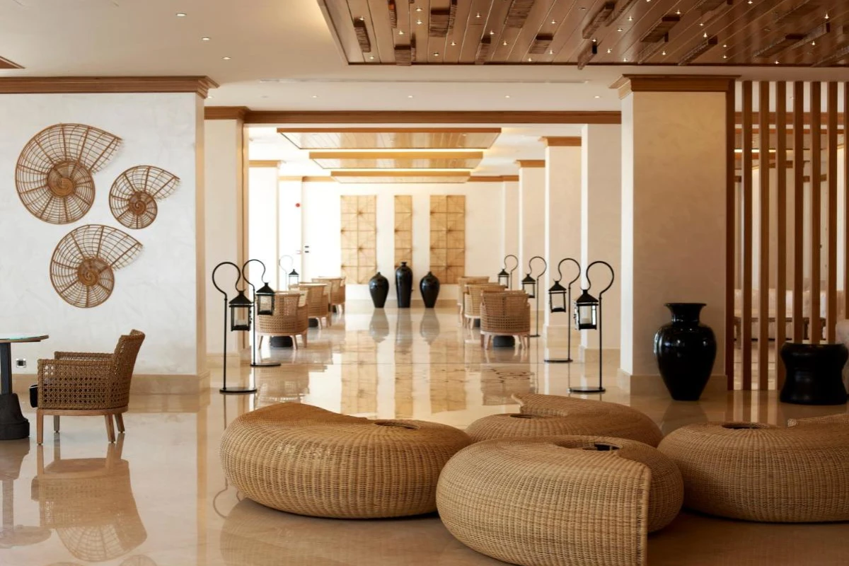 The 499 accommodations, ranging from double rooms and bungalows to maisonettes, villas, and suites, feature earthy tones, marble floors, and wooden furnishings, many with private balconies or terraces overlooking vibrant gardens or the sea. Select units offer private pools for an added touch of exclusivity. Each air-conditioned space includes satellite TVs and minibars, creating a seamless blend of comfort and style amidst the resort's cascading lagoons and 12 shared pools.