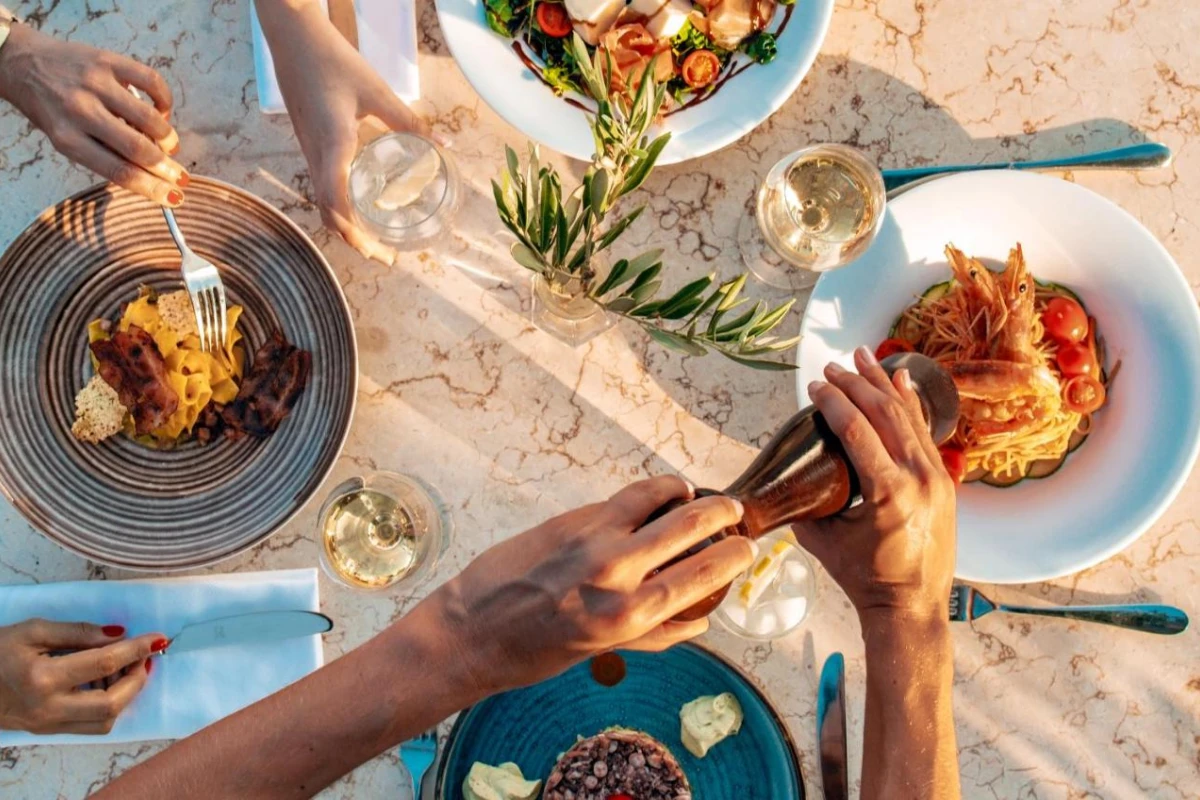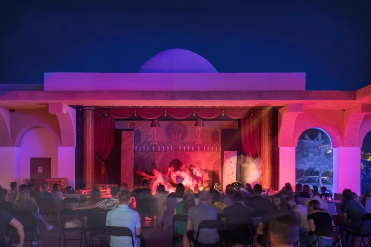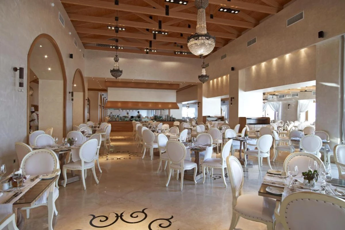 Dining is a celebration of global and local flavours across 11 distinct venues. The Main Restaurant presents American buffet breakfasts, early continental options, and lively show-cooking buffets for lunch and dinner, featuring Greek and international dishes. Guests can savour Italian classics at the Italian Restaurant, fusion creations at the Asian Restaurant, traditional Greek fare at Ellinadiko, or bold Tex-Mex dishes at the Mexican Restaurant, all requiring reservations for dinner. Daytime dining includes Sushi Restaurant, Ouzeri for ouzo and mezes, Burger Inn, Healthy Corner's smoothies and salads, Pita Corner's souvlaki, Traditional Pita Station, and Pastry Corner's crepes and ice creams. Six bars, including the Lobby Bar, Night Bar with live music, Island Pool Bar, Garden Pool Bar, Beach Bar, and Theatre Bar, serve cocktails, fine wines, and spirits from morning until late. Leisure unfolds with outdoor pools, water sports like water polo and pedalos, tennis courts, and aerobics, while the spa offers an indoor pool, massage rooms, and tailored beauty treatments. Daily activities, from sports to evening shows in the amphitheater, keep the energy alive.