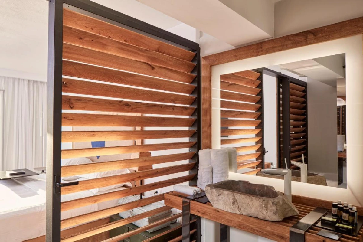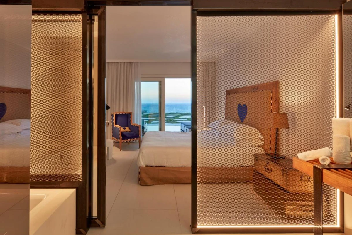 The 118 air-conditioned rooms and suites, designed with modern décor and warm wooden accents, feature LCD satellite TVs, DVD/CD players, and private balconies or terraces with sweeping vistas of Elia Beach. Select accommodations elevate the experience with outdoor hot tubs or private pools, blending contemporary elegance with the island's natural beauty. Bathrooms are appointed with premium toiletries, ensuring a refined and restful retreat.