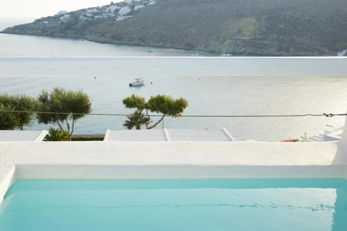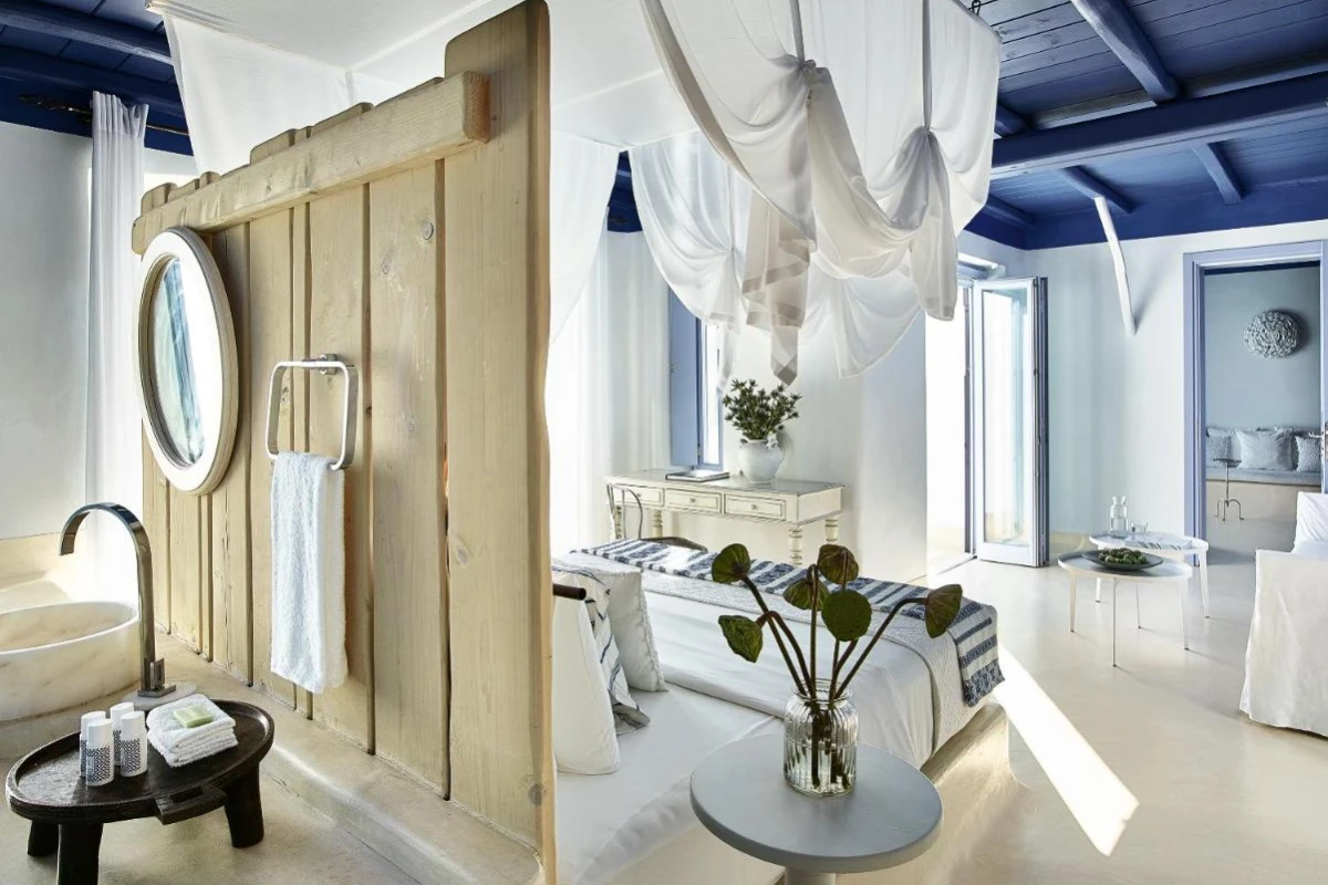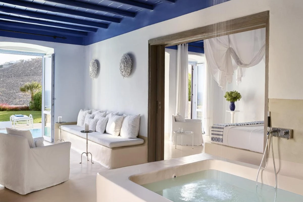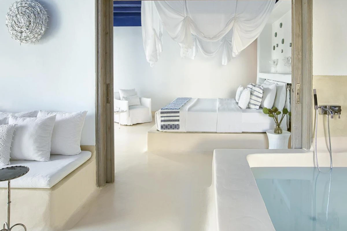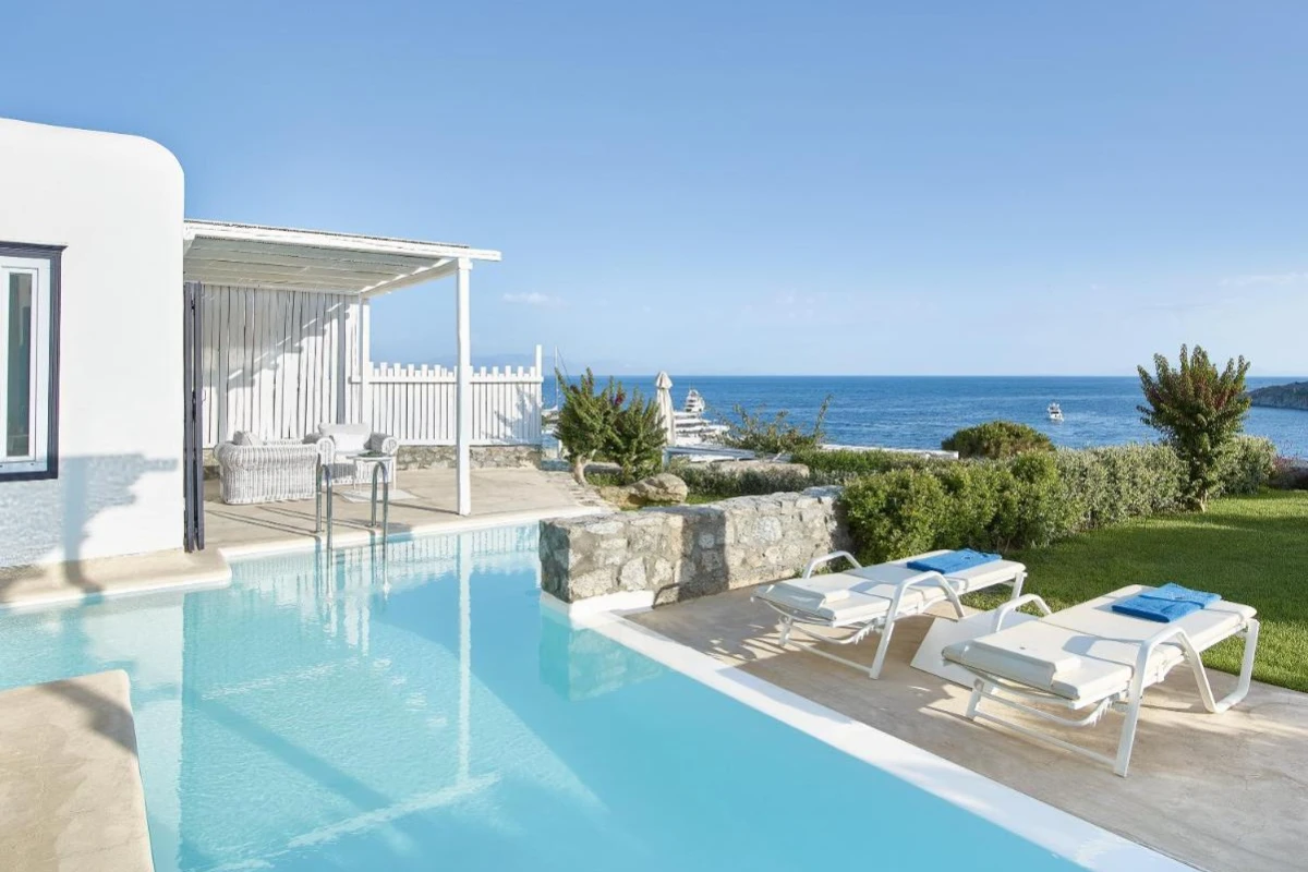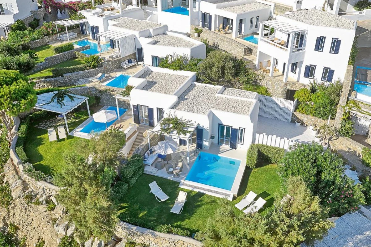 Mykonos Blu, A Grecotel Resort, a distinguished five-star haven on Psarou Beach, Mykonos, blends iconic Cycladic sugar-cube architecture with chic sophistication, offering captivating Aegean Sea views.