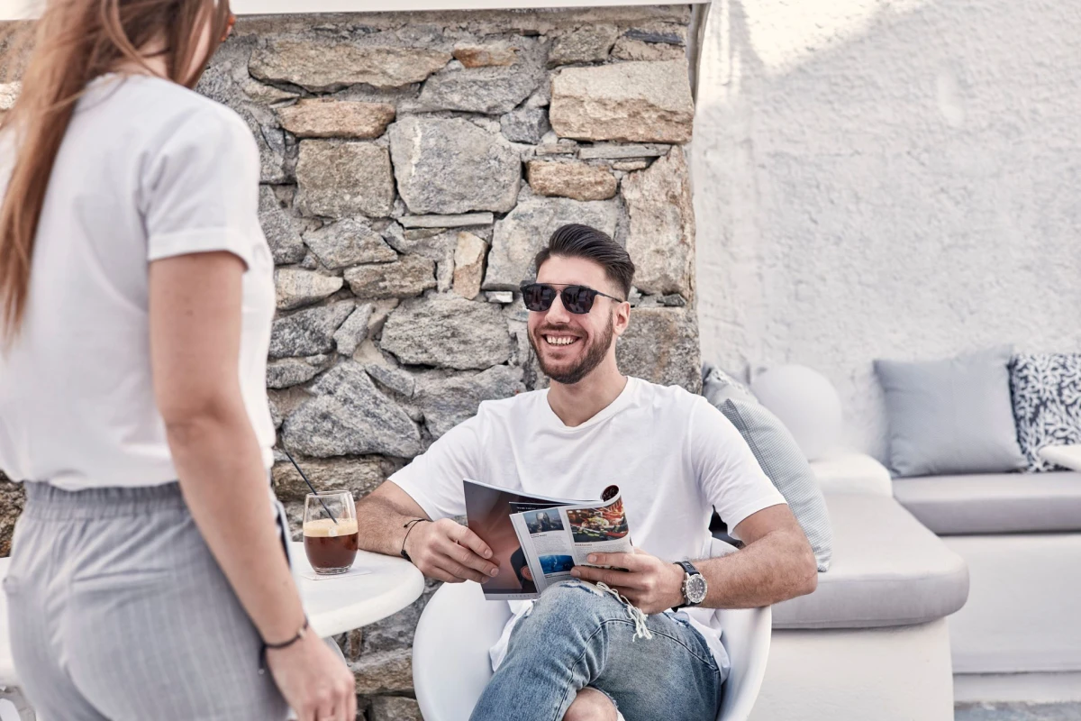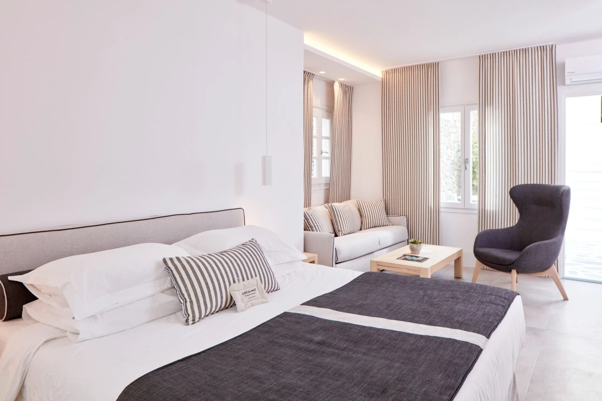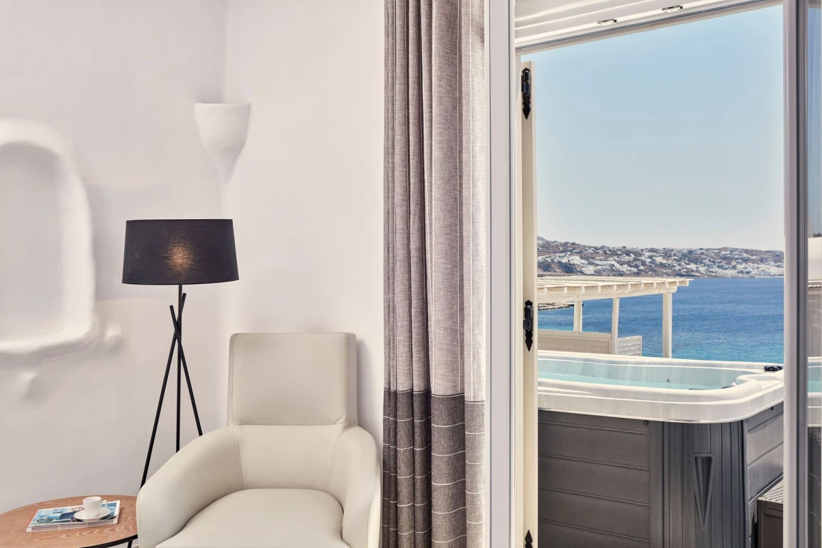 A magnificent sea-view pool, framed by a sunlit terrace, invites tranquil lounging, while the wellness centre offers a gym and revitalizing massage treatments for complete serenity. The hotel's restaurant serves modern Greek cuisine in a romantic poolside setting, with fresh, local ingredients shaping dishes that celebrate Mykonos' culinary heritage. An à la carte breakfast, featuring local delicacies, is served daily in the dining or pool area, and the pool bar crafts artisanal cocktails with views of Mykonos Town and Delos. Attentive staff and a concierge curate bespoke experiences, from exploring nearby beaches to discovering the island's cultural gems, ensuring a seamless and memorable stay.