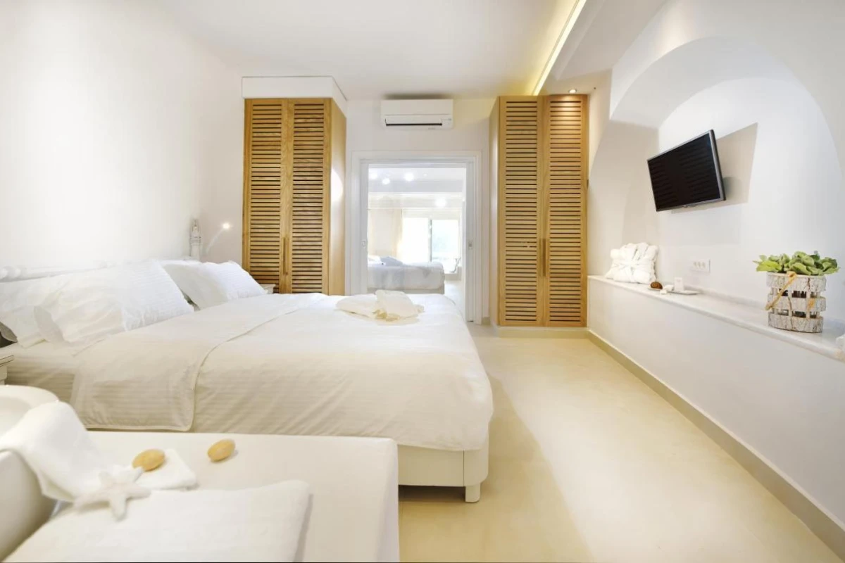 The air-conditioned guestrooms, adorned with whitewashed walls and vibrant stone floor tiles, feature satellite TVs, CD and DVD players, minibars, and private bathrooms with premium toiletries, bathrobes, slippers, and hairdryers. Each opens to a private balcony with captivating sea vistas, creating a serene and comfortable sanctuary for families and those seeking a private escape.