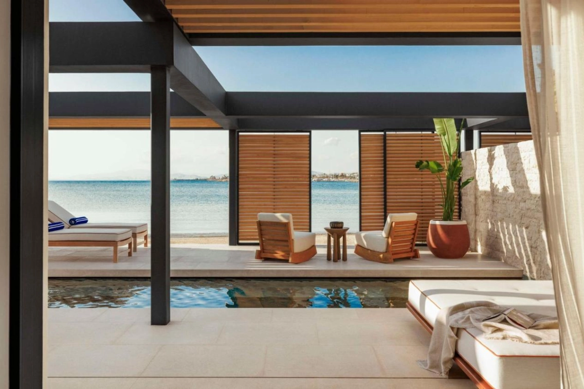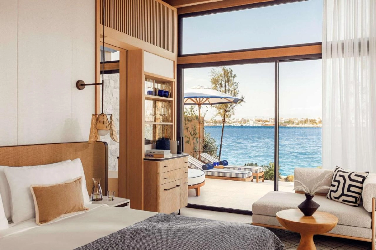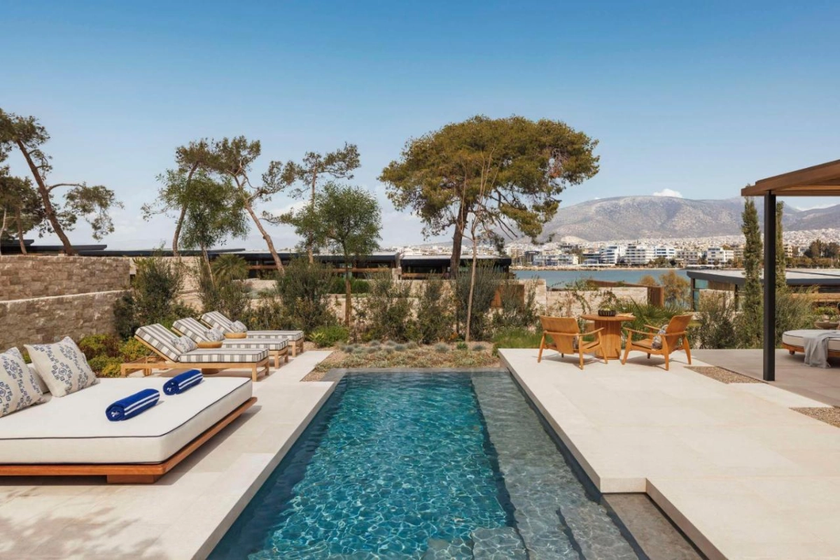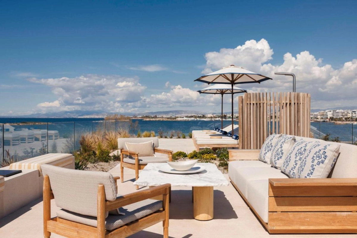 Many rooms open to terraces with sweeping sea views, kissed by salty Aegean breezes. The retro-chic decor, blending sleek woods and vibrant textiles, conjures intimate havens for travellers seeking nostalgic elegance amid Athens' coastal allure.