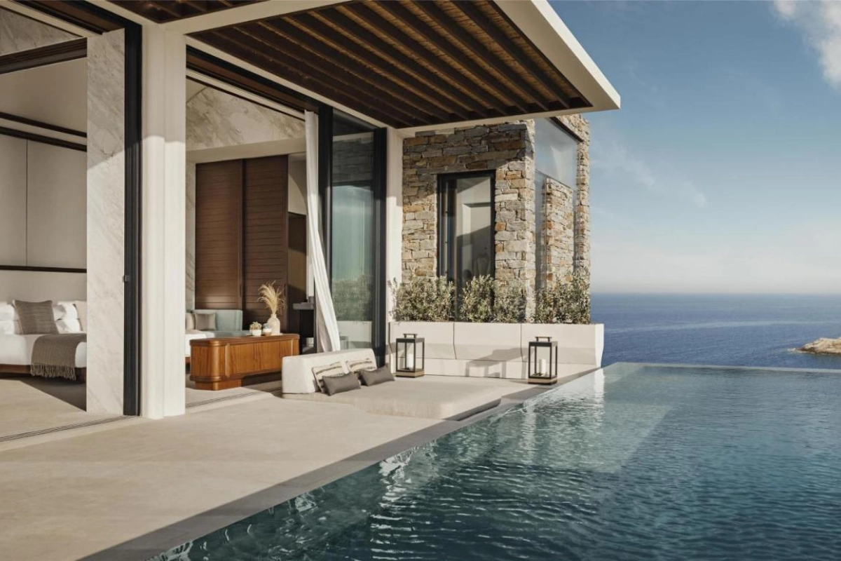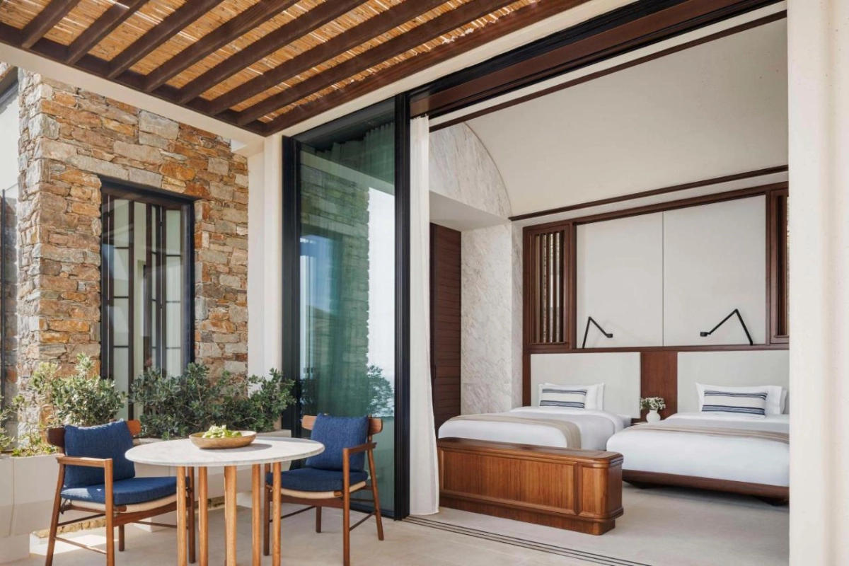 Many villas boast private terraces with infinity pools and fireplaces, offering sweeping Aegean vistas kissed by briny breezes. The design, blending locally sourced stone with sleek minimalism, conjures intimate havens for those seeking an elevated al fresco escape.