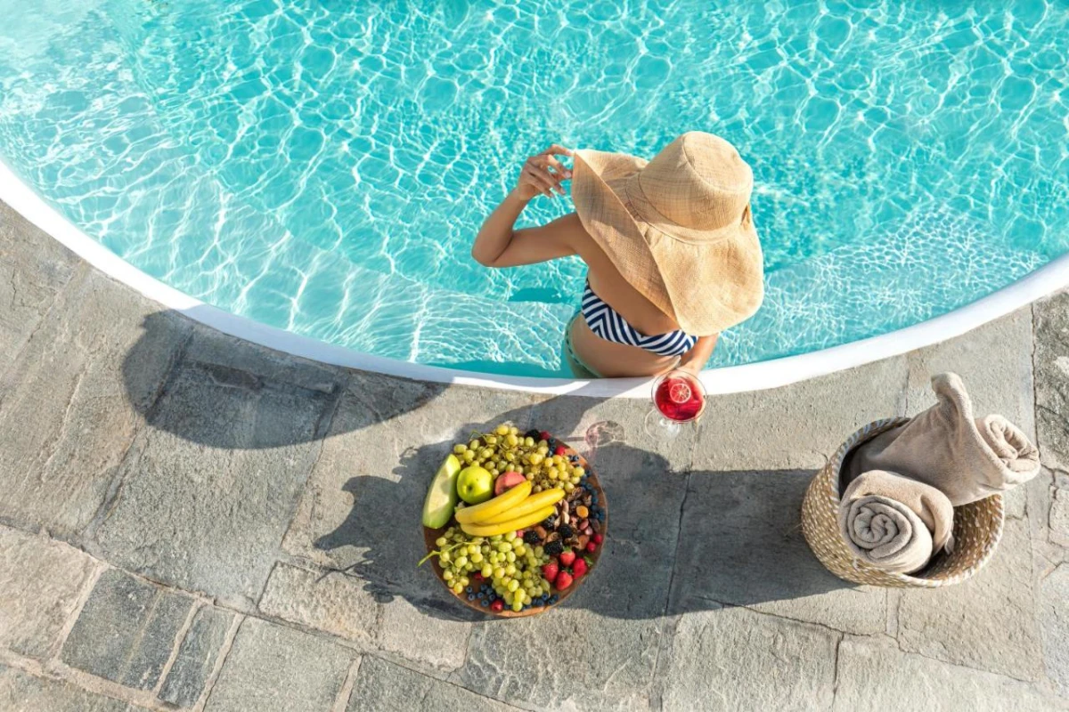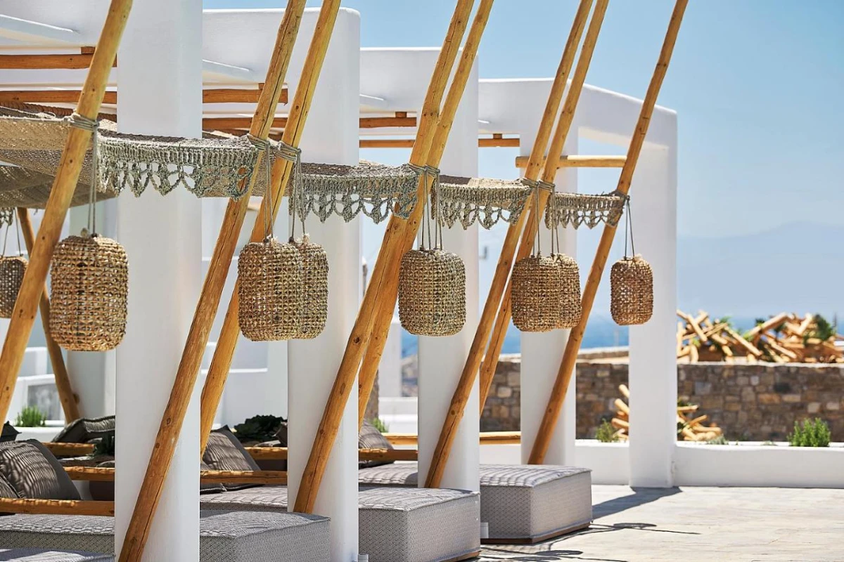 La Veranda restaurant captivates with innovative Mediterranean cuisine, showcasing dishes like grilled octopus with citrus and herb-roasted lamb, crafted from fresh Greek ingredients and paired with local wines. A lavish American breakfast buffet, featuring artisanal pastries, island fruits, and homemade yogurts, is served daily, with private pool guests enjoying the option of a floating breakfast. The lobby bar, overlooking the starlit pool and Aegean Sea, crafts signature cocktails, while the poolside bar offers refreshing drinks and plush lounge-style sunbeds. A snack bar and in-room dining provide additional culinary delights. The sparkling outdoor pool and heated indoor pool invite relaxation, while the lavish spa offers massages, facials, and beauty treatments, complemented by a hammam, hot tub, and sauna. A state-of-the-art fitness centre energizes, and a fashion boutique adds a touch of Mykonian style. The 24-hour concierge curates bespoke experiences, from yacht charters to guided tours of the island's vibrant nightlife.