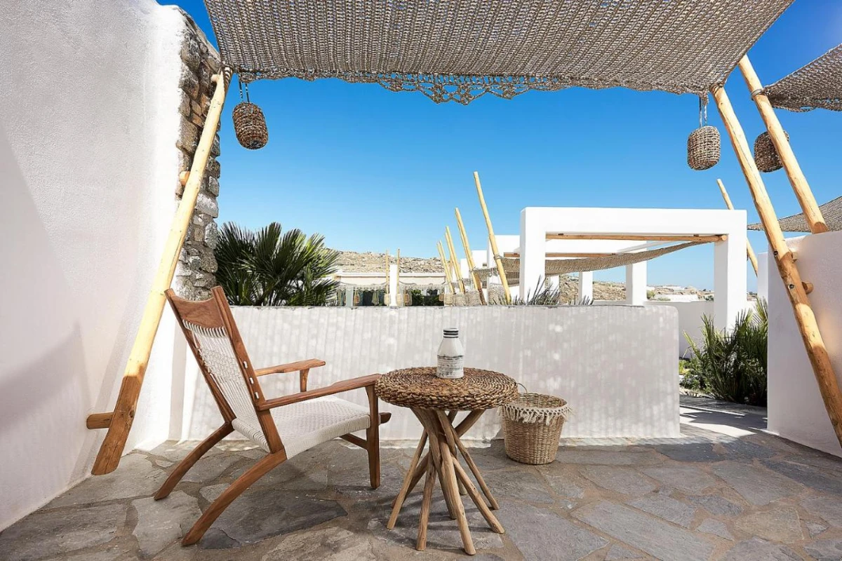 Renovated in 2019, the hotel's 50 rooms and suites exude understated sophistication with handcrafted furnishings, soft linens, and soothing neutral tones. Each air-conditioned space features private balconies with Aegean Sea or garden views, luxurious bathrooms with Korres toiletries, rain showers, bathrobes, and slippers, alongside espresso machines and minibars. Select suites elevate the experience with private pools or hot tubs, creating intimate havens of comfort. Guests are greeted with a complimentary welcome drink, setting the tone for the hotel's warm, tailored service.