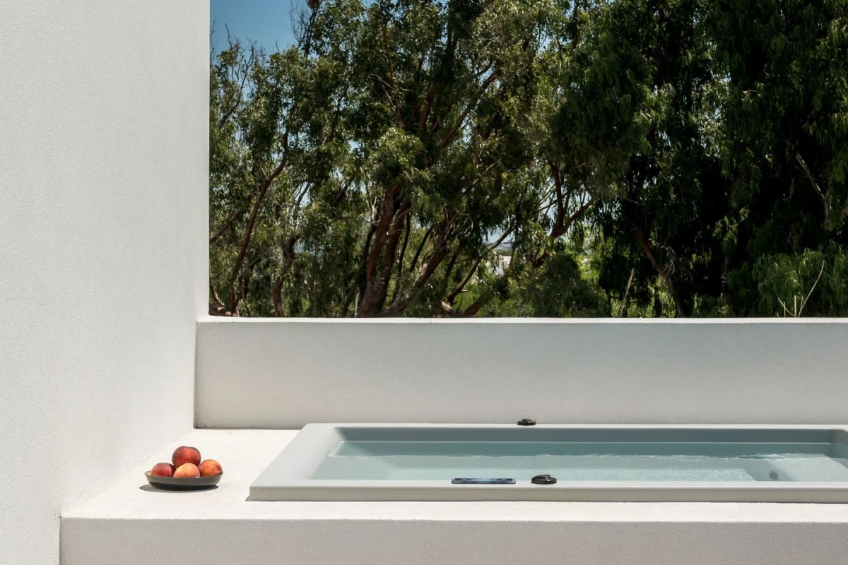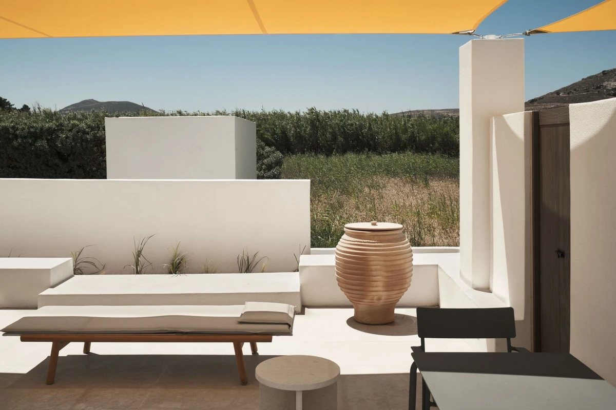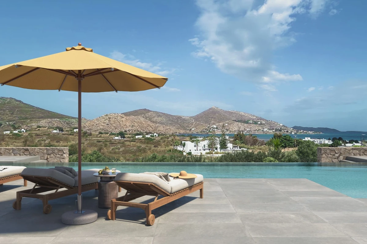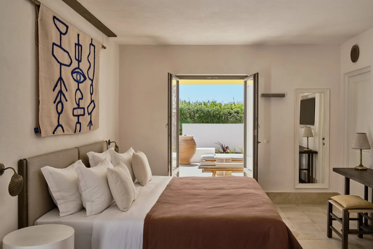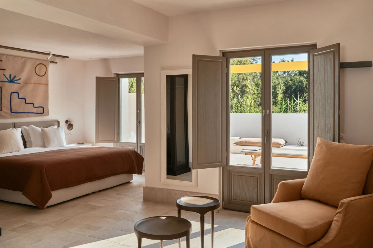 The 33 uniquely designed rooms and suites blend clean lines and natural textures, featuring Egyptian cotton linens, custom-crafted furniture, and marble bathrooms with rain showers and artisanal toiletries. Air-conditioned interiors include espresso machines, spacious wardrobes, and private balconies or terraces framing serene mountain or island views. Select suites offer fully equipped kitchens, adding a touch of home to the sophisticated ambiance. Each space feels like a curated canvas, merging modern comfort with Paros's soulful charm.