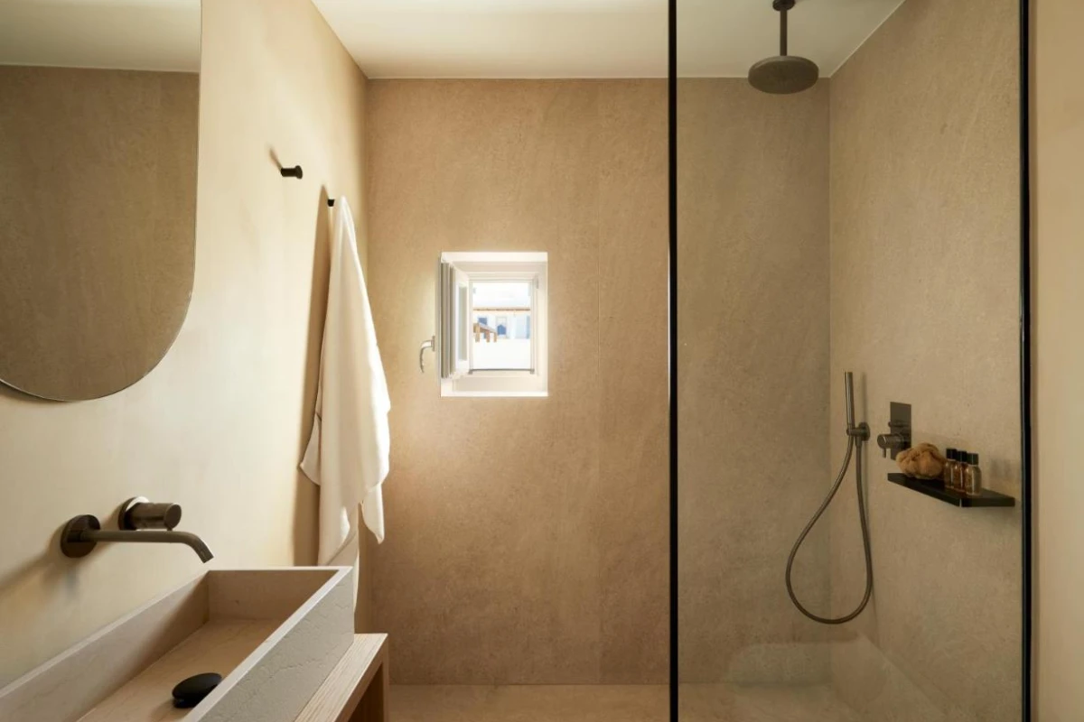 The 30 meticulously designed rooms and suites feature sleek, modern decor with soft linens, custom furnishings, and air-conditioned comfort. Each includes spacious bathrooms with rain showers, premium toiletries, bathrobes, and slippers, alongside espresso machines, minibars, and private balconies or terraces, many unveiling breathtaking Aegean Sea views. The clean lines and neutral tones create a serene ambiance, perfect for an intimate escape or leisurely getaway.