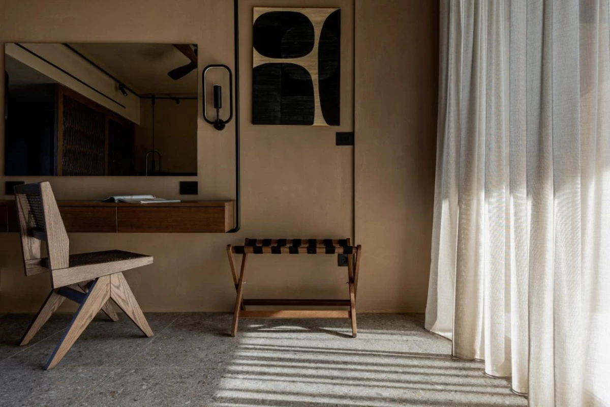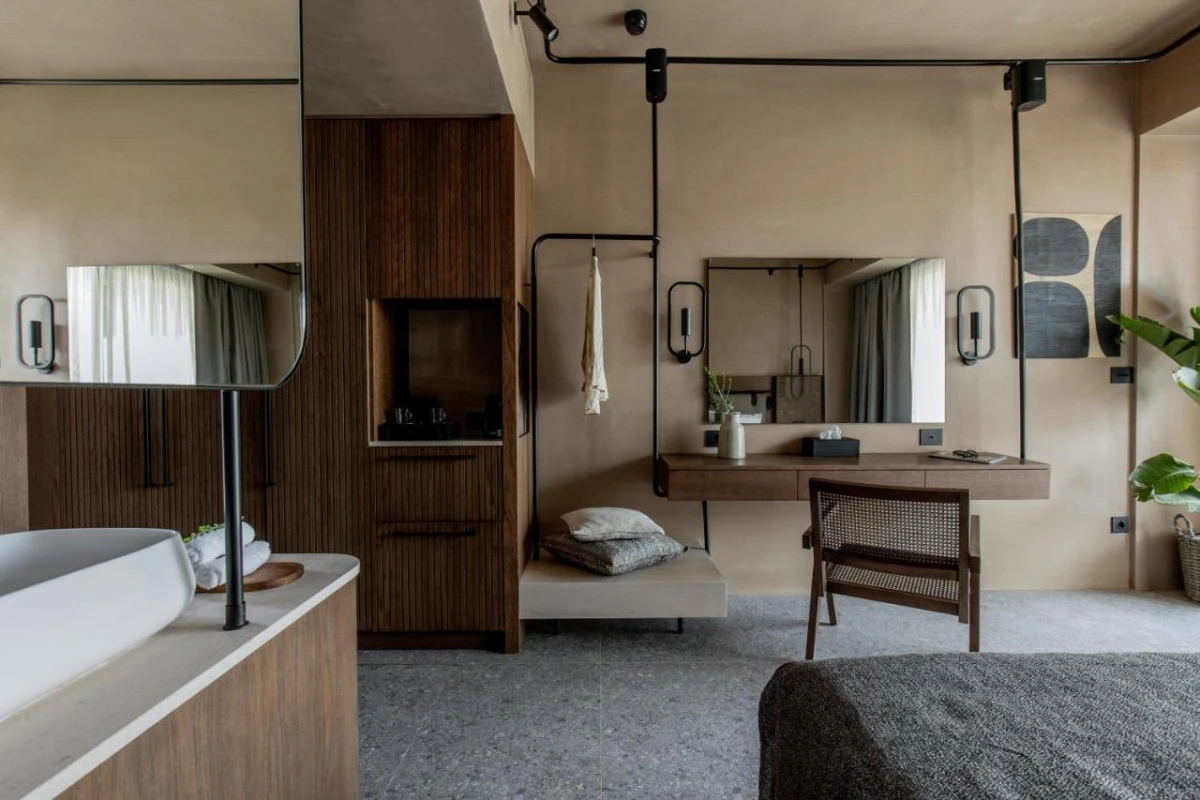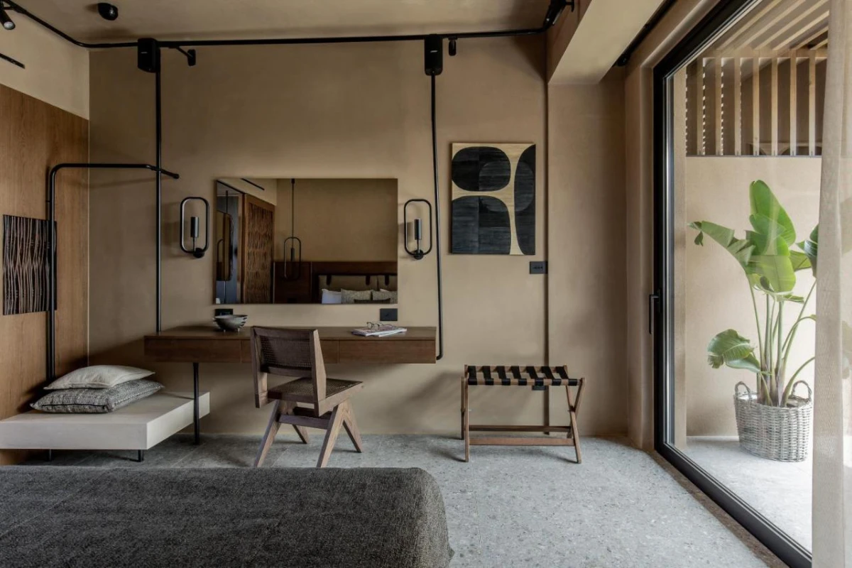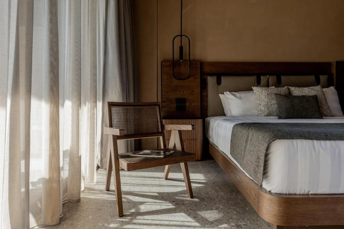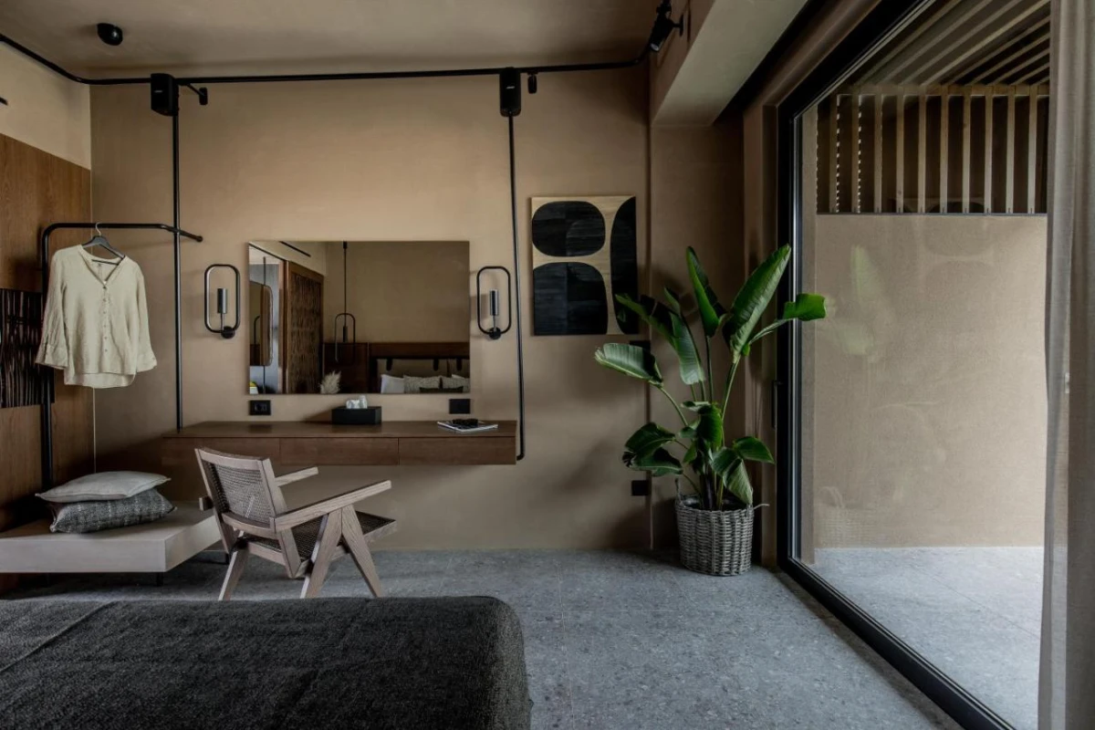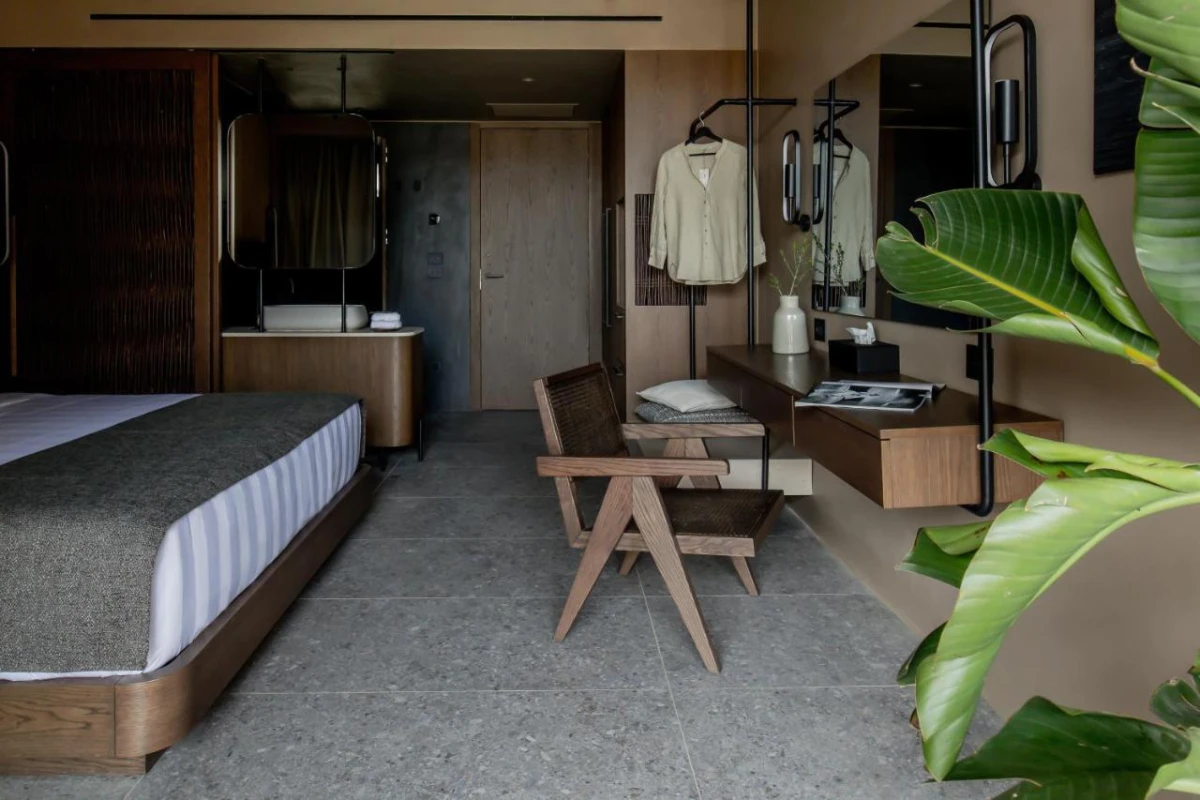 Just 400 meters from Karteros Beach, the hotel's intimate collection of rooms features minimalist design with natural textures, plush bedding, and air-conditioned comfort. Each unit includes flat-screen TVs, coffee machines, fridges, minibars, and private bathrooms with rain showers, artisanal toiletries, and soft robes. Spacious terraces open to lush gardens or sea views, fostering a serene connection to the surroundings, perfect for a restorative escape.