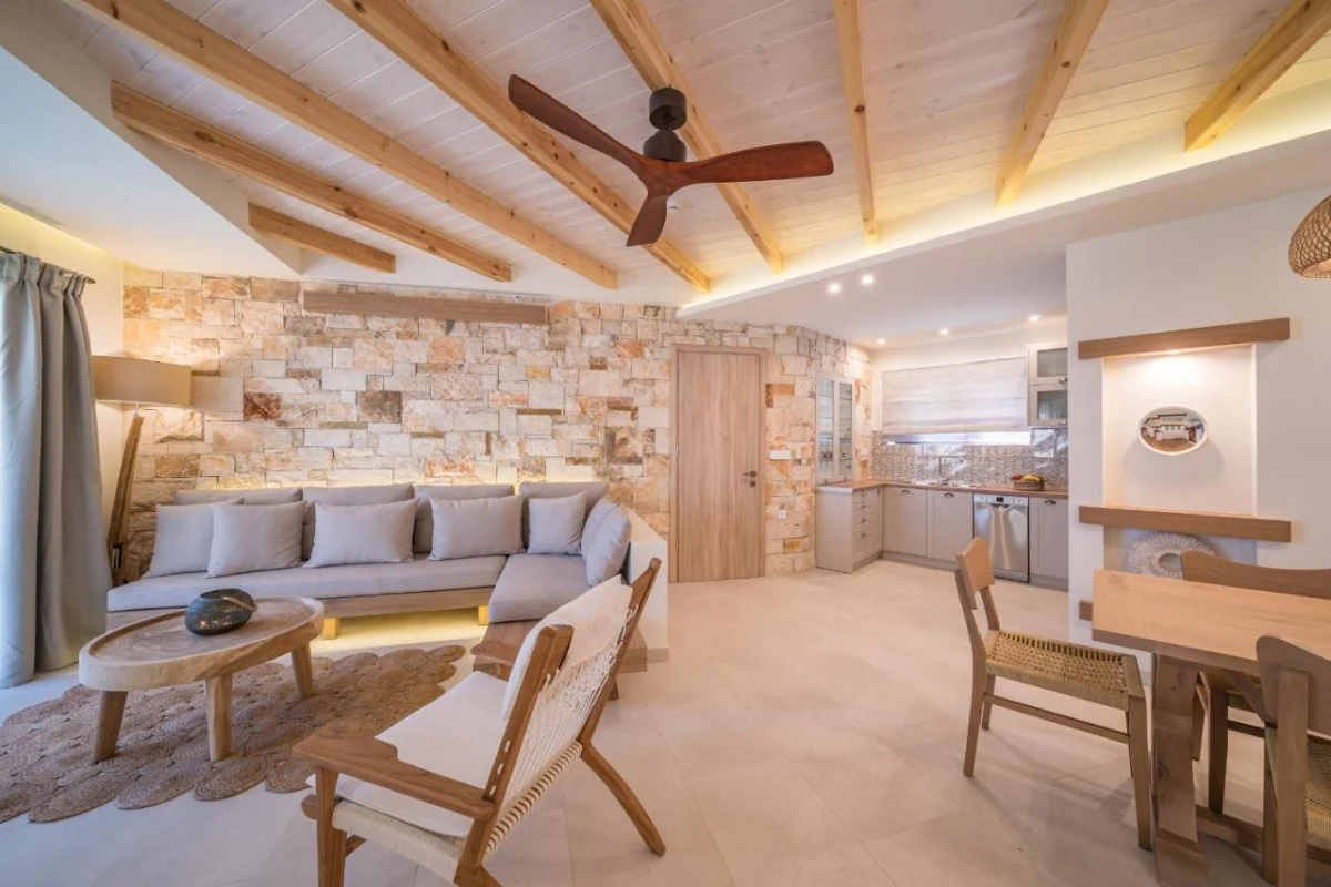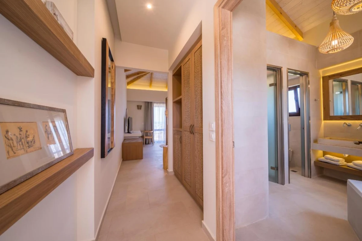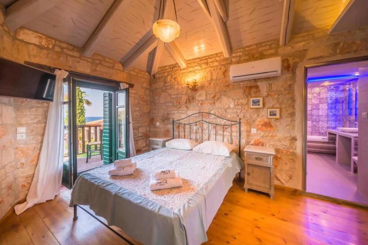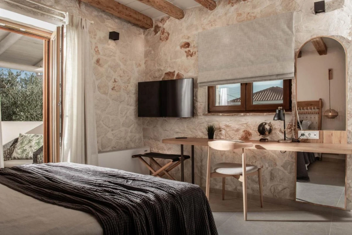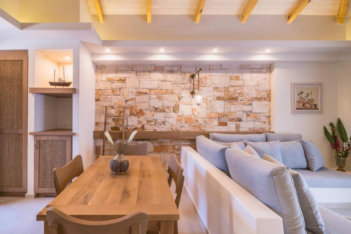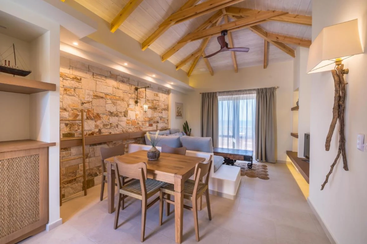The 15 uniquely designed suites and stone villas blend rustic Greek charm with modern luxury, featuring earthy tones, solid wooden ceilings, and handcrafted furnishings. Each air-conditioned unit includes spacious living areas, king-size or twin beds, and private bathrooms with walk-in showers, bathrobes, slippers, and premium toiletries. Private balconies or terraces offer breathtaking Ionian Sea views, while select villas provide fully equipped kitchens with ovens and dishwashers. Large flat-screen TVs, coffee machines, and safes enhance the tranquil, tailored ambiance, perfect for a restful retreat.