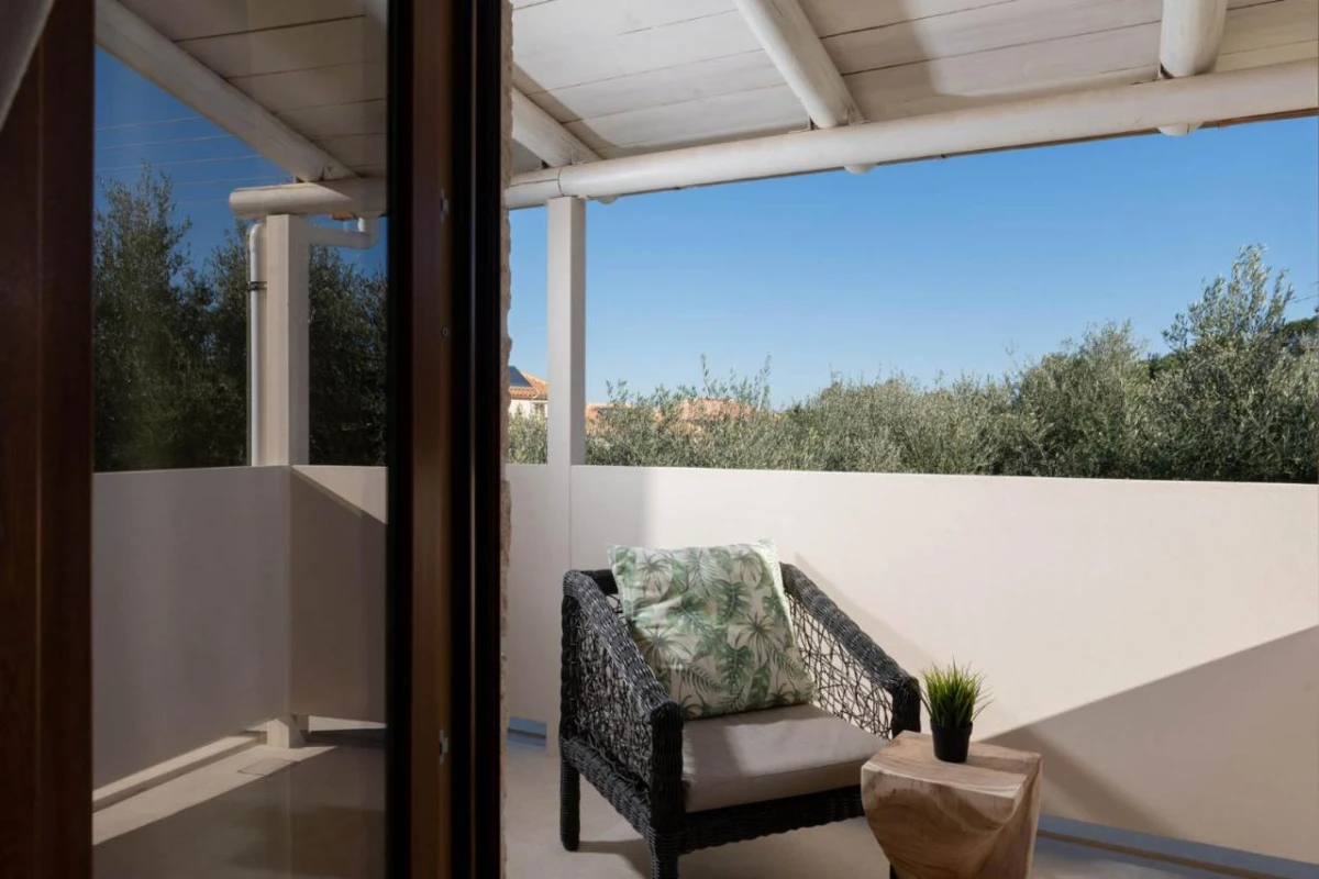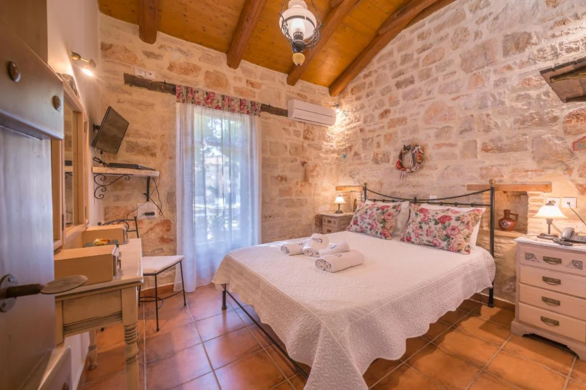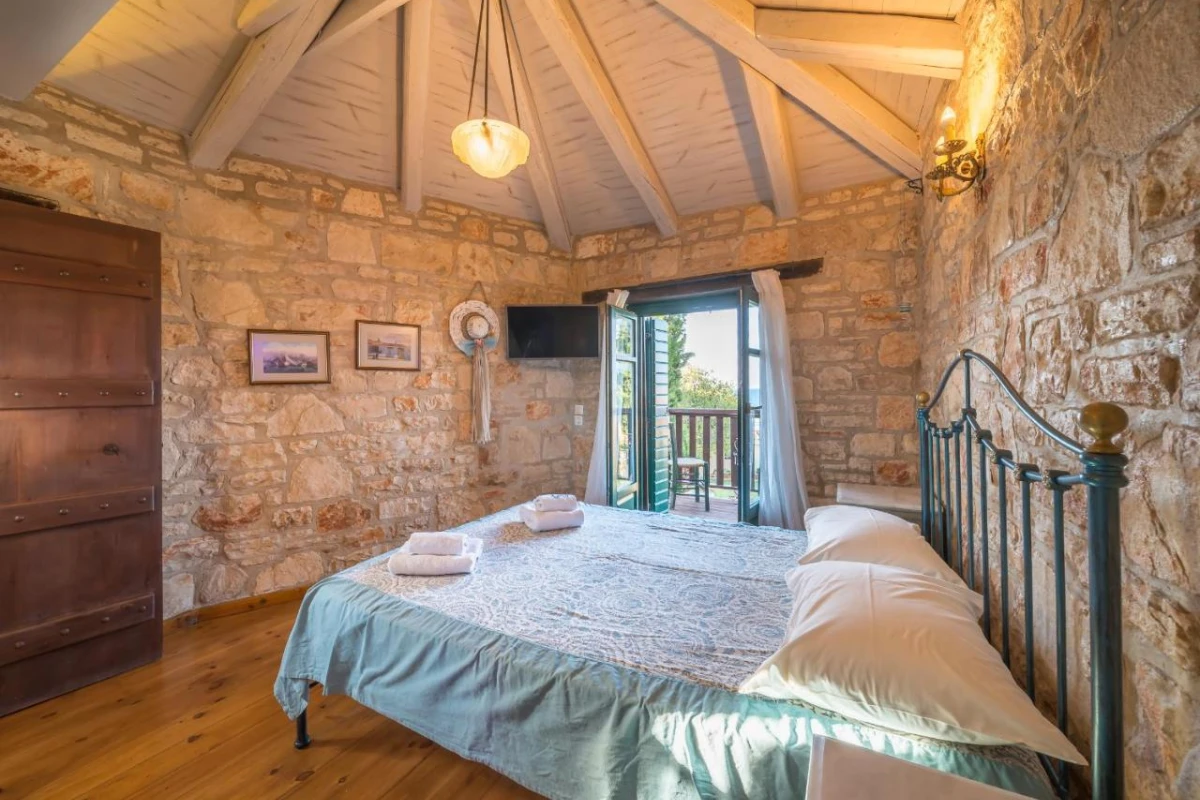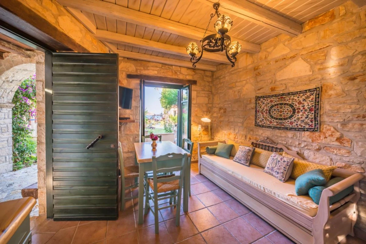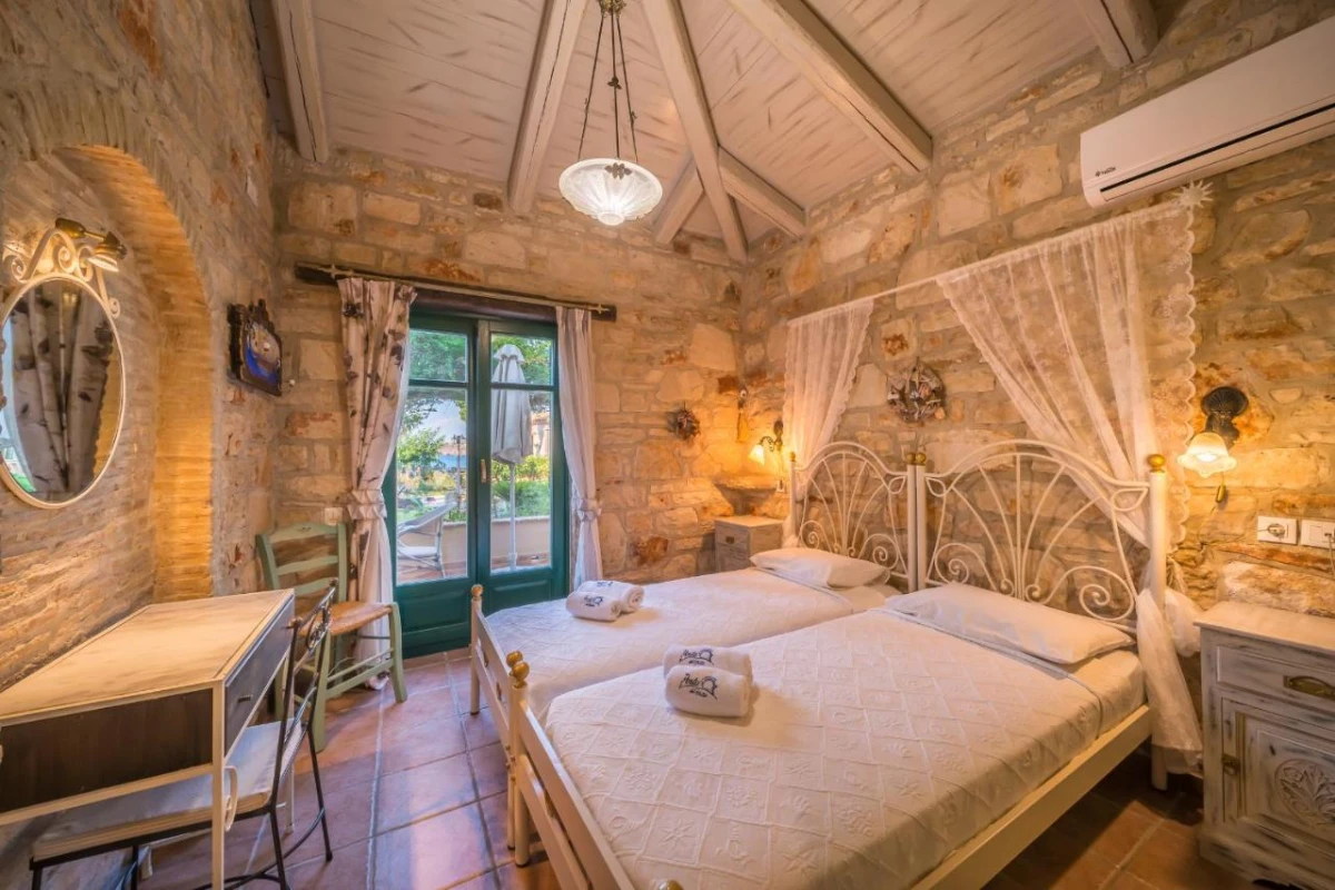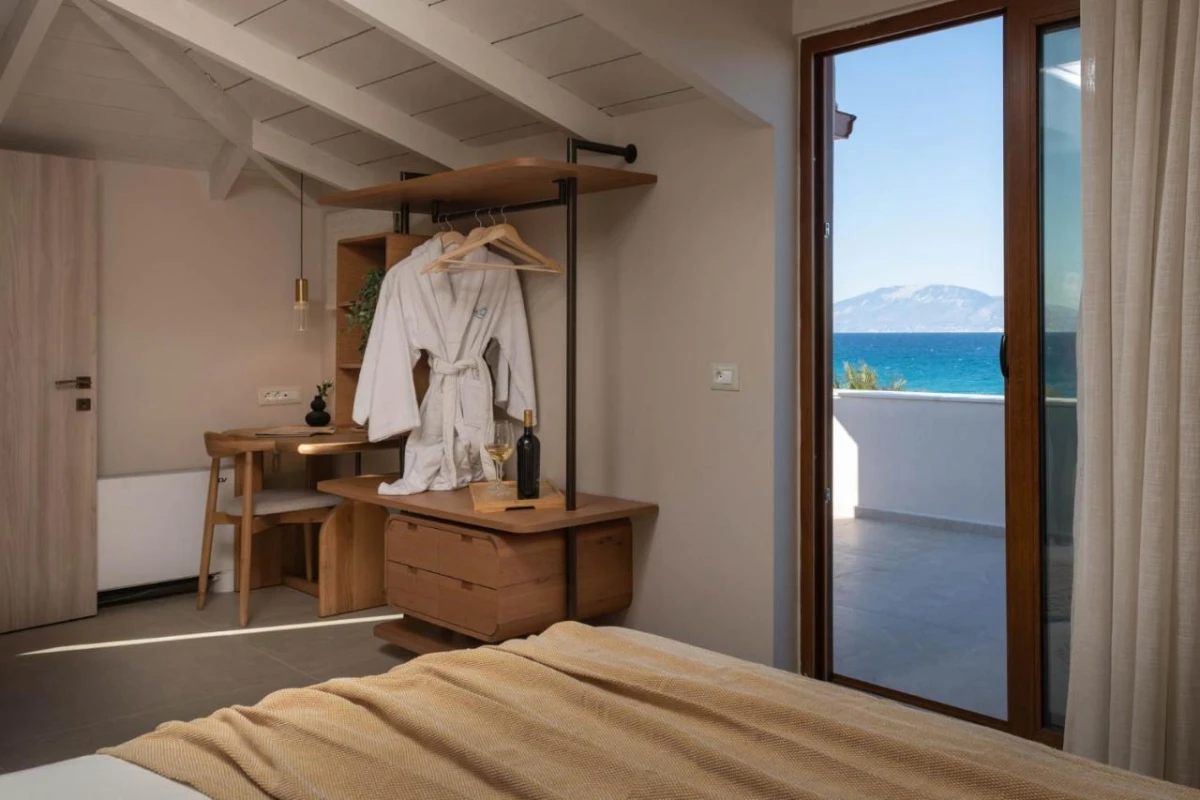 The 15 uniquely designed suites and stone villas blend rustic Greek charm with modern luxury, featuring earthy tones, solid wooden ceilings, and handcrafted furnishings. Each air-conditioned unit includes spacious living areas, king-size or twin beds, and private bathrooms with walk-in showers, bathrobes, slippers, and premium toiletries. Private balconies or terraces offer breathtaking Ionian Sea views, while select villas provide fully equipped kitchens with ovens and dishwashers. Large flat-screen TVs, coffee machines, and safes enhance the tranquil, tailored ambiance, perfect for a restful retreat.