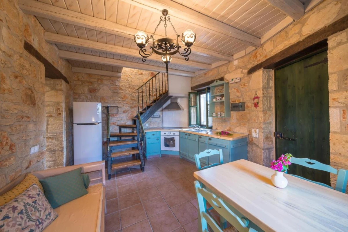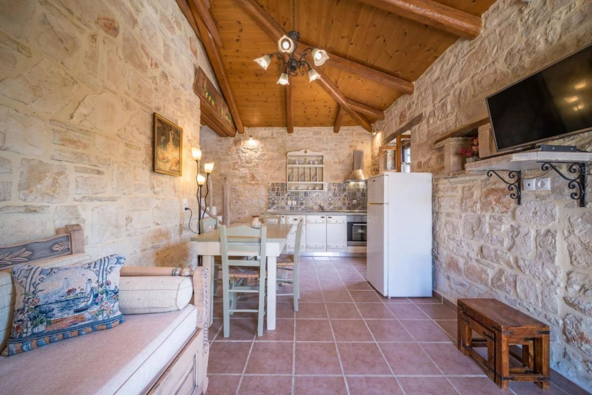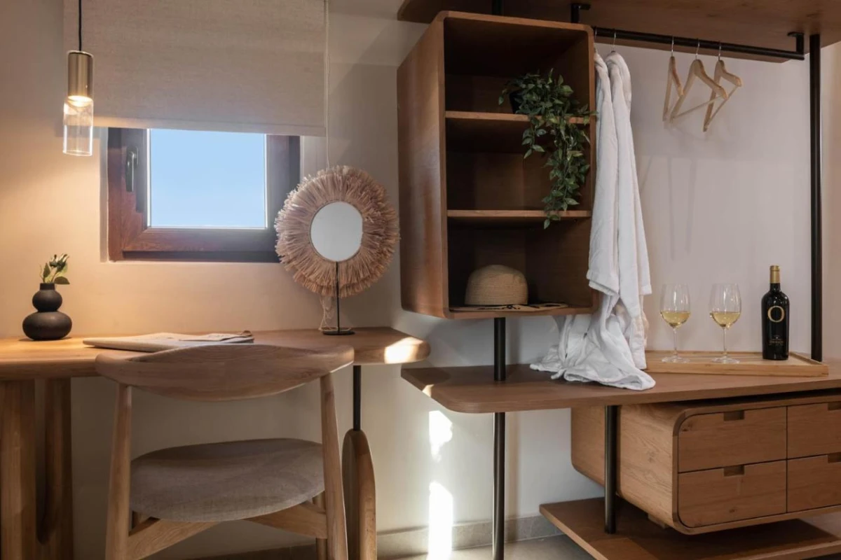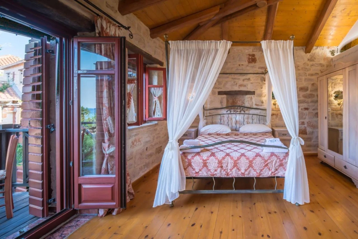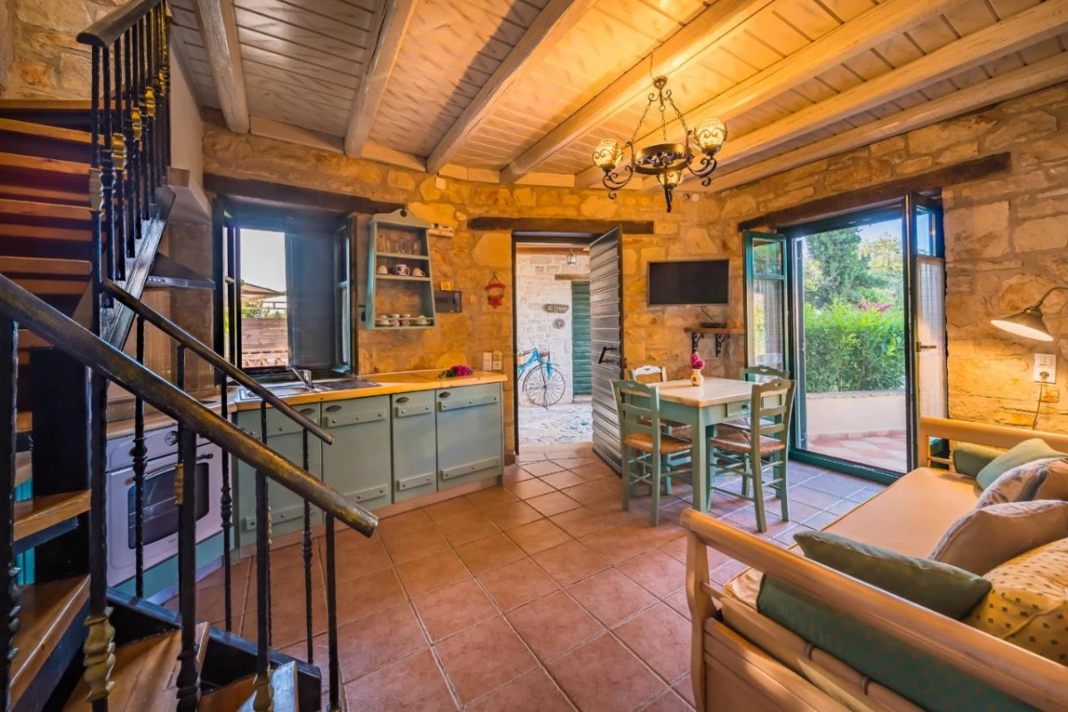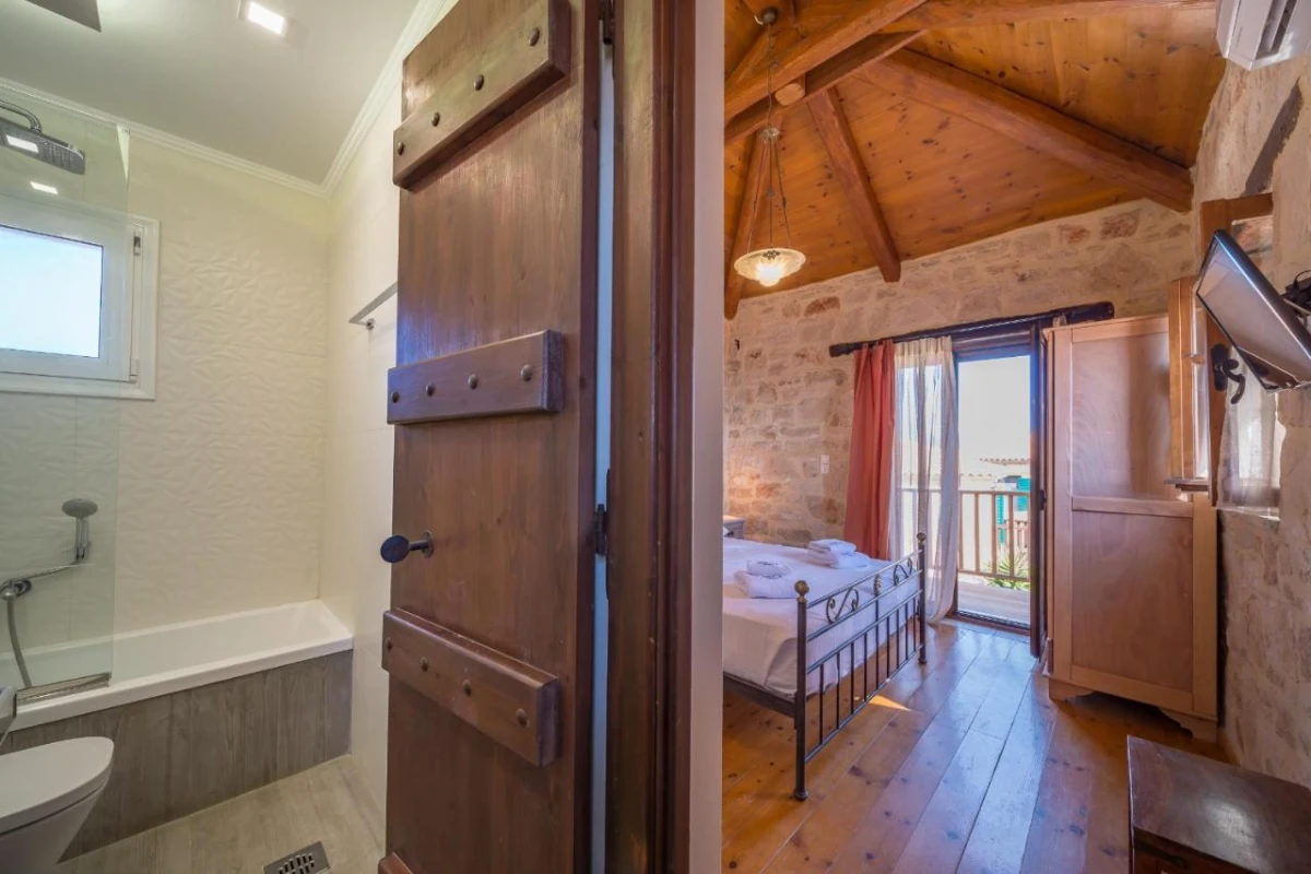 The 15 uniquely designed suites and stone villas blend rustic Greek charm with modern luxury, featuring earthy tones, solid wooden ceilings, and handcrafted furnishings. Each air-conditioned unit includes spacious living areas, king-size or twin beds, and private bathrooms with walk-in showers, bathrobes, slippers, and premium toiletries. Private balconies or terraces offer breathtaking Ionian Sea views, while select villas provide fully equipped kitchens with ovens and dishwashers. Large flat-screen TVs, coffee machines, and safes enhance the tranquil, tailored ambiance, perfect for a restful retreat.