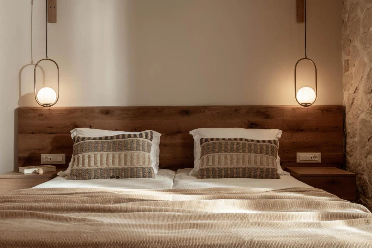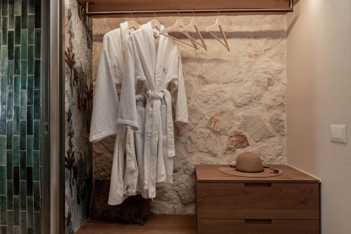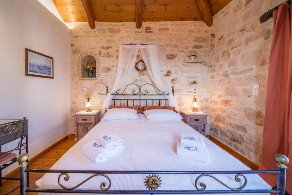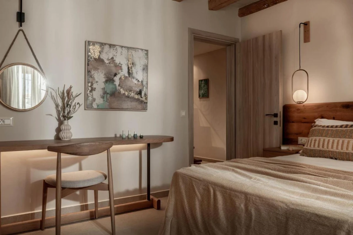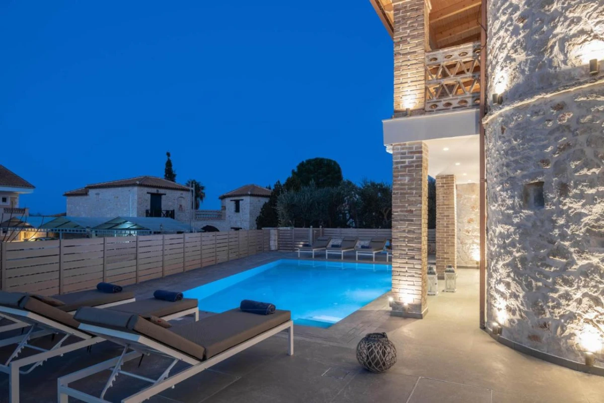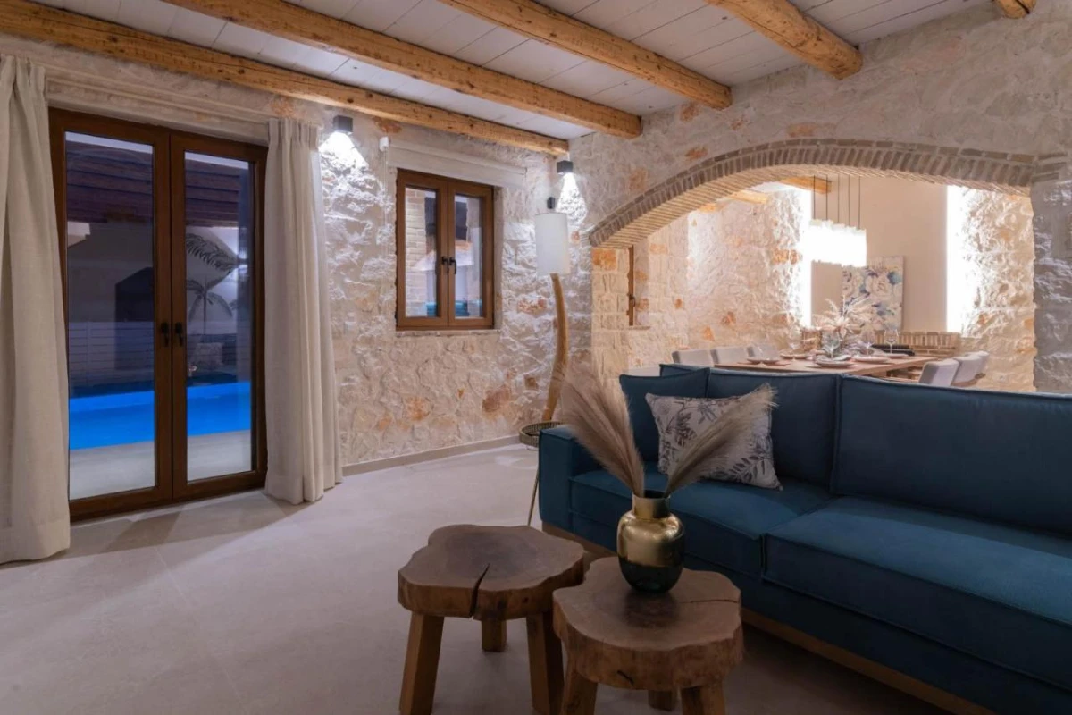 The 15 uniquely designed suites and stone villas blend rustic Greek charm with modern luxury, featuring earthy tones, solid wooden ceilings, and handcrafted furnishings. Each air-conditioned unit includes spacious living areas, king-size or twin beds, and private bathrooms with walk-in showers, bathrobes, slippers, and premium toiletries. Private balconies or terraces offer breathtaking Ionian Sea views, while select villas provide fully equipped kitchens with ovens and dishwashers. Large flat-screen TVs, coffee machines, and safes enhance the tranquil, tailored ambiance, perfect for a restful retreat.