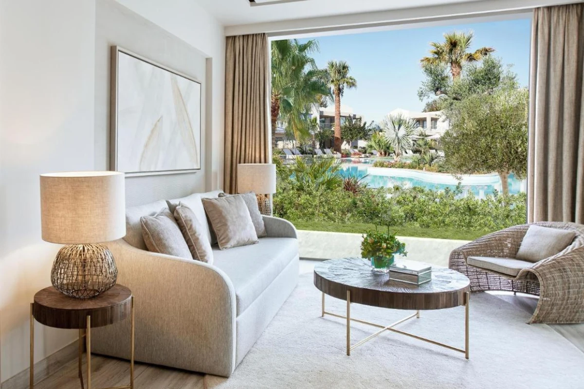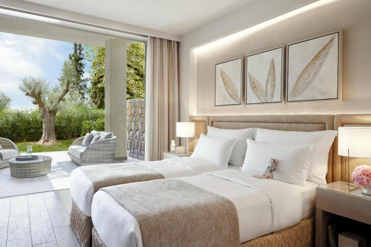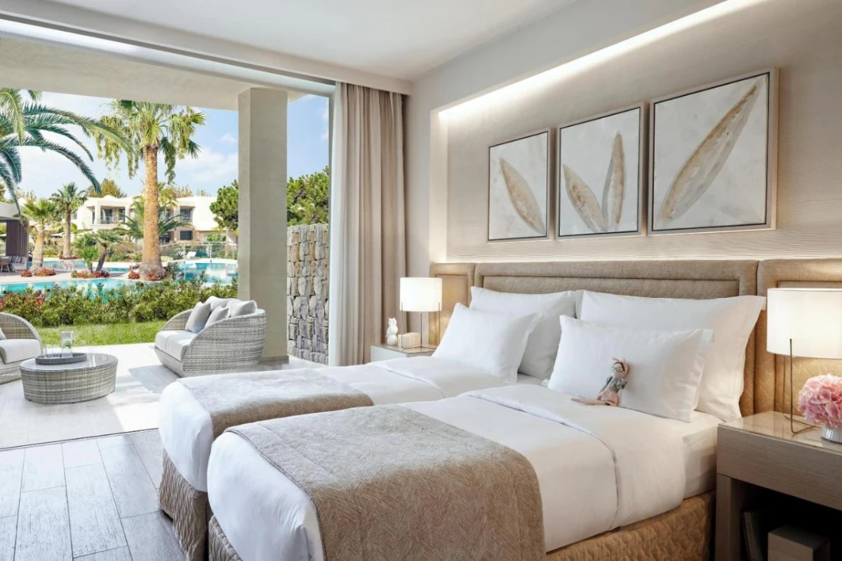 The 148 newly refurbished suites exude refined elegance with earthy tones, handcrafted furnishings, and air-conditioned comfort. Each features plush bedding, spacious bathrooms with bathtubs, premium toiletries, bathrobes, and slippers, alongside flat-screen TVs with DVD players, minibars, and safes. Private balconies open to serene views of the lagoon-style pool, lush gardens, or the Aegean Sea, with some suites boasting four-poster beds for added charm. The thoughtful design creates a tranquil haven, perfect for a tailored getaway.