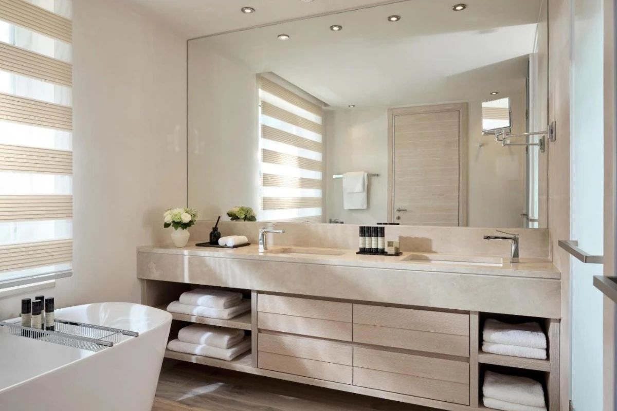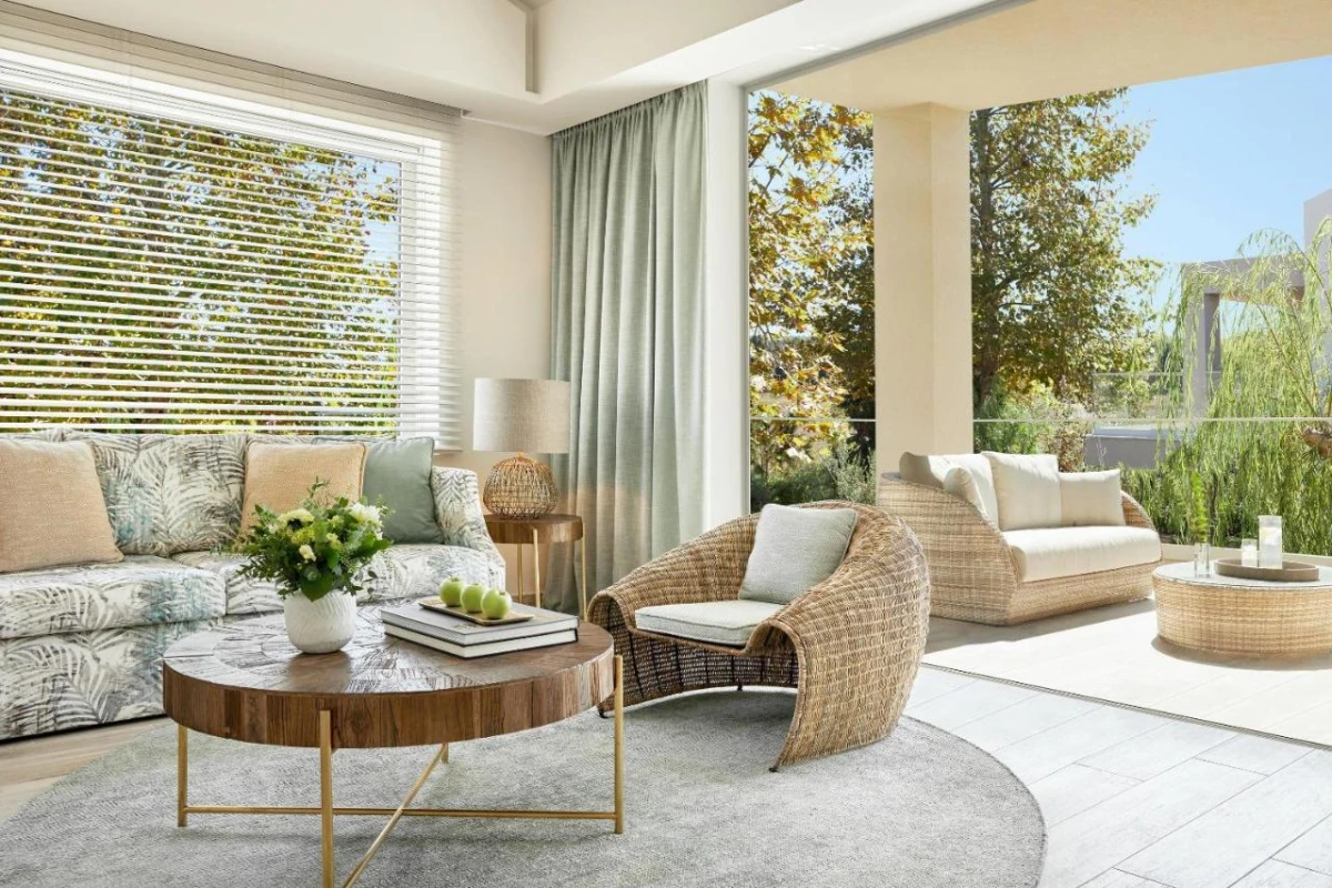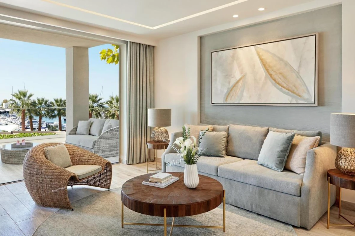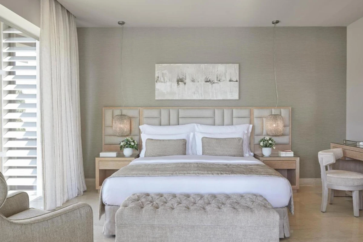 The 148 newly refurbished suites exude refined elegance with earthy tones, handcrafted furnishings, and air-conditioned comfort. Each features plush bedding, spacious bathrooms with bathtubs, premium toiletries, bathrobes, and slippers, alongside flat-screen TVs with DVD players, minibars, and safes. Private balconies open to serene views of the lagoon-style pool, lush gardens, or the Aegean Sea, with some suites boasting four-poster beds for added charm. The thoughtful design creates a tranquil haven, perfect for a tailored getaway.