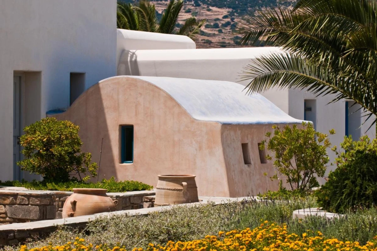 Spanning 42,000 square meters on Cape Choni, the 52 elegantly appointed rooms and suites, built in 1998, blend traditional Cycladic architecture with contemporary comfort. Each air-conditioned space features handcrafted furnishings, anatomical Coco-Mat mattresses, flat-screen TVs, minibars, and private bathrooms with rain showers, luxury toiletries, and hairdryers. Private balconies or terraces unveil breathtaking sea or garden views, with select units offering kitchenettes for added convenience, creating a tranquil haven for relaxation.