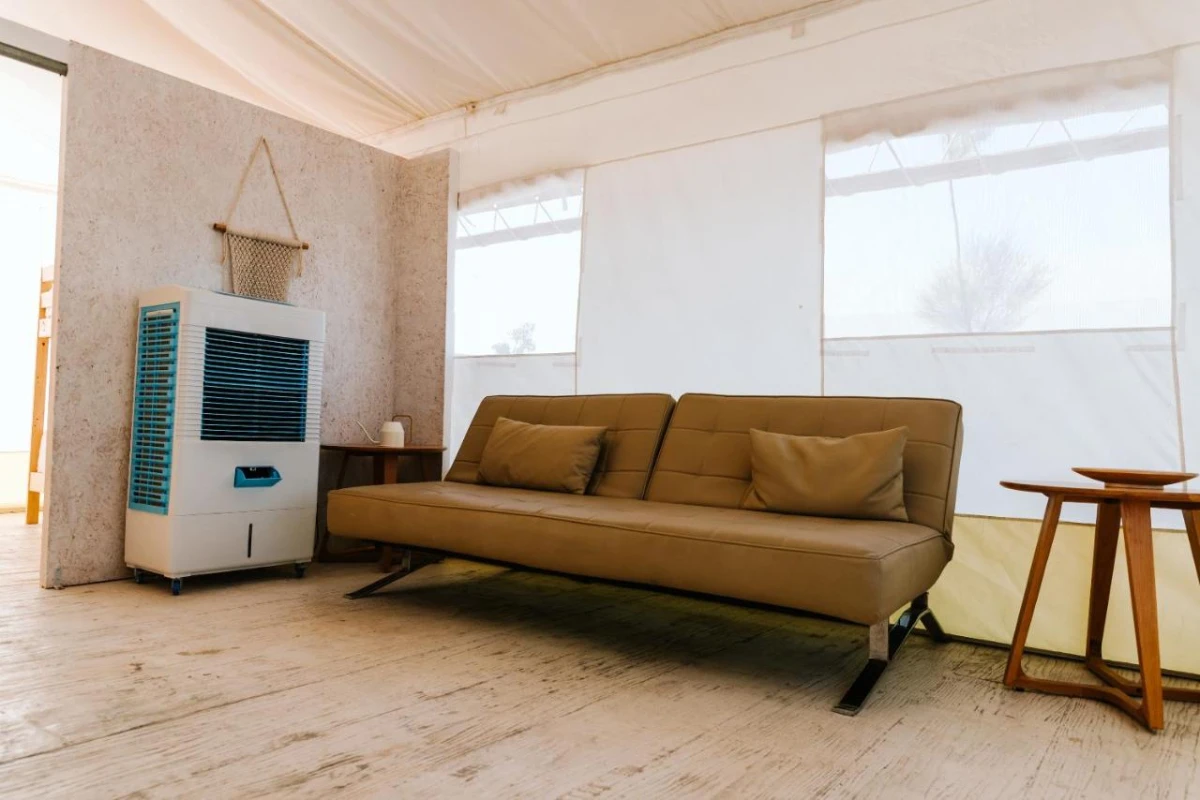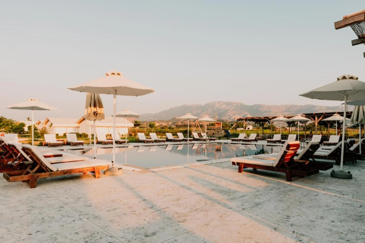 The 26 luxury tented villas and bell tents, available in three sizes, blend rustic allure with refined touches. Each air-conditioned unit features plush linens, towels, and private eco-friendly bathrooms with showers, alongside spacious private gardens or communal grounds. Select villas include seating areas and patios for al fresco dining, with mountain or pool views that invite quiet reflection and connection to nature.