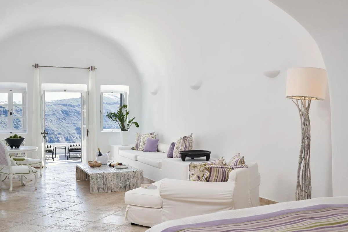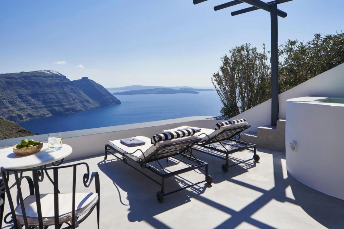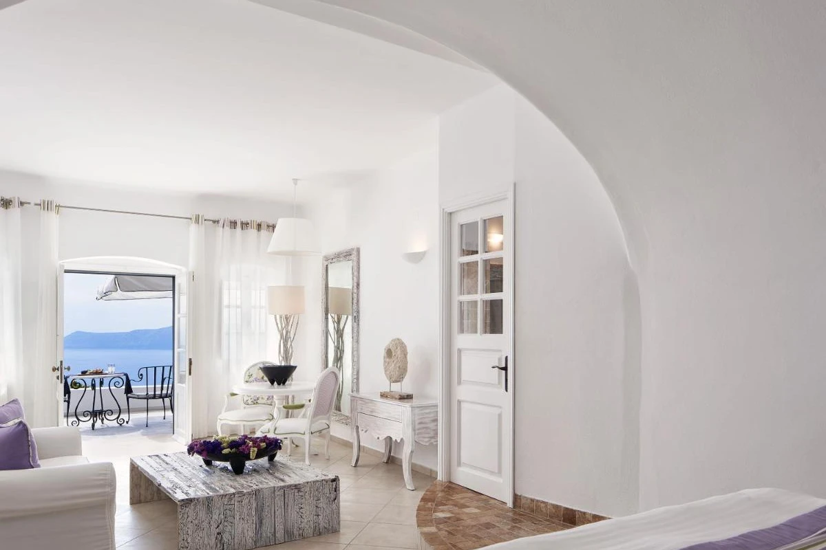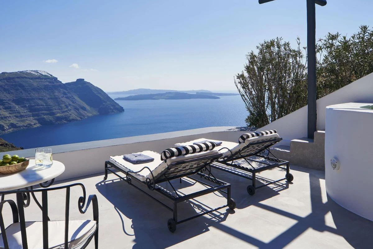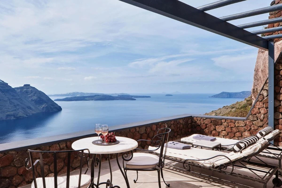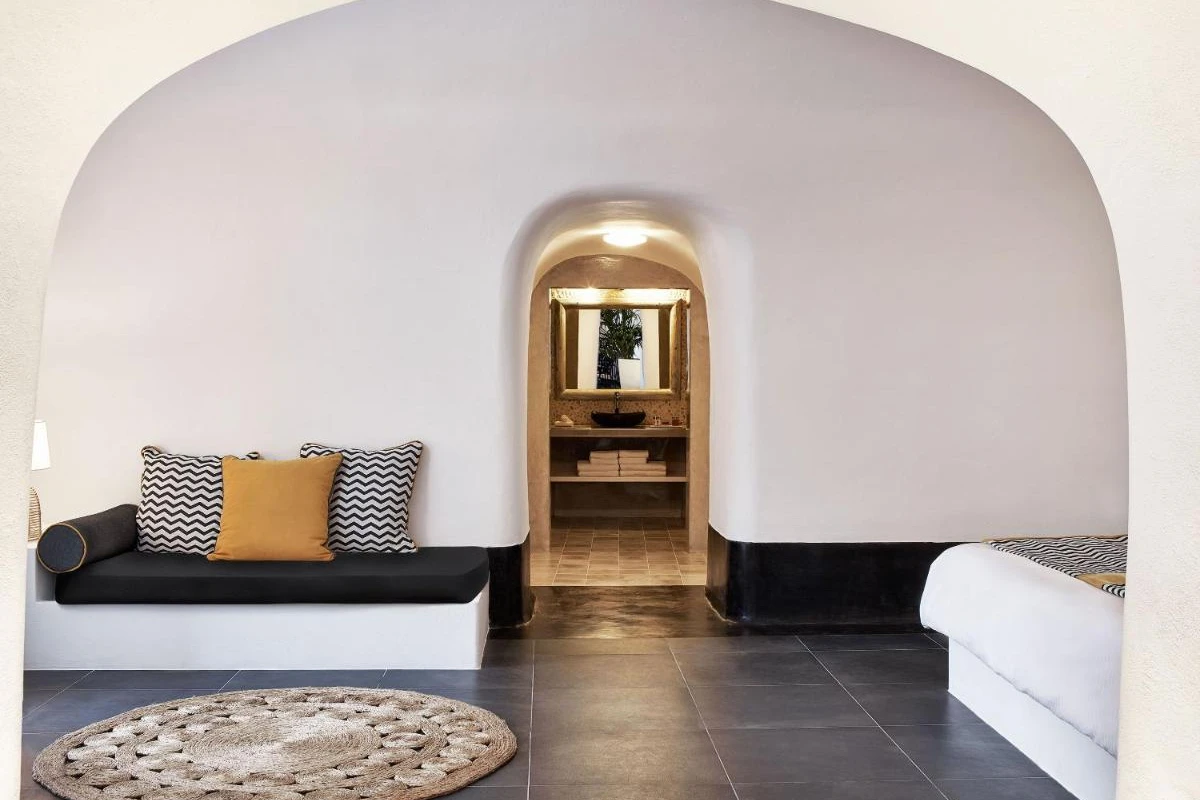 The 26 luxurious suites, seamlessly integrated into volcanic rock, feature earthy tiles, elegant furnishings, and façades of red lava and black stone. Each air-conditioned suite includes plush bedding, flat-screen satellite TVs, bathrobes, slippers, and private bathrooms with rain showers and premium toiletries. Private verandas offer uninterrupted vistas, creating a serene sanctuary that blends Cycladic artistry with modern comfort.