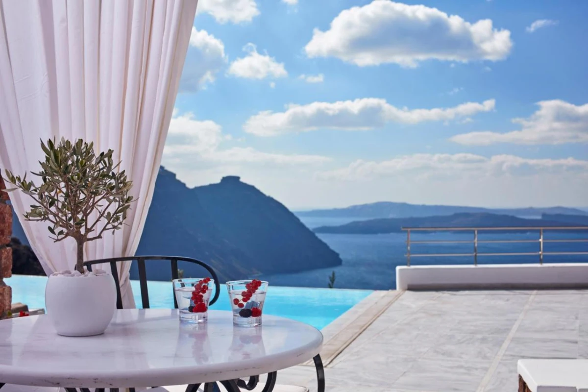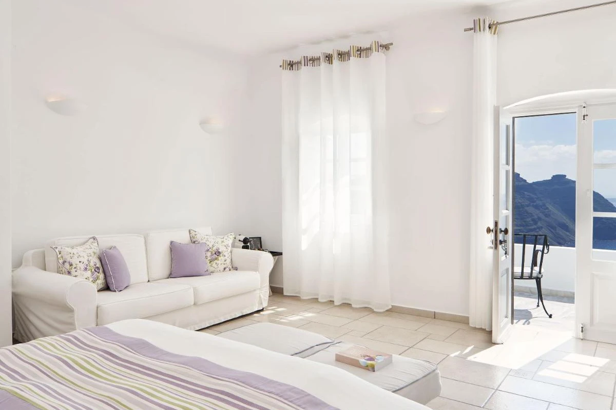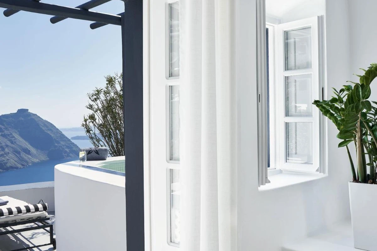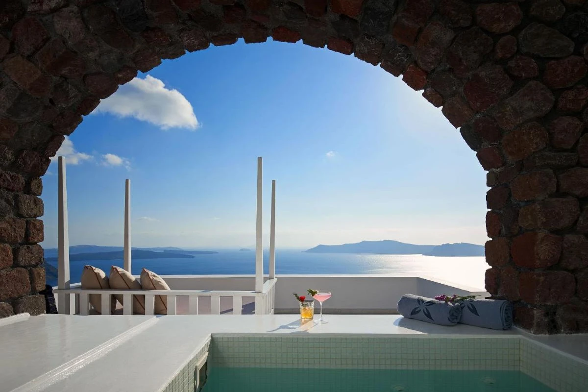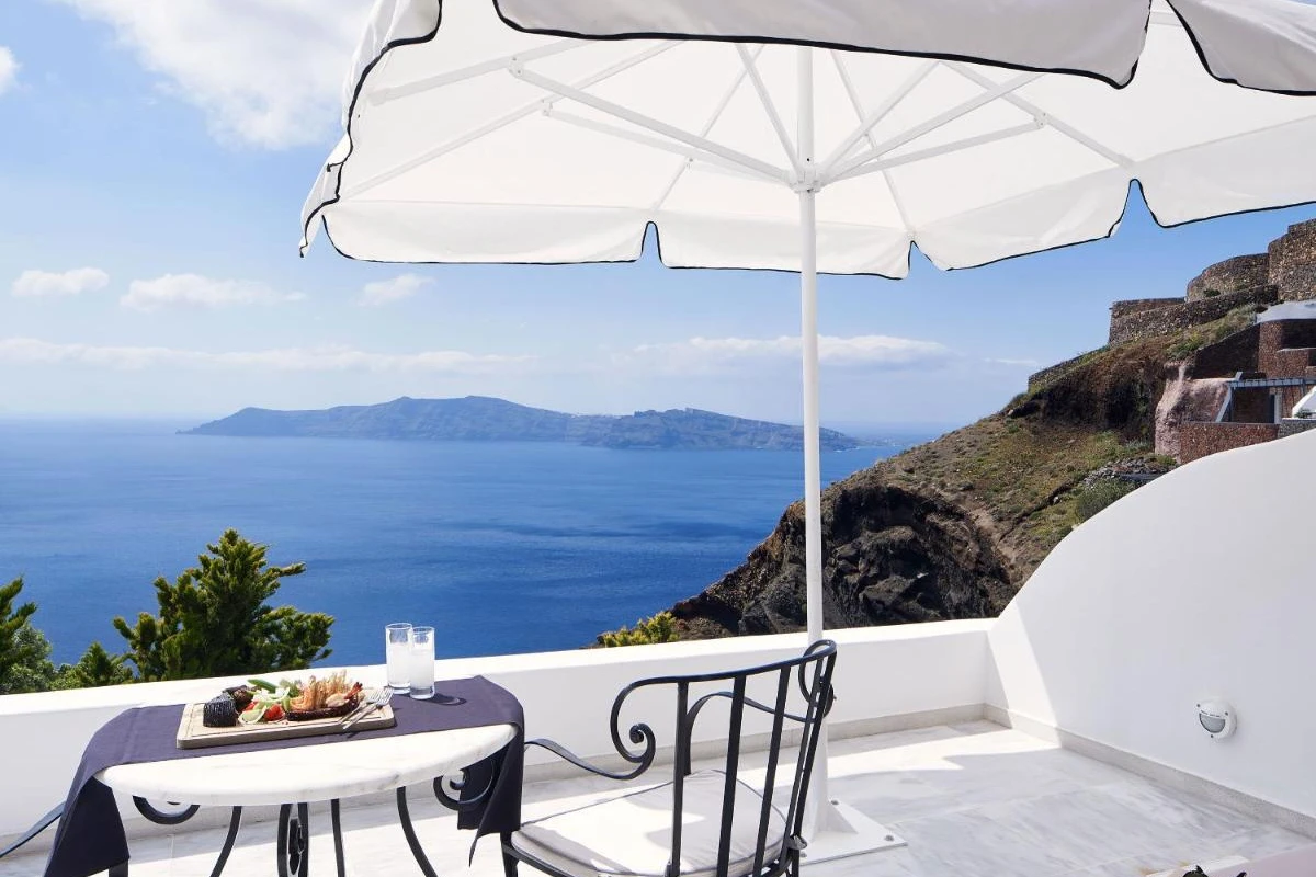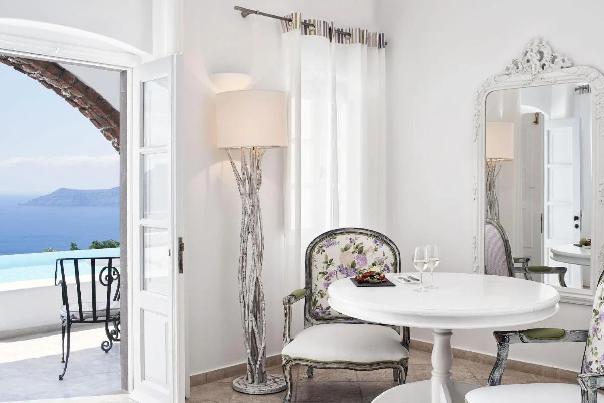 The 26 luxurious suites, seamlessly integrated into volcanic rock, feature earthy tiles, elegant furnishings, and façades of red lava and black stone. Each air-conditioned suite includes plush bedding, flat-screen satellite TVs, bathrobes, slippers, and private bathrooms with rain showers and premium toiletries. Private verandas offer uninterrupted vistas, creating a serene sanctuary that blends Cycladic artistry with modern comfort.