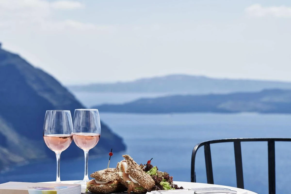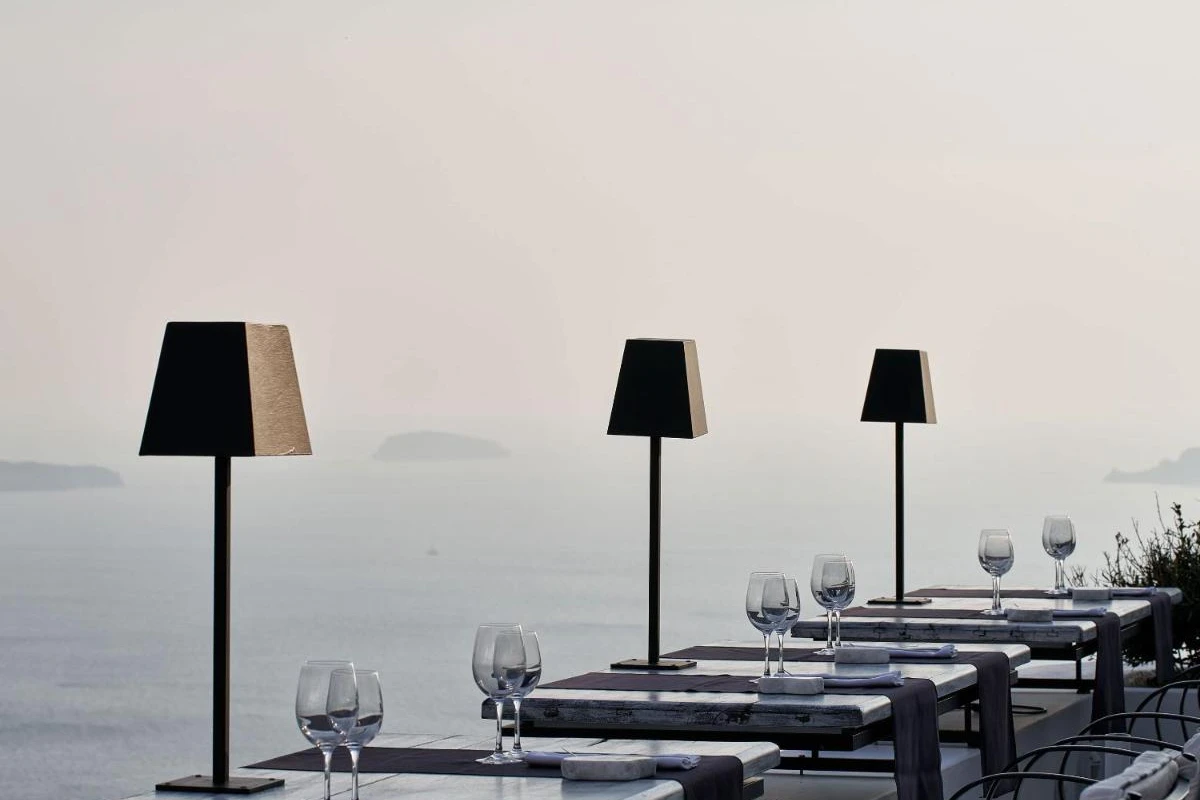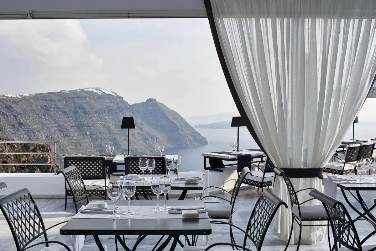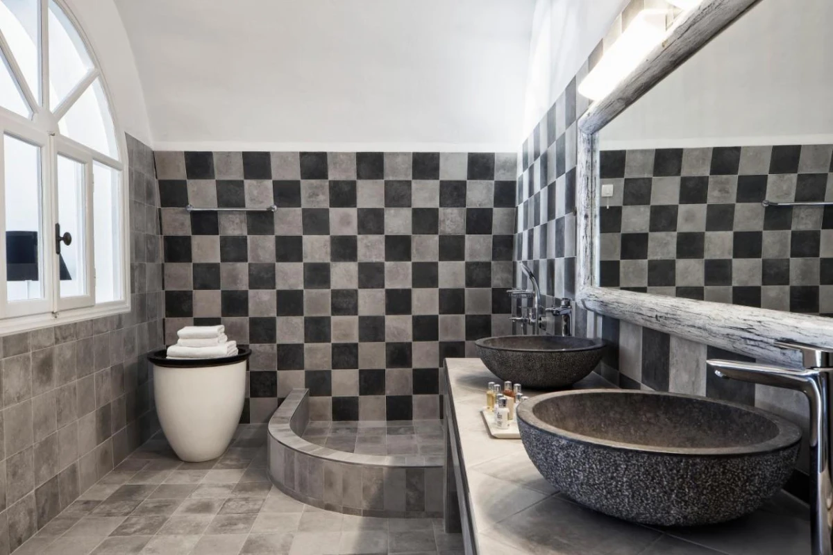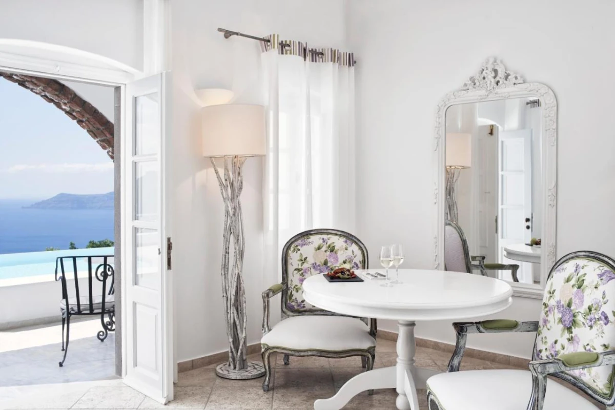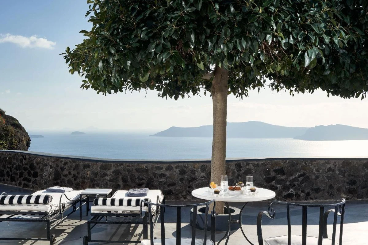The 26 luxurious suites, seamlessly integrated into volcanic rock, feature earthy tiles, elegant furnishings, and façades of red lava and black stone. Each air-conditioned suite includes plush bedding, flat-screen satellite TVs, bathrobes, slippers, and private bathrooms with rain showers and premium toiletries. Private verandas offer uninterrupted vistas, creating a serene sanctuary that blends Cycladic artistry with modern comfort.