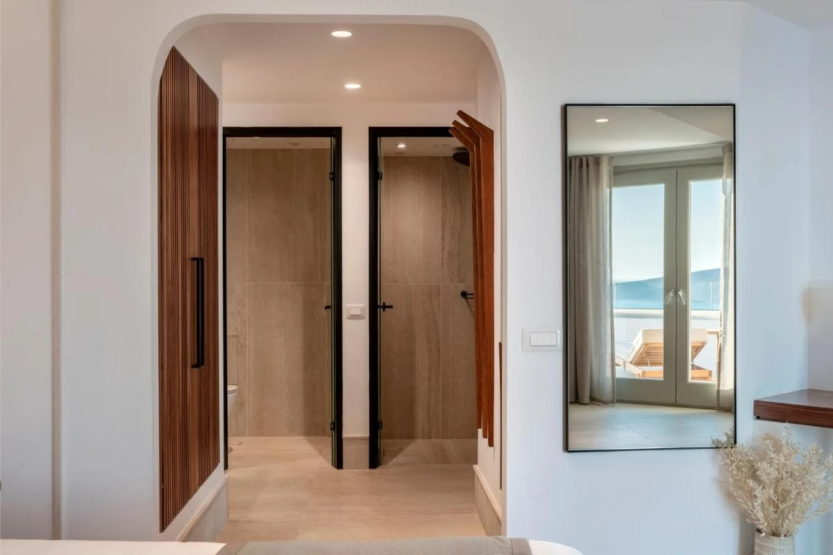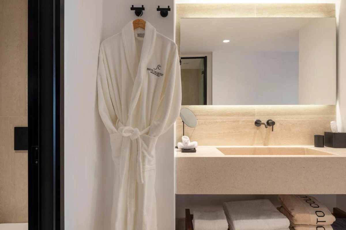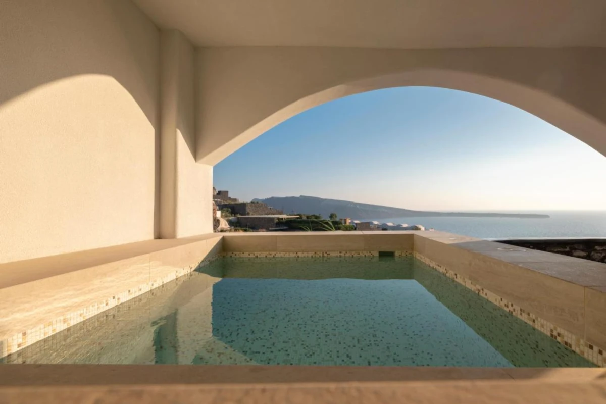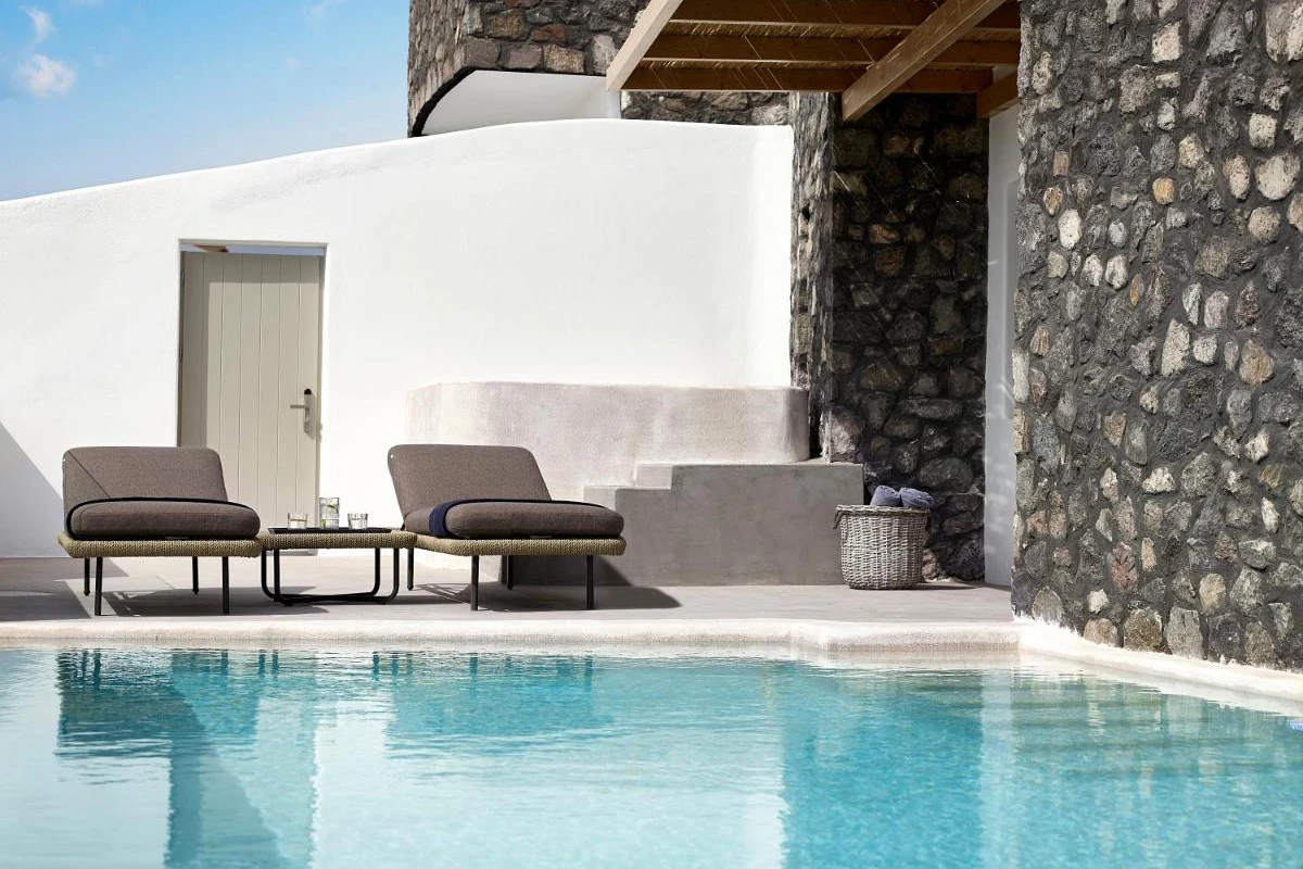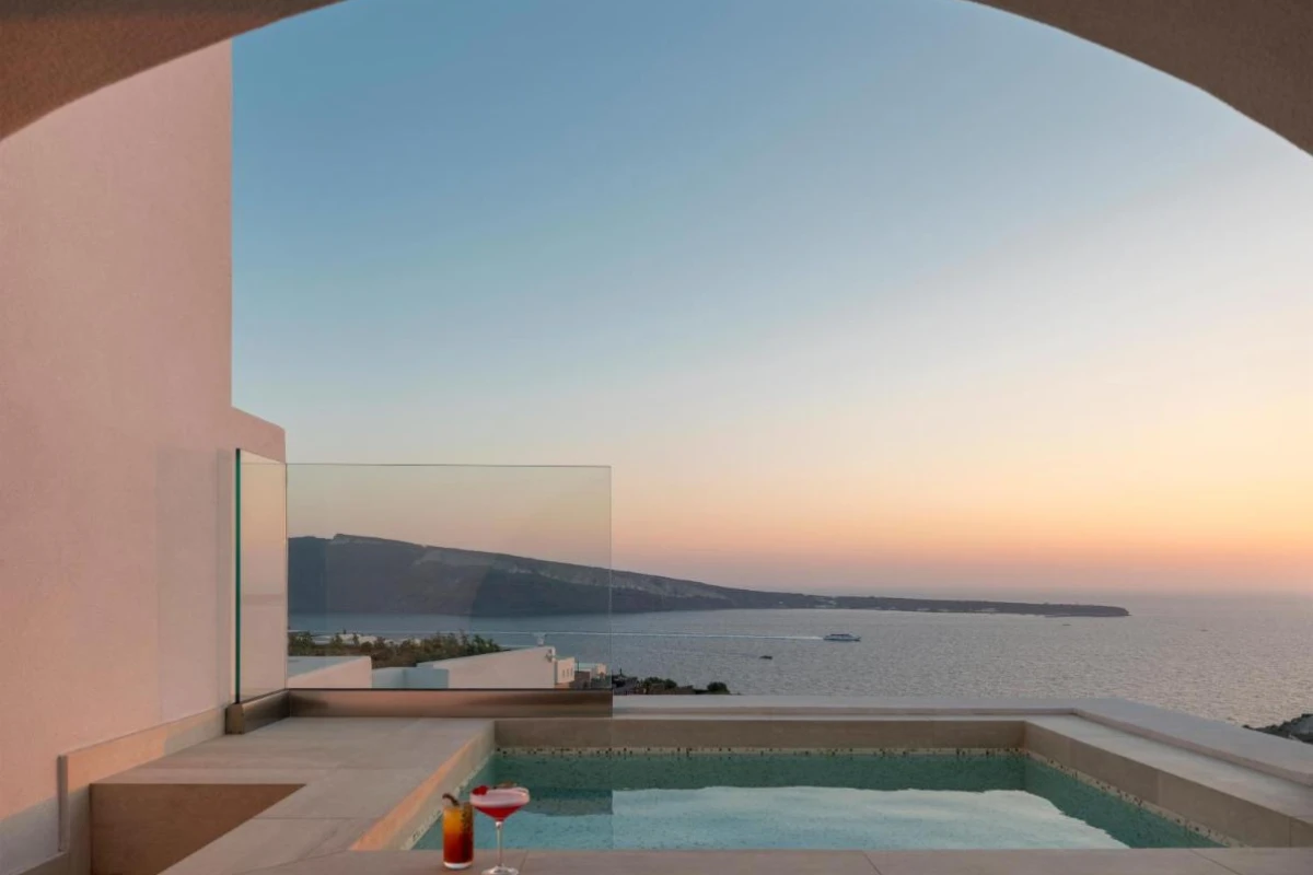 Enveloped by lush greenery and whitewashed domes, the 65 elegant suites and villas blend Cycladic architecture with contemporary lava-black and white tones. Each air-conditioned unit features plush bedding, flat-screen TVs with satellite channels, kitchenettes with dining areas, kettles, minibars, and luxurious bathrooms with rain showers or bathtubs, premium toiletries, and bathrobes. Private verandas with heated jacuzzis and plush sun-loungers unveil breathtaking caldera vistas, creating a serene sanctuary for laid-back luxury.