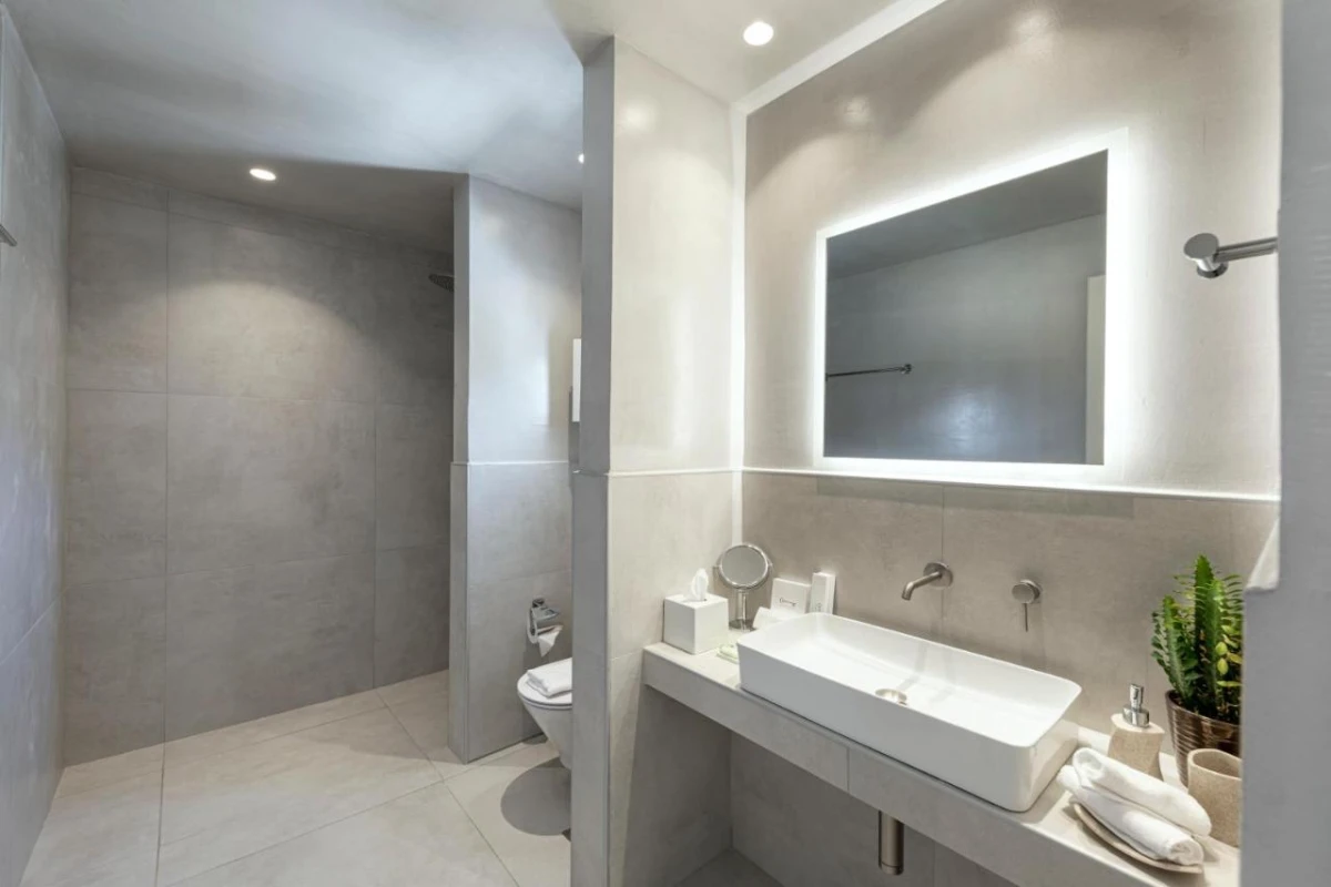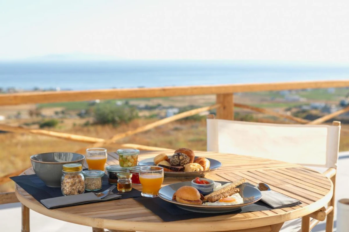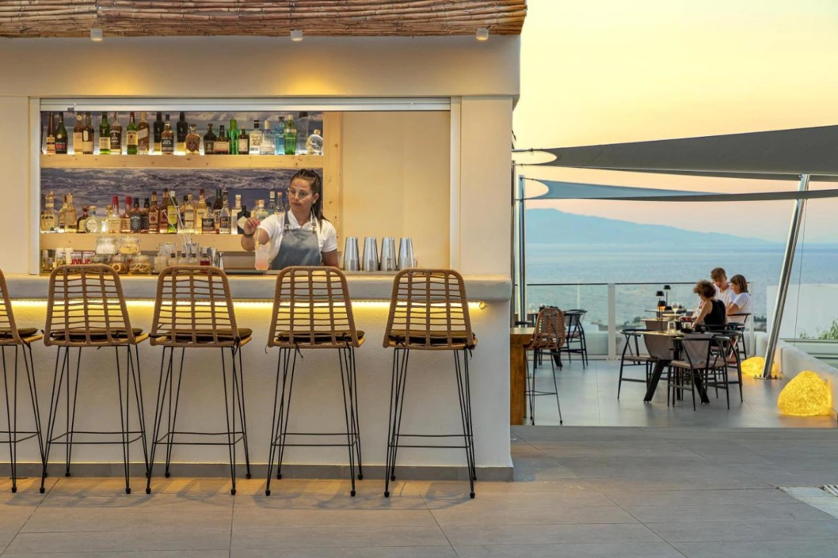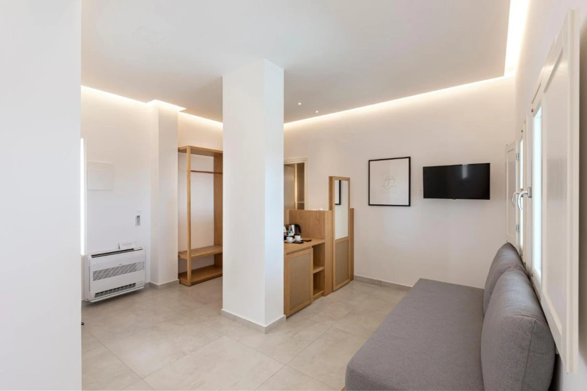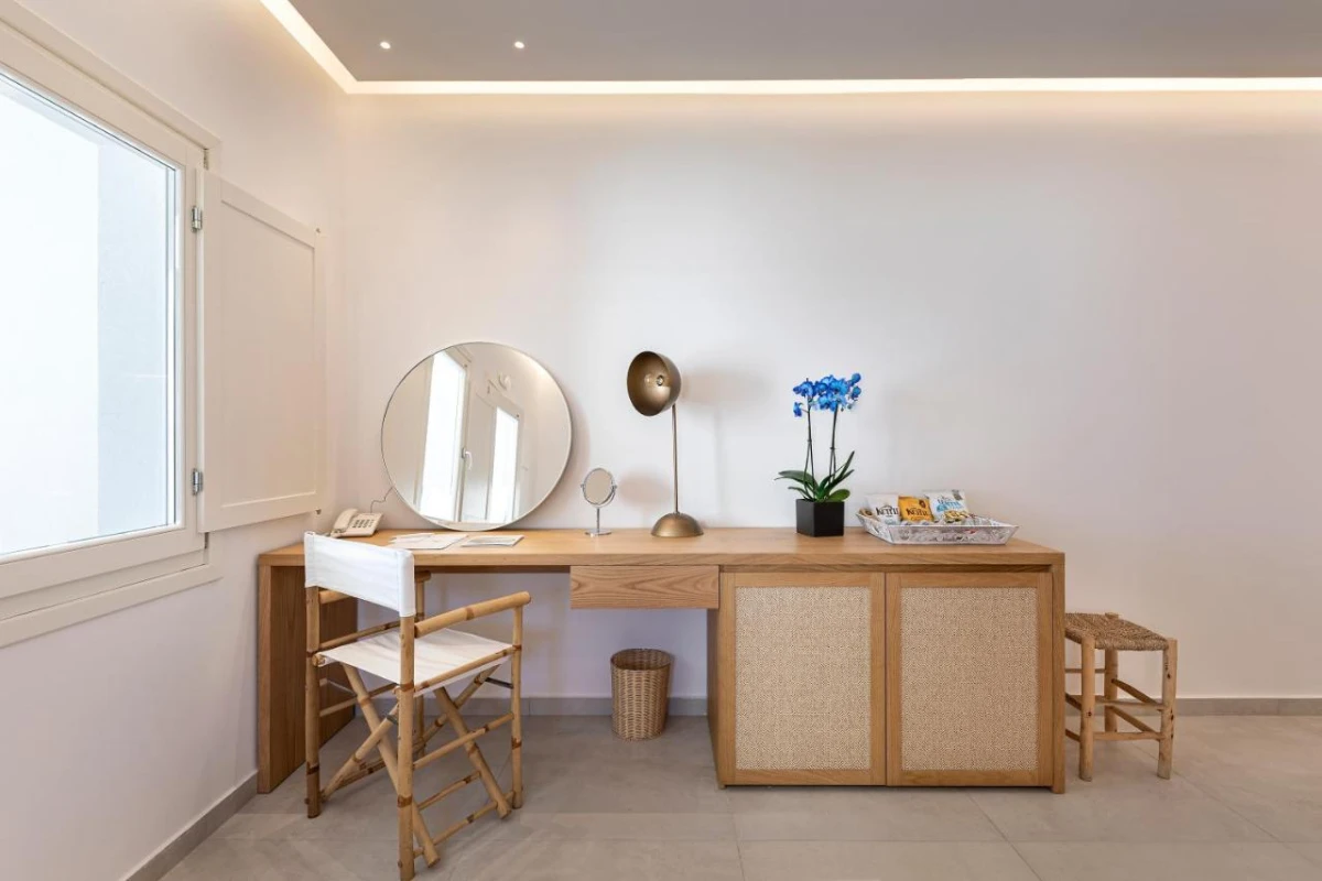 The hotel's air-conditioned rooms and suites feature sleek design with plush bedding, flat-screen TVs, coffee machines, minibars, kettles, wardrobes, and private bathrooms with rain showers, premium toiletries, and bathrobes. Select units include private balconies with captivating mountain or sea vistas, creating an intimate haven for relaxation. The thoughtful design merges Cycladic simplicity with modern comfort, tailored for discerning travellers.