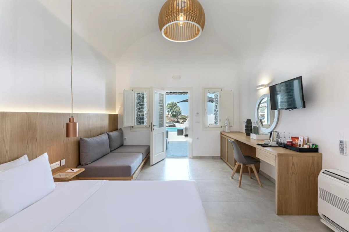 The vibrant on-site restaurant serves refined Mediterranean cuisine, showcasing dishes like fresh seafood with Santorini fava and herb-roasted lamb, crafted from local ingredients and paired with curated Greek wines. A daily à la carte breakfast delights with fresh fruits, island yogurts, and artisanal pastries. The stylish bar crafts artisanal cocktails and light bites, enjoyed on a terrace overlooking the Aegean horizon. A seasonal outdoor pool, seamlessly merging with the sea, invites tranquil lounging, while the 24-hour concierge and tour desk curate bespoke experiences, from sailing adventures to guided tours of Oia's iconic alleys, immersing guests in Santorini's timeless charm.