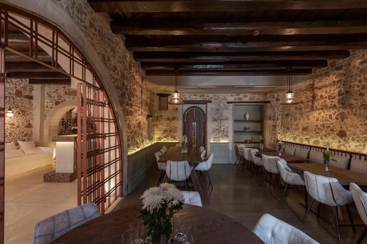 The elegant suites blend historic arched ceilings and traditional furnishings with modern minimalist flair, featuring air-conditioned comfort, plush bedding, flat-screen TVs, sofas, dining areas, and stylish bathrooms with bathtubs, luxury toiletries, bathrobes, and a pillow menu. Each suite opens to a private balcony or terrace with views of the charming Old Town or Cretan Sea, creating a tranquil haven for discerning travellers.