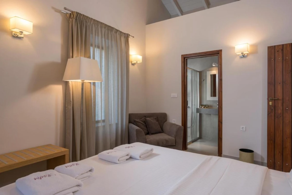 Spanning 4,000 square meters, the 30 uniquely named rooms and suites feature Venetian arches, exposed wooden beams, and contemporary comforts like air-conditioned interiors, flat-screen TVs, and minibars. Private balconies or terraces offer captivating countryside views, while bathrooms include rain showers, premium toiletries, bathrobes, and, in select units, hot tubs or aero-massage bathtubs, creating a tranquil haven for romantic escapes.
