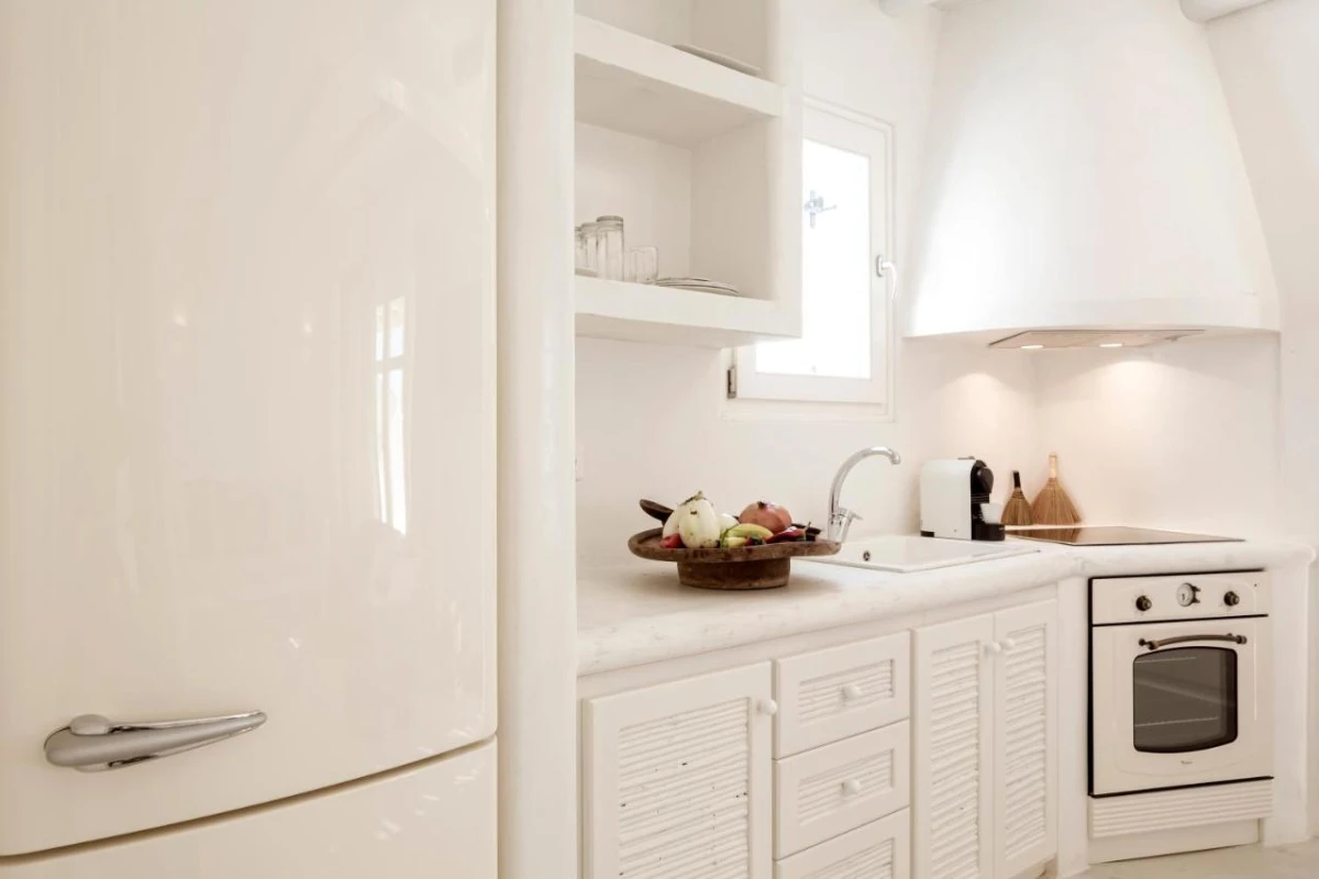 Built in traditional Cycladic style, the elegant villas and suites blend contemporary furnishings with island charm, featuring air-conditioned comfort, flat-screen TVs, fridges, desks, and private bathrooms with rain showers, premium toiletries, and bathrobes. Each opens to a balcony with sea vistas, with some units offering kitchenettes for added convenience, creating a serene sanctuary for relaxation.