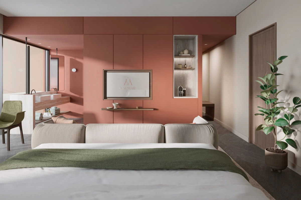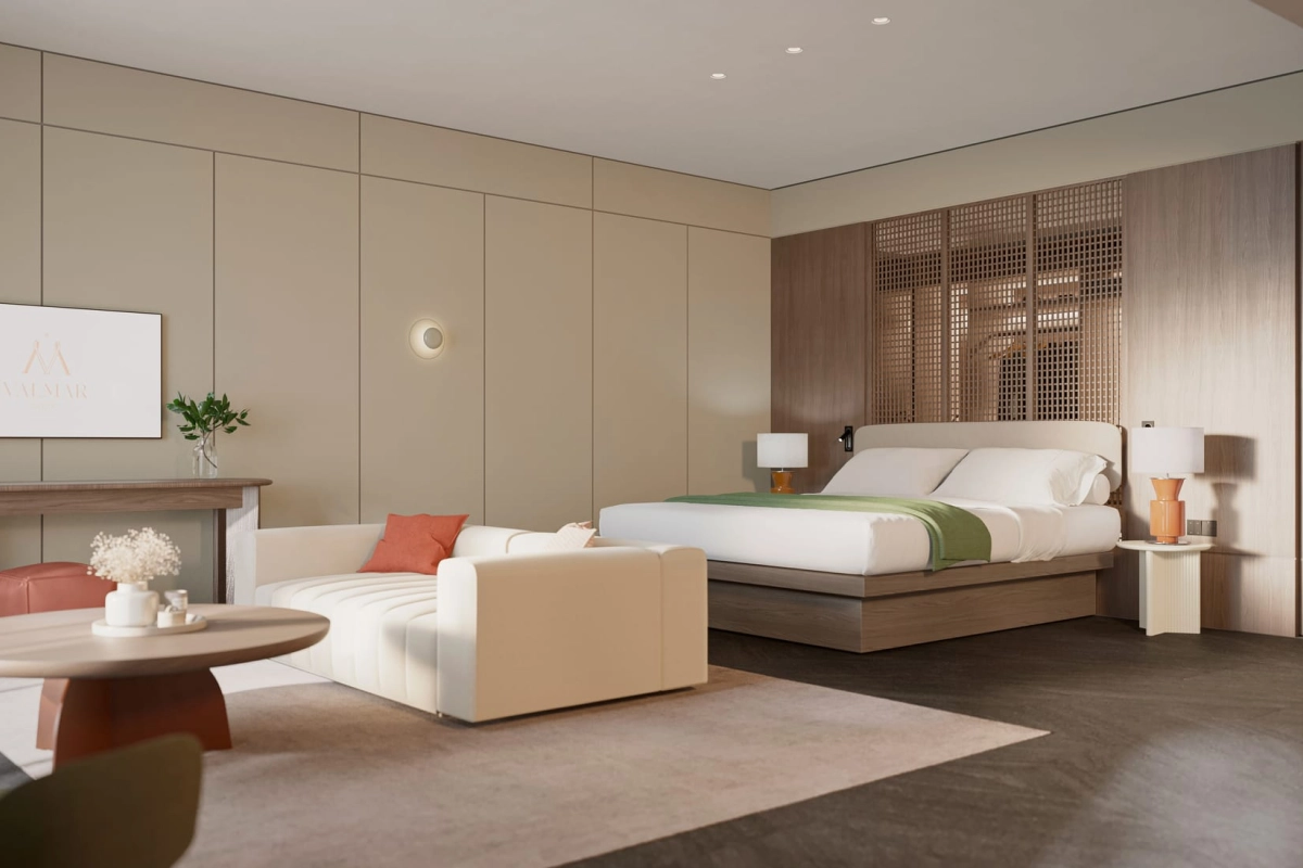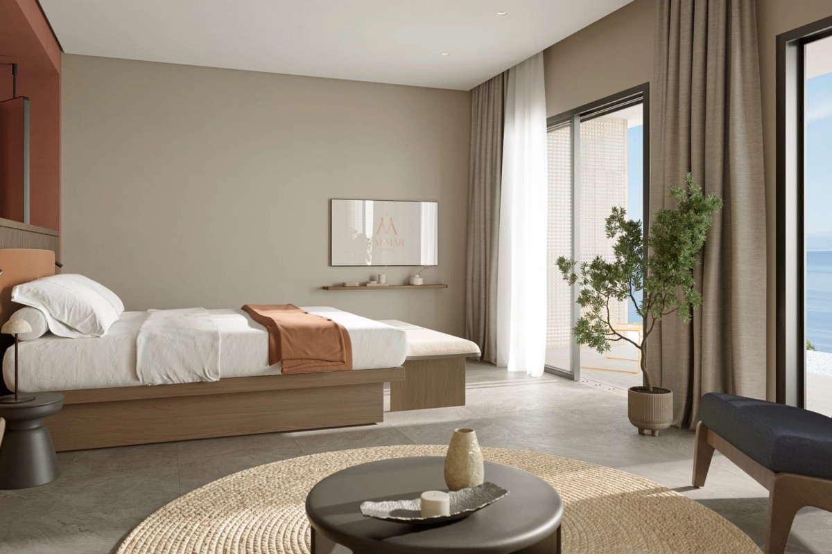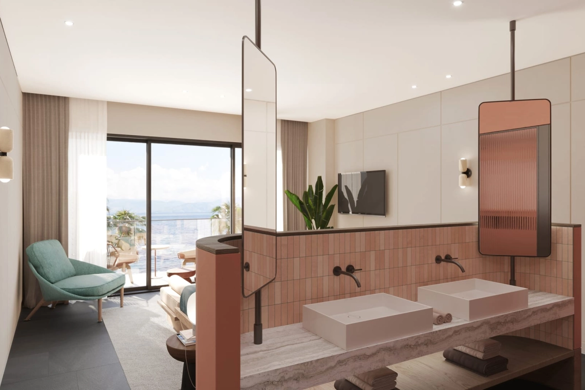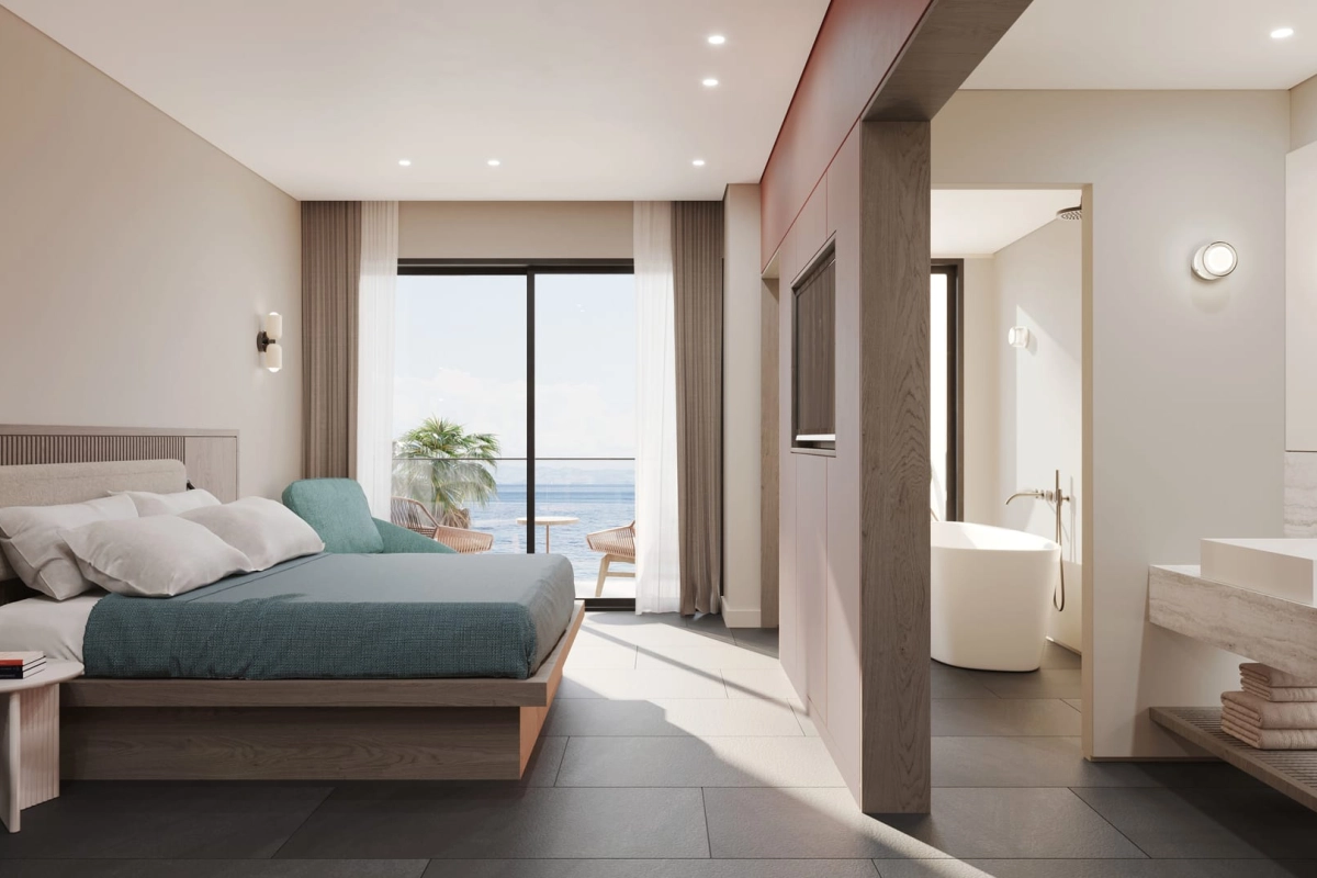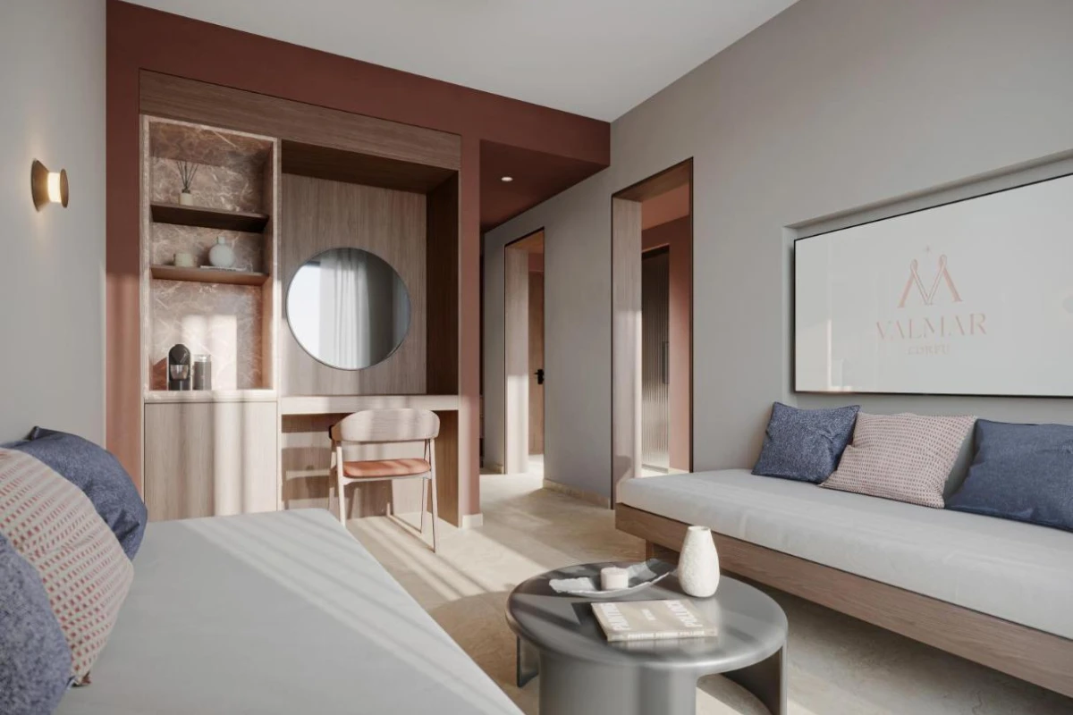 Valmar Corfu, a luxurious five-star retreat in Agios Ioannis Peristeron, Corfu, captivates with its beachfront elegance and breathtaking Ionian Sea views, nestled amidst pine-peaked hills and lush palm and cypress trees.