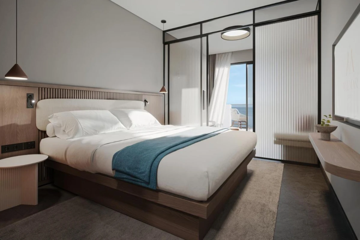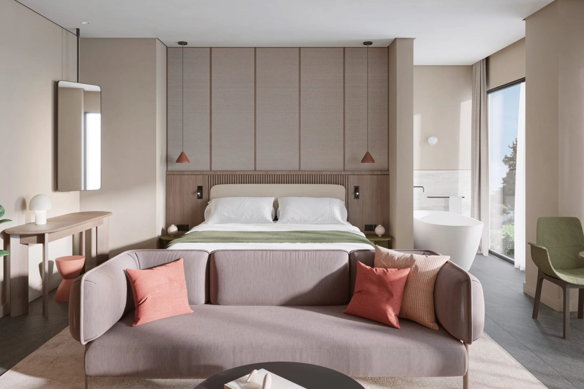 The hotel's elegantly designed rooms and suites blend Venetian-inspired arched colonnades with modern sophistication, featuring air-conditioned comfort, plush bedding, flat-screen TVs, minibars, and private bathrooms with rain showers, premium toiletries, and bathrobes. Select units offer private balconies with stunning sea or garden views, creating a tranquil sanctuary that harmonizes with Corfu's rich, multi-cultural heritage.