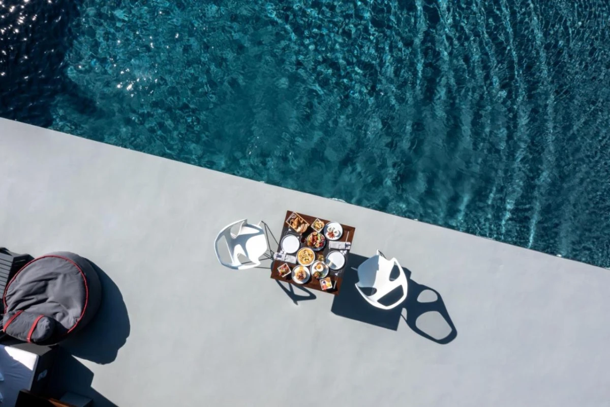 The 16 uniquely designed suites weave together whitewashed walls and black volcanic stone, embodying Santorini's iconic aesthetic. Each opens to a spacious veranda with a private pool or Jacuzzi, framing mesmerizing Aegean Sea views and vibrant sunsets. Inside, air-conditioned elegance meets plush comfort, with cozy seating areas, flat-screen satellite TVs, minibars, and bathrooms adorned with soft bathrobes, slippers, and premium toiletries. Select suites feature hot tubs or hydro-massage jets, inviting guests to unwind in tranquil splendor.